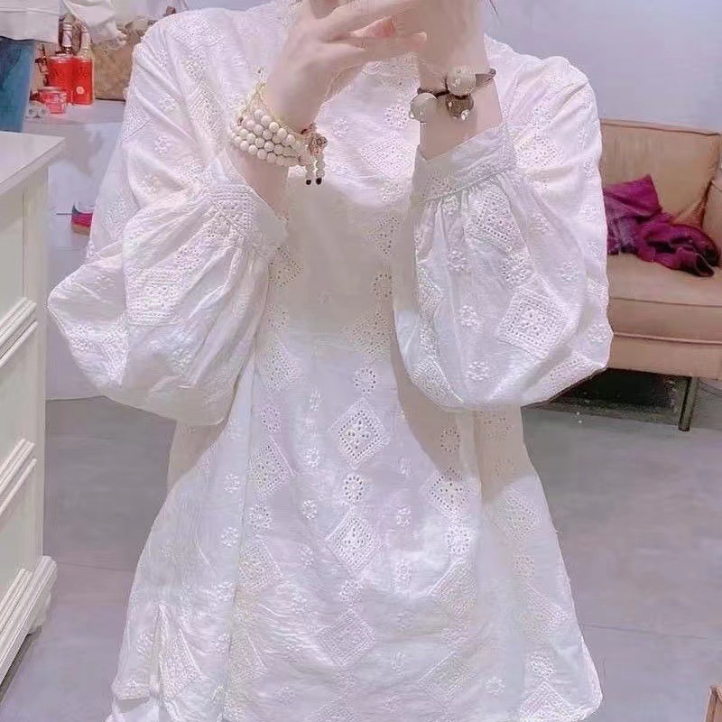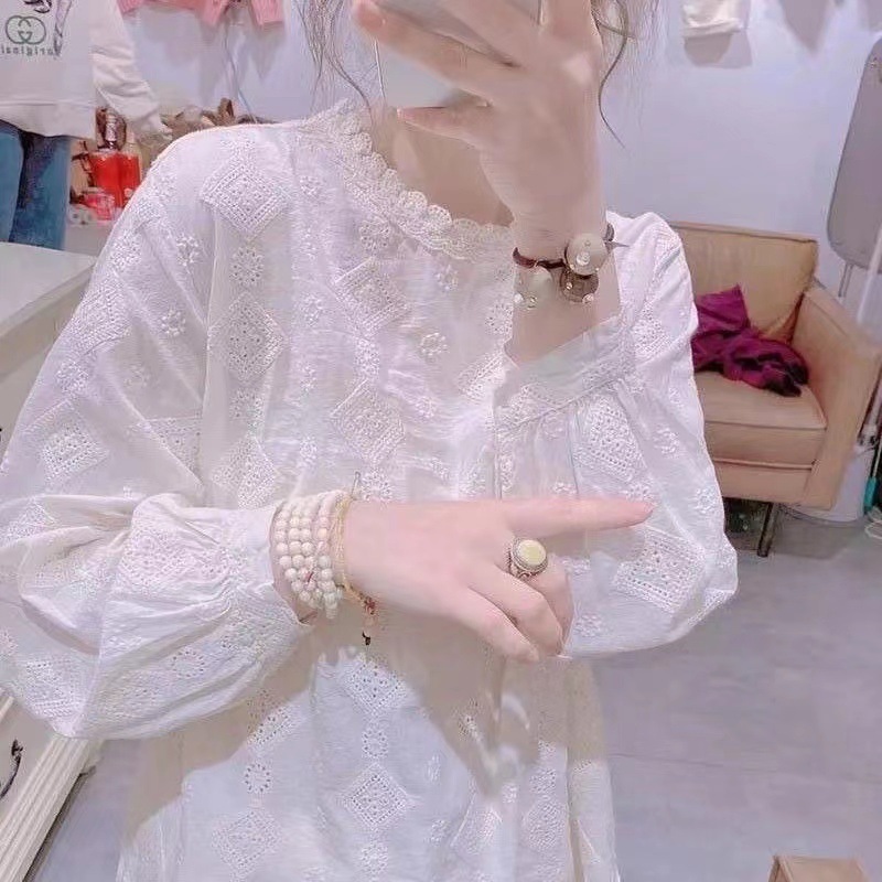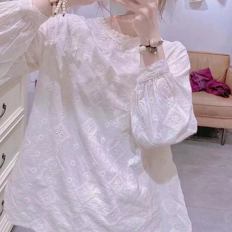 봄 2025 새로운 우아한 레이스 크로 셰 뜨개질 중공 디자인 서양식 시대 감소 긴팔 화이트 셔츠 여성 패션스토어 가기