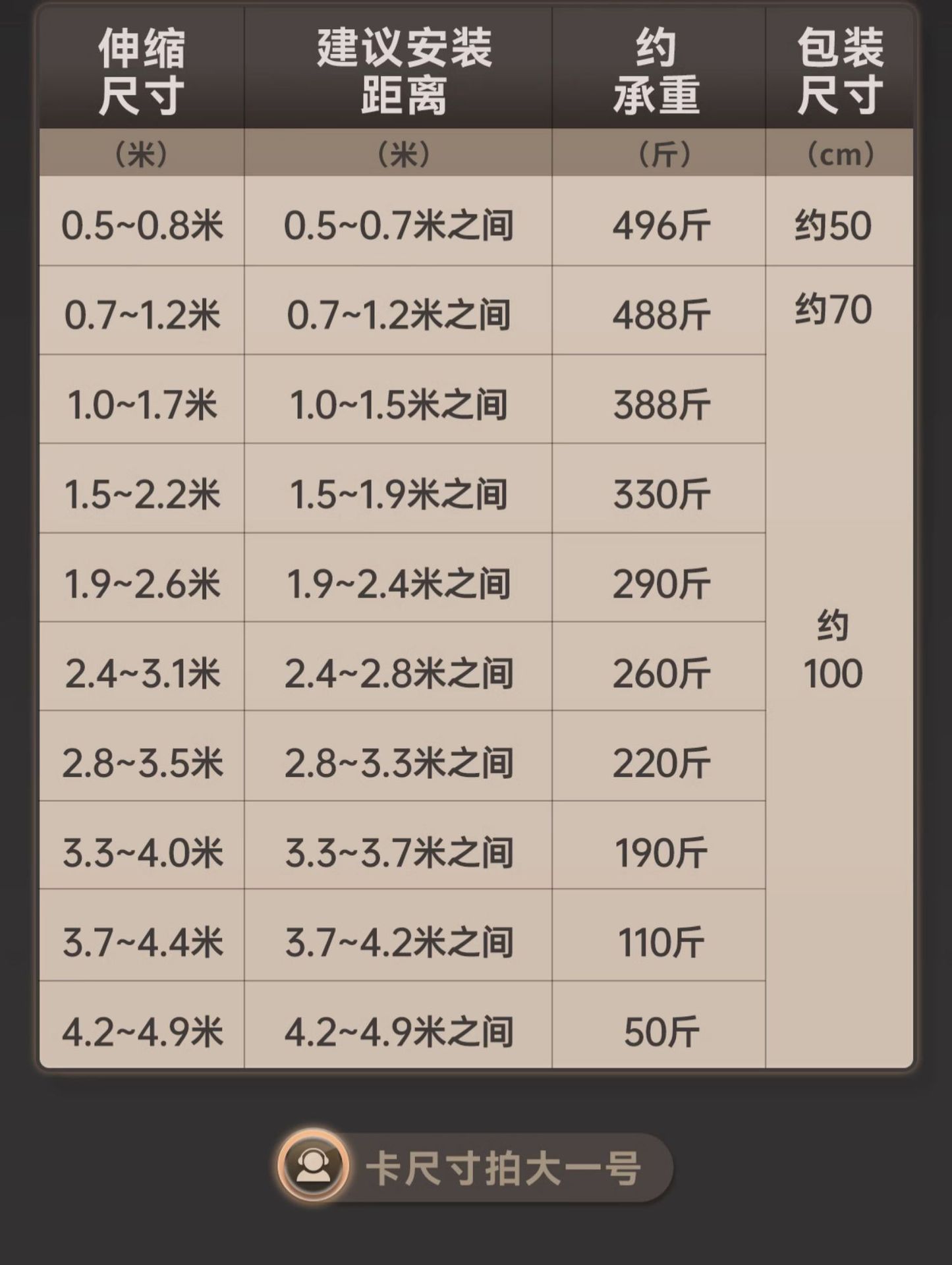 • 원하는 대로 신축 가능 : 1.0m ~ 1.7m 내부 설치 [대략 내하중 194kg ]