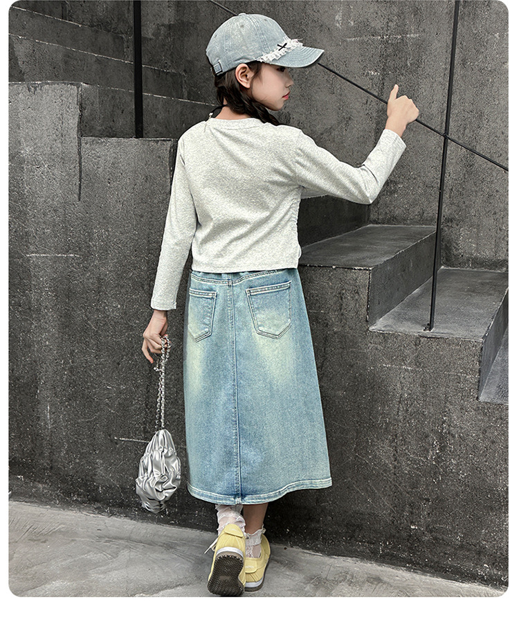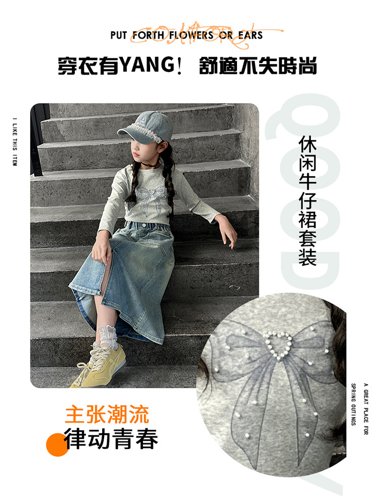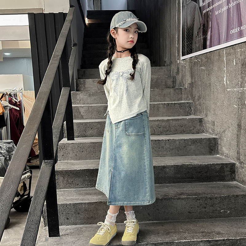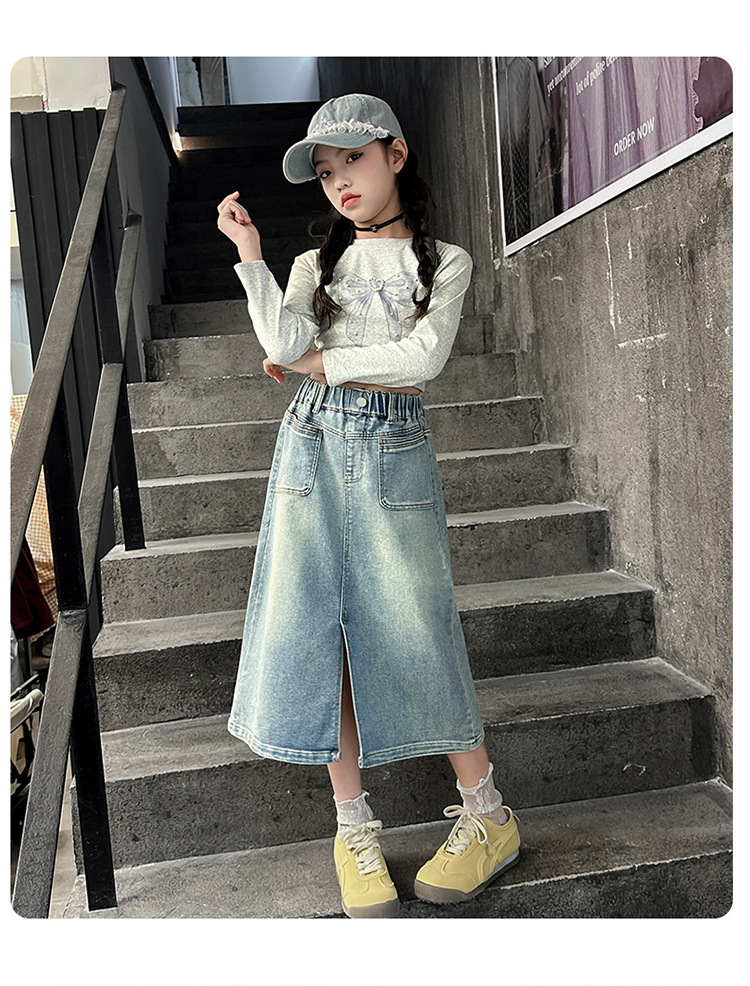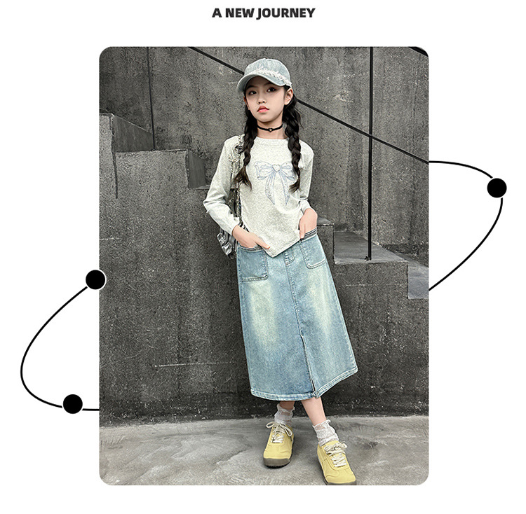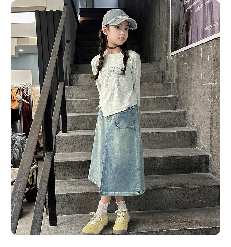 소녀 데님 치마 세트 2025 봄 소녀 활 긴팔 티셔츠 어린이 스플릿 스커트 투피스 세트스토어 가기