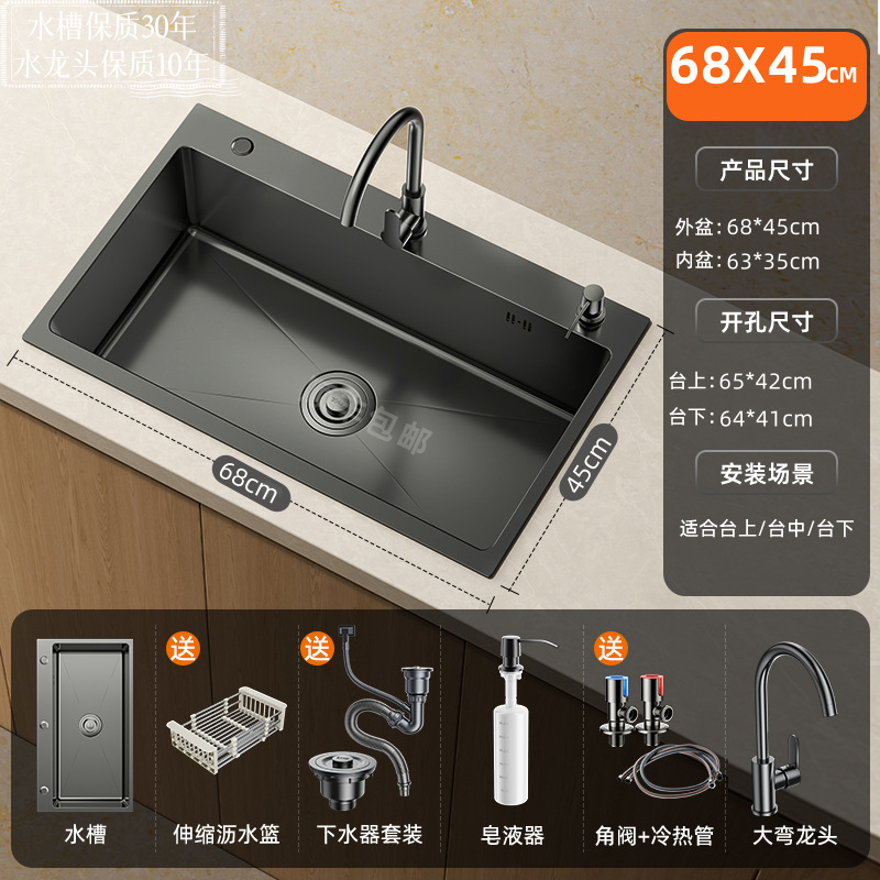 • 기본 패키지 (싱크대 + 배수구 + 배수 바구니) SF Express - 블랙 킹콩 - 항균 및 내마모성 [길이 68 폭 45] SF 홈