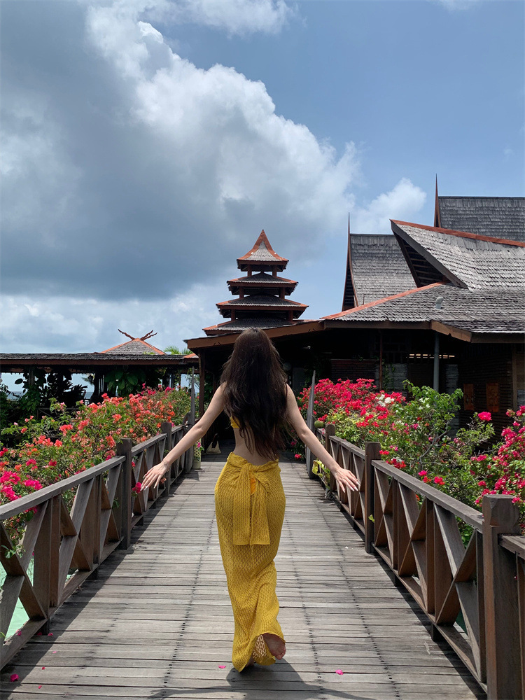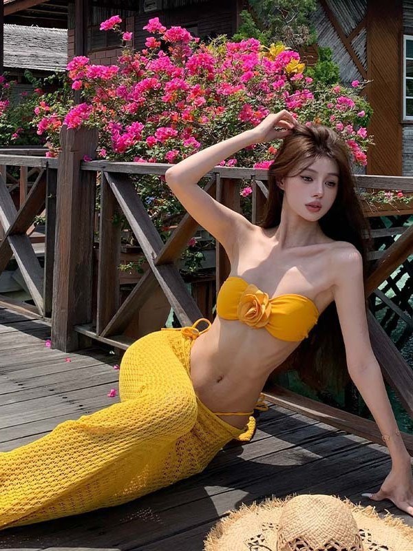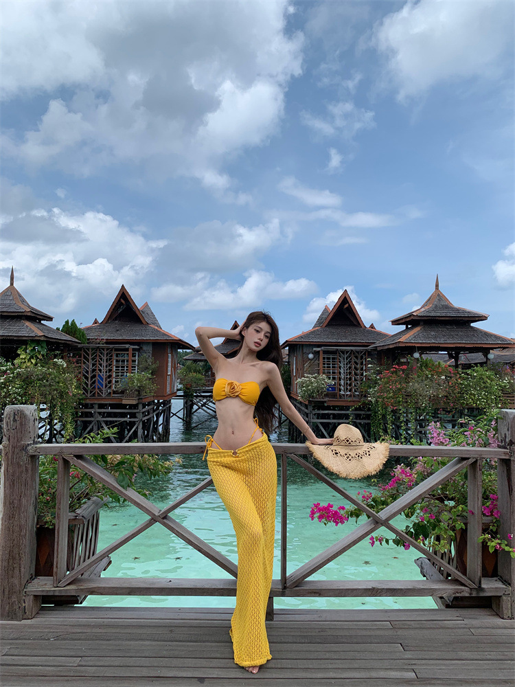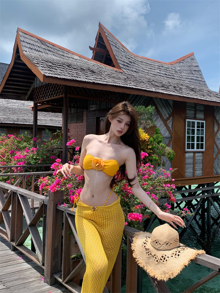 생강 노란 꽃 끈이없는 분할 수영복 여성 봄 뜨거운 소녀 비키니 긴 원피스 블라우스 섬 휴가 3 피스 세트