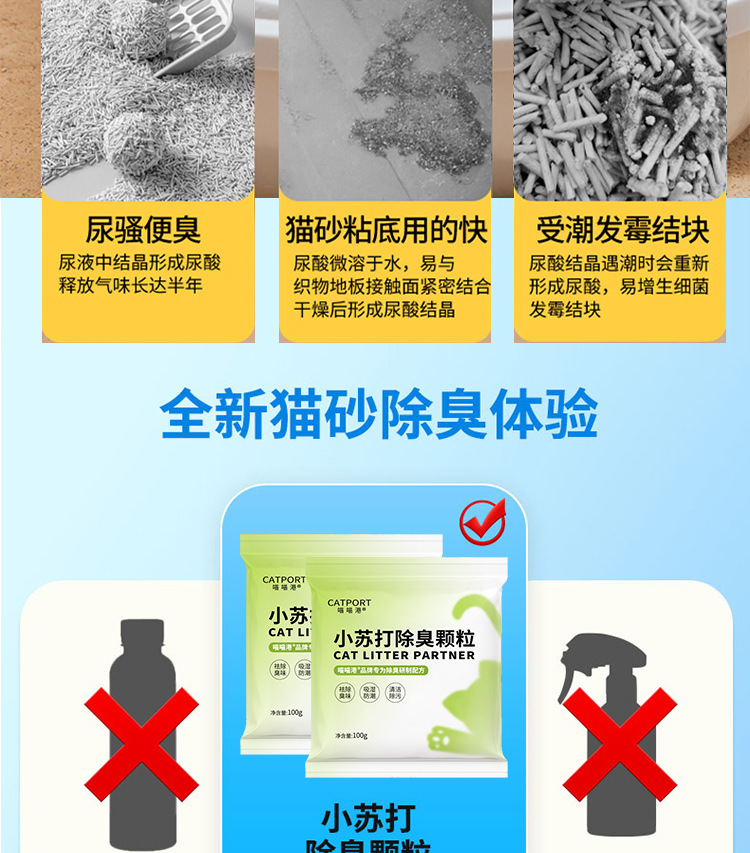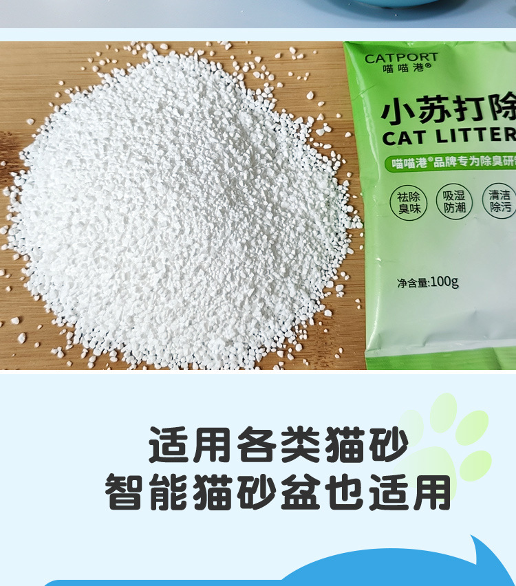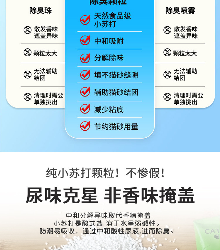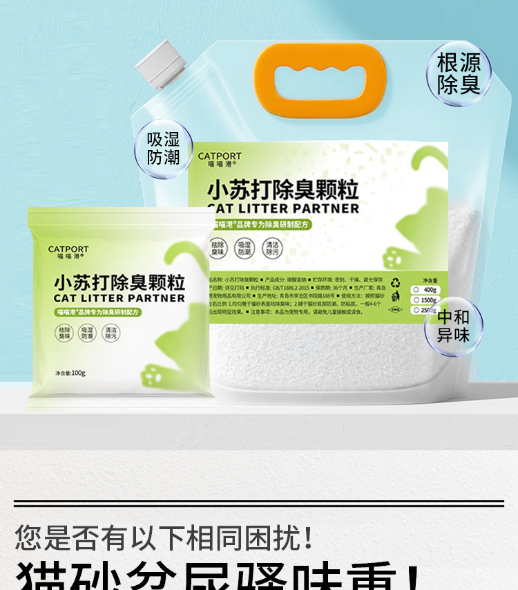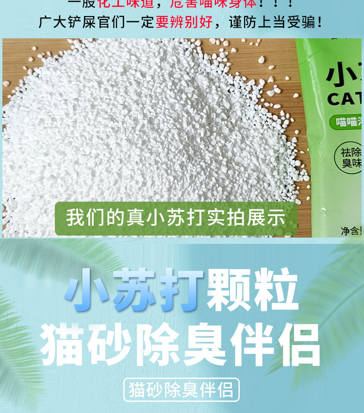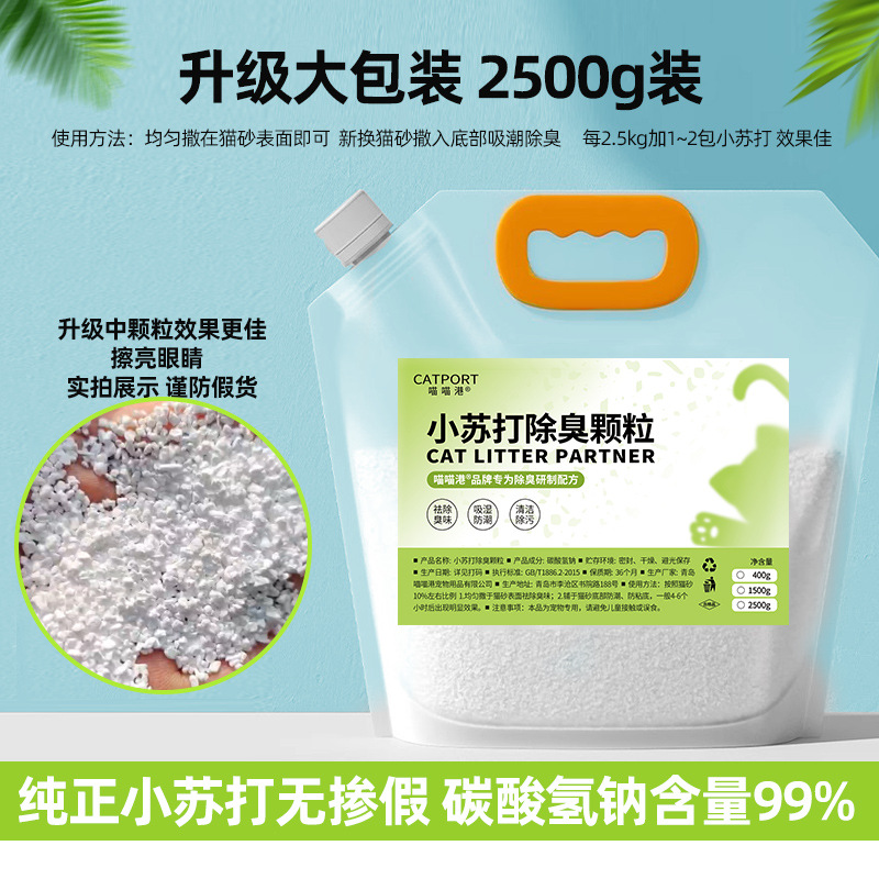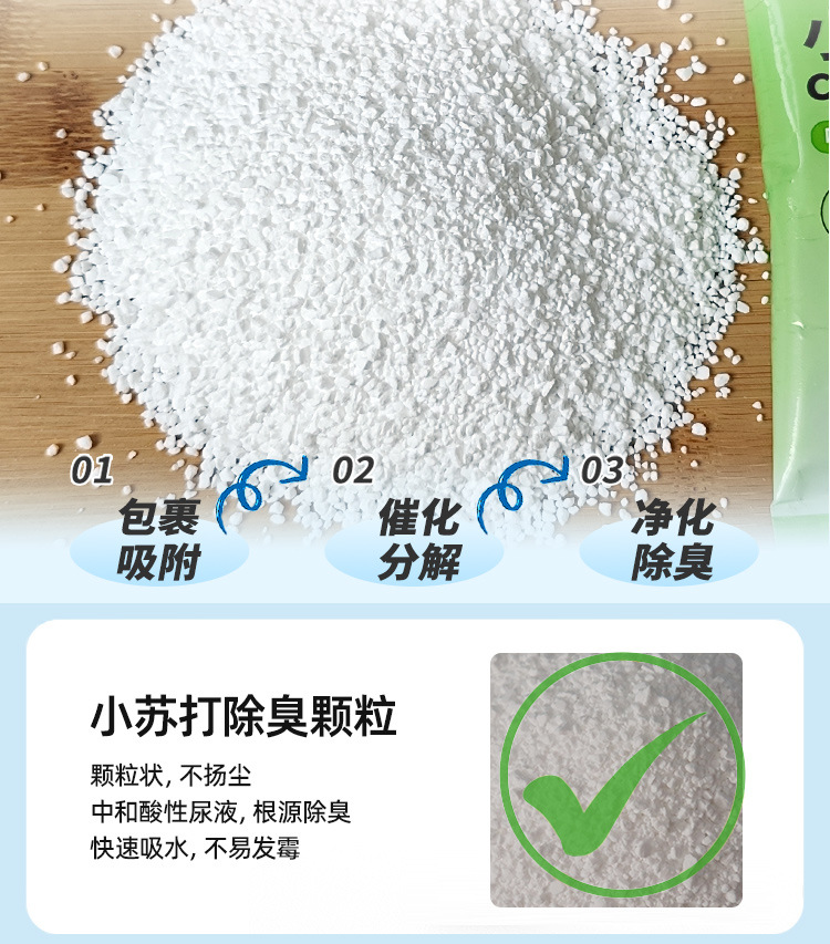 喵喵港小苏打除臭颗粒采用专利配方和特殊工艺制作而成,碳酸氢钠纯度达到99%,除氨率95.6%,能有效去除猫尿骚味,粪便味,效果持久,无毒无害,源头厂家直销,可批发和小批量定制,详细联系客服。千万不要贪小便宜买了假货,不紧没效果,还有毒有害,对猫咪和主人健康都不利。