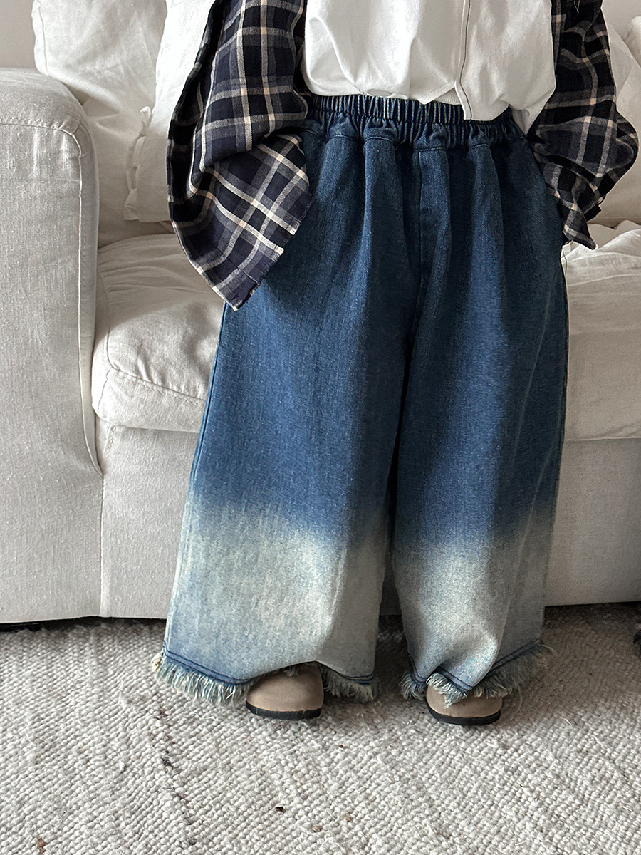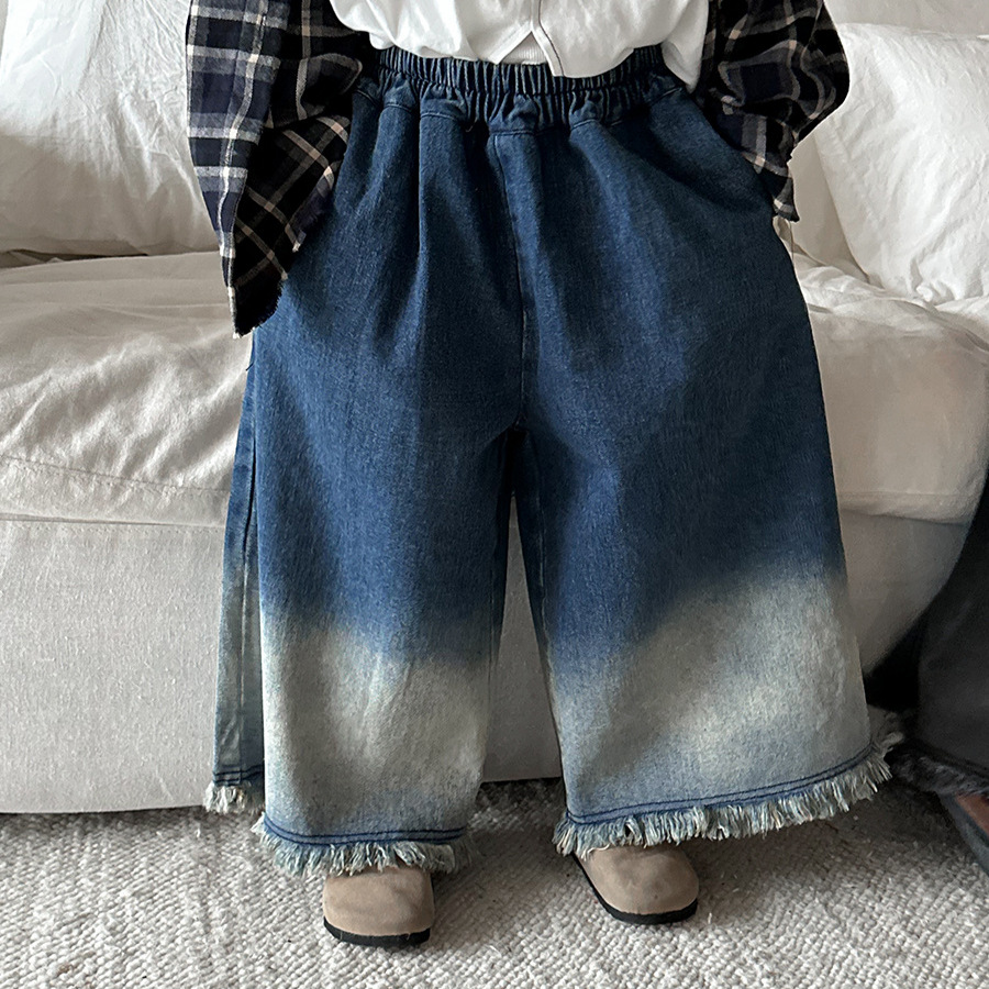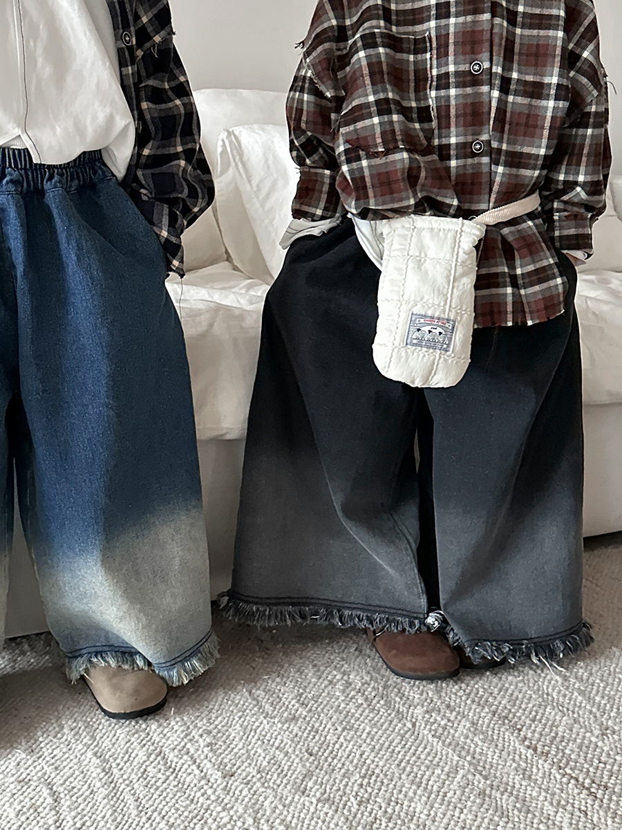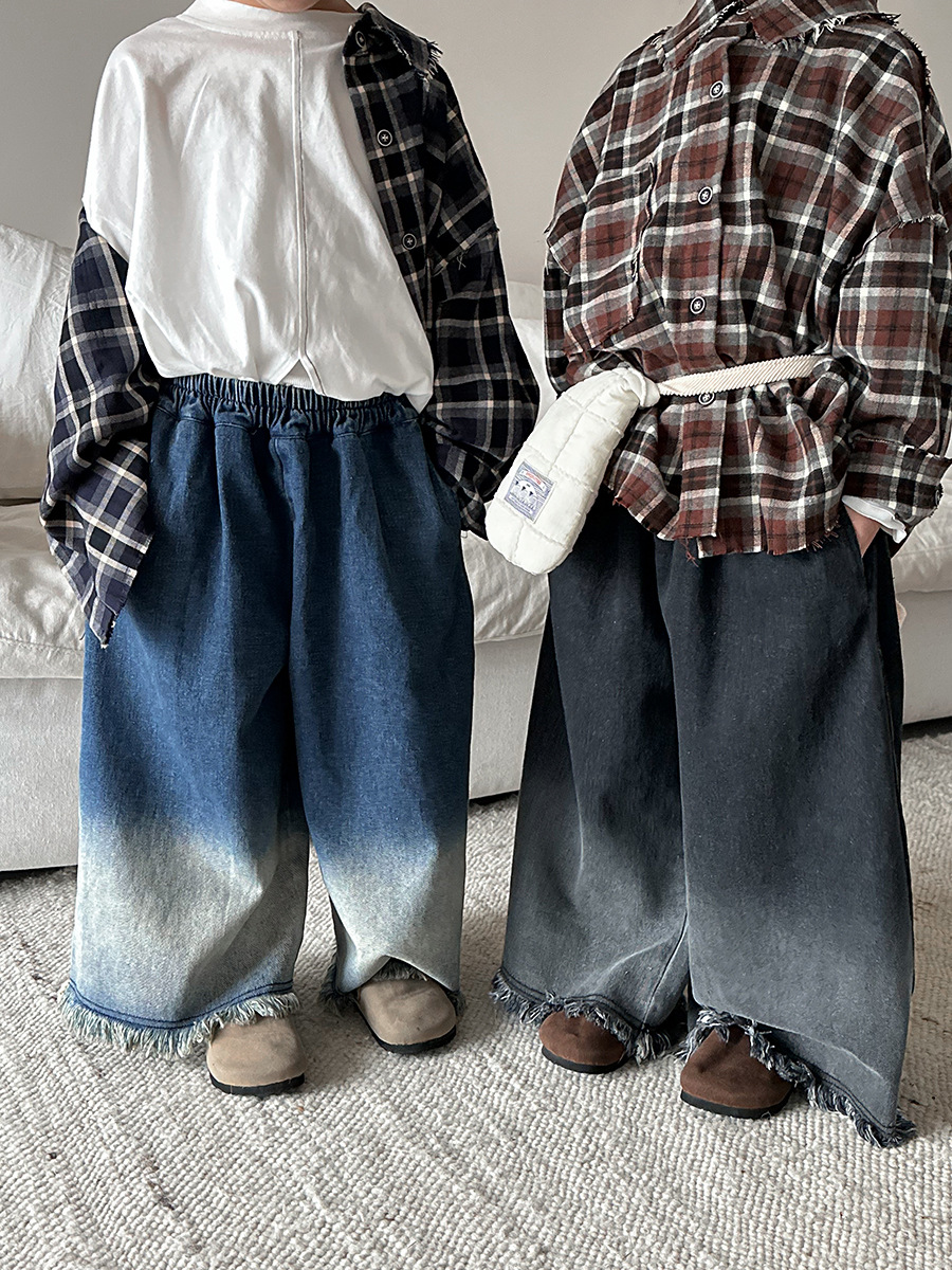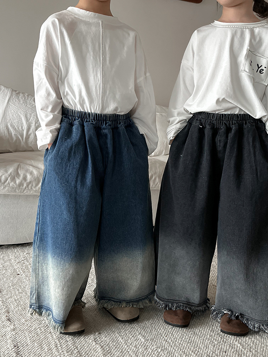 Jiaye Children's Products 2025 어린이 가을 새로운 스타일 남성과 여성을 위한 흰색 올드 청바지 베이비 로우 엣지 플레어 스트레이트 팬츠스토어 가기