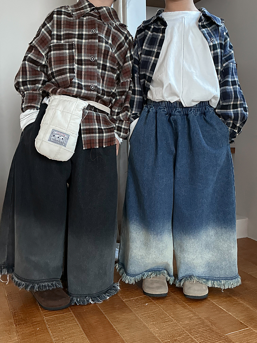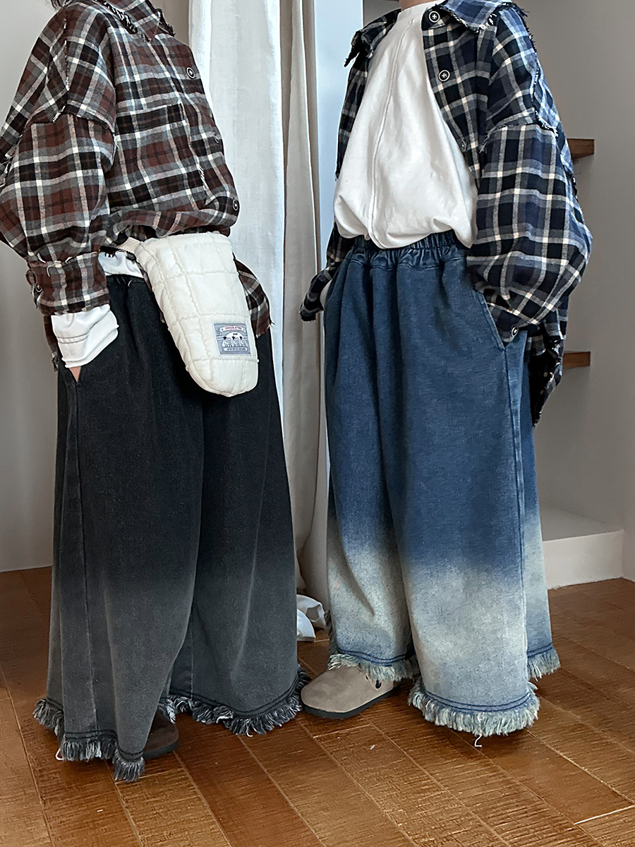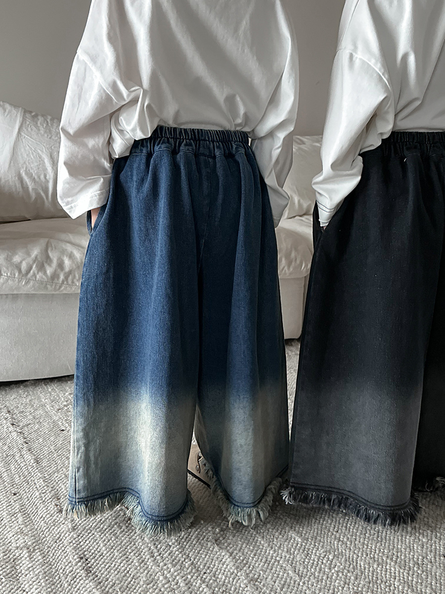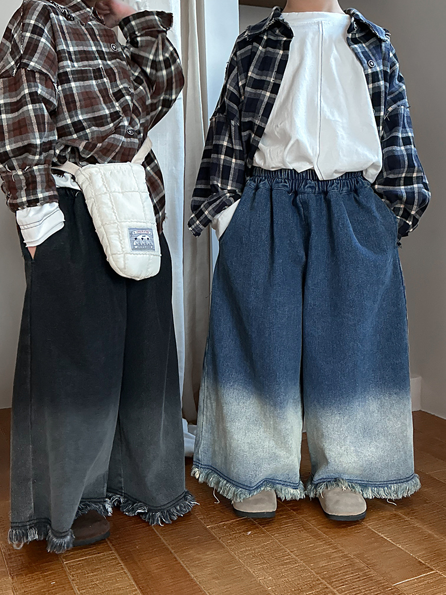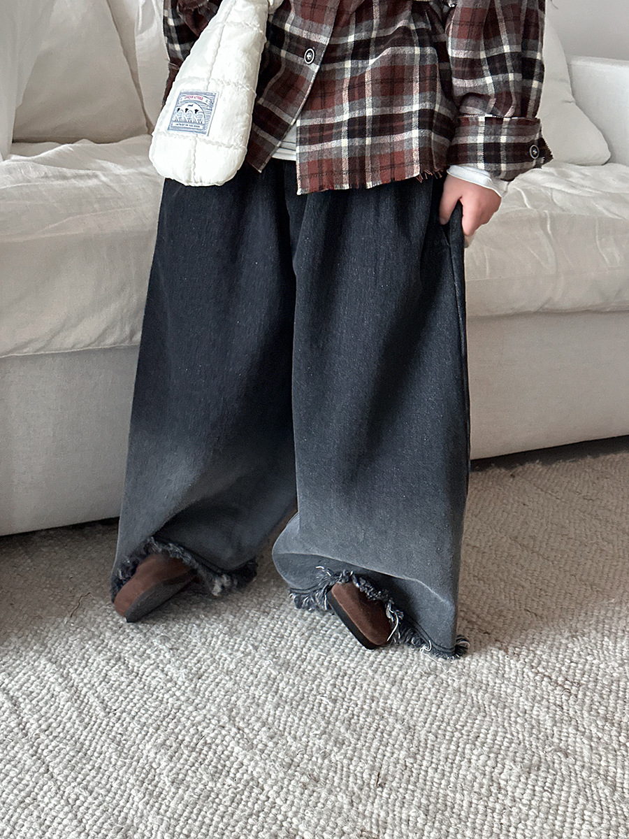 Jiaye Children's Products 2025 어린이 가을 새로운 스타일 남성과 여성을 위한 흰색 올드 청바지 베이비 로우 엣지 플레어 스트레이트 팬츠스토어 가기