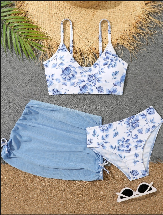 아마존 새로운 국경 유럽 및 미국 소녀 인쇄 수영복 어린이 해변 온천 비키니 세트 플러스 랩 원피스