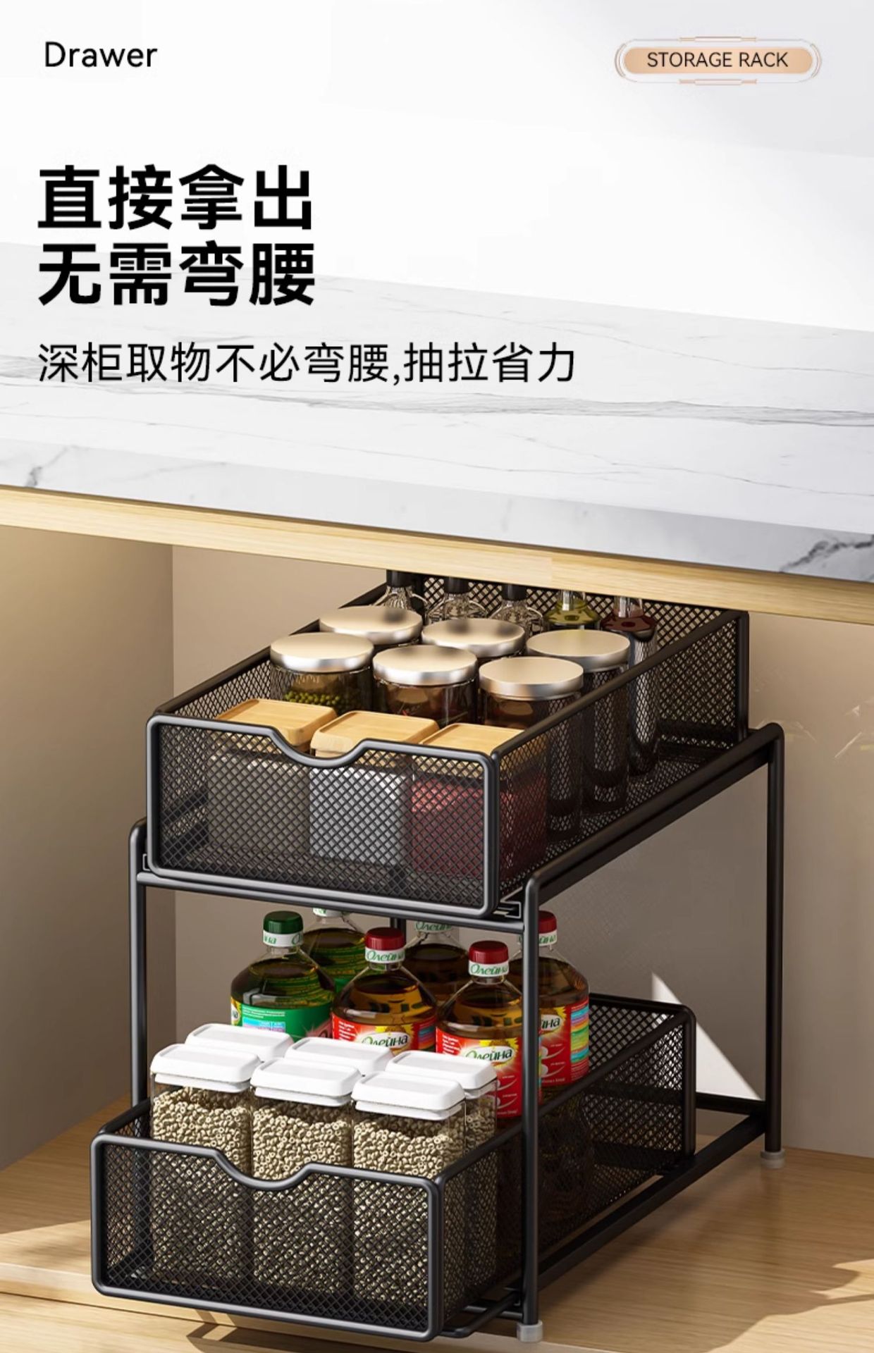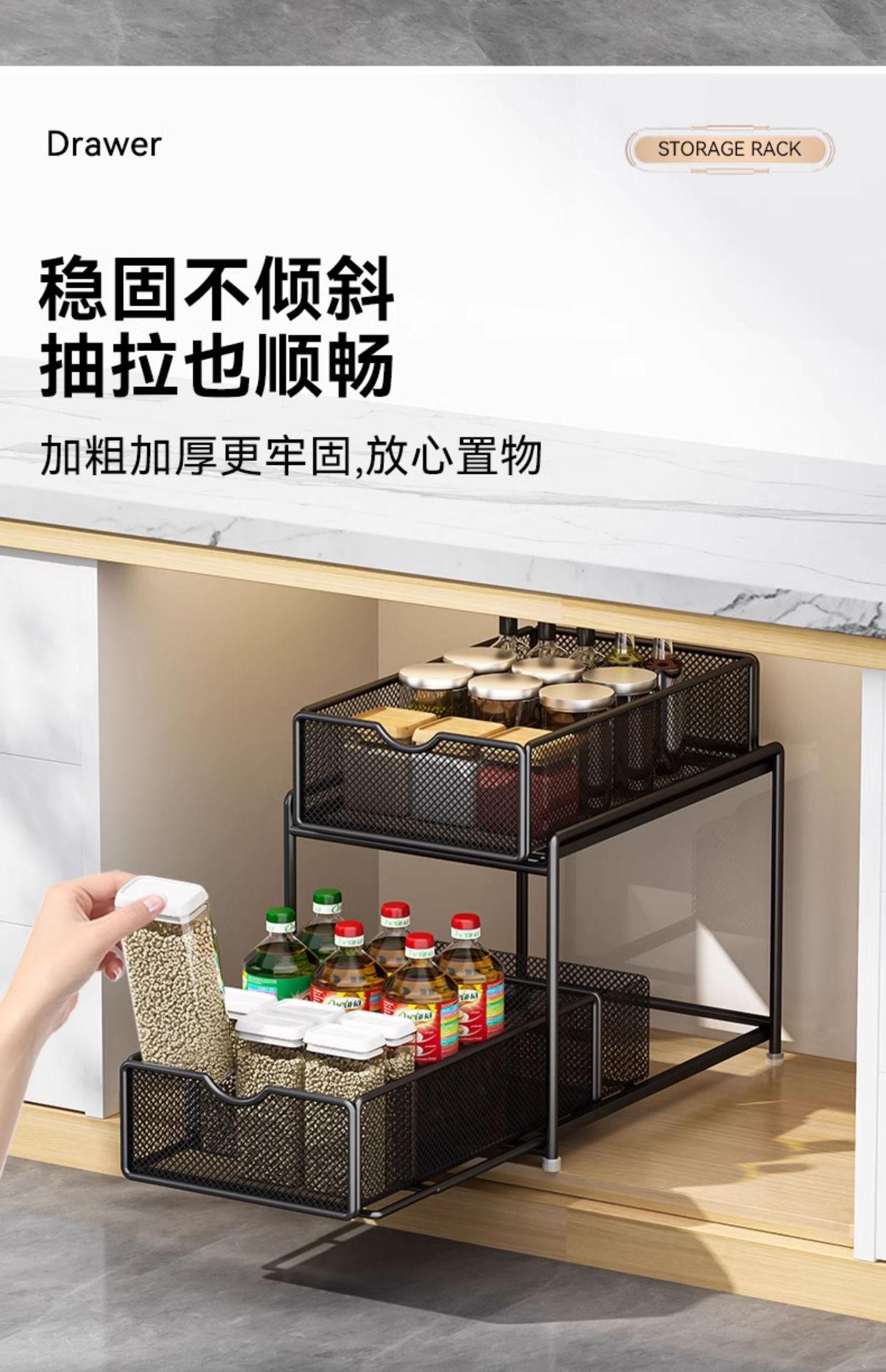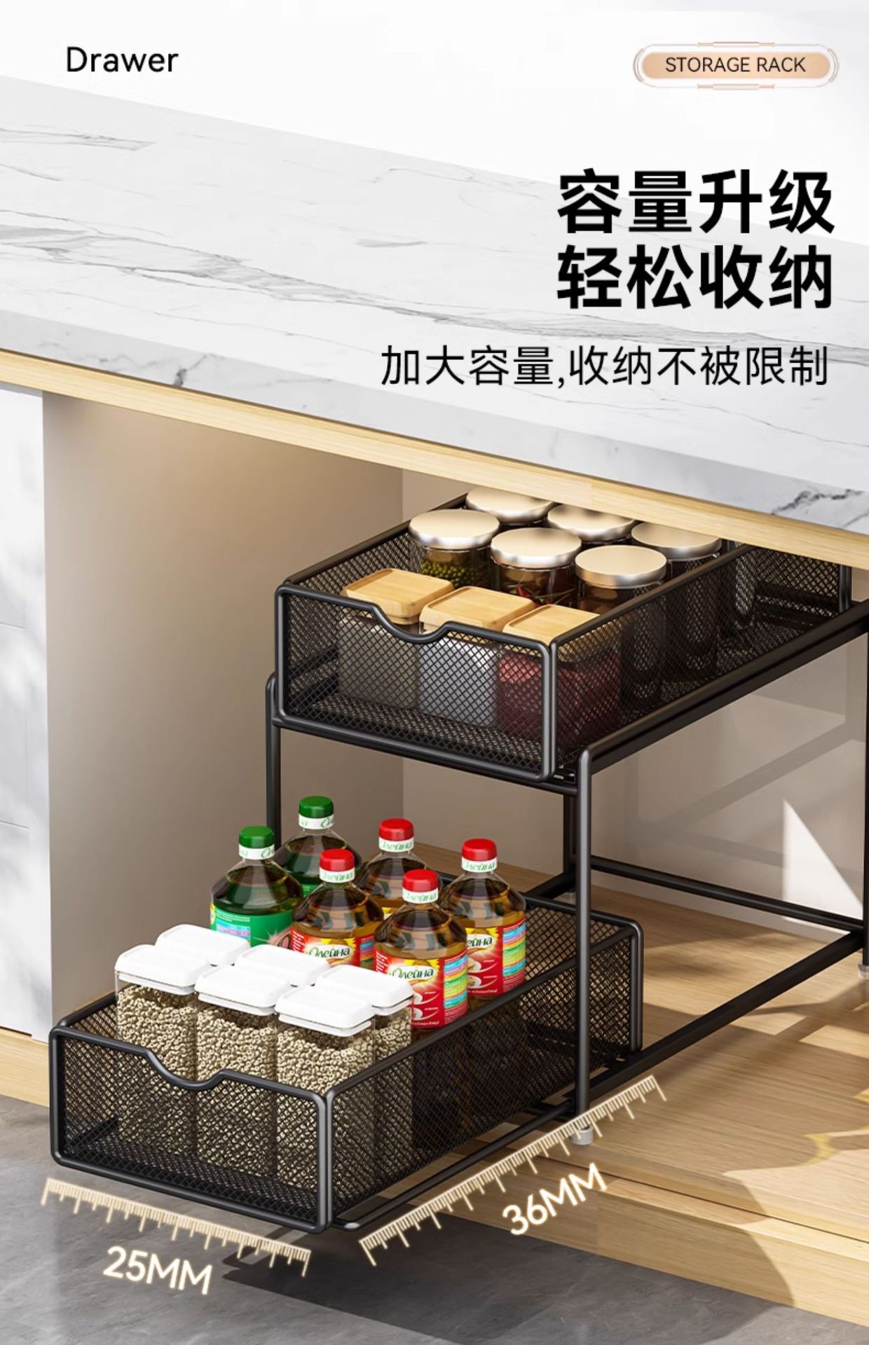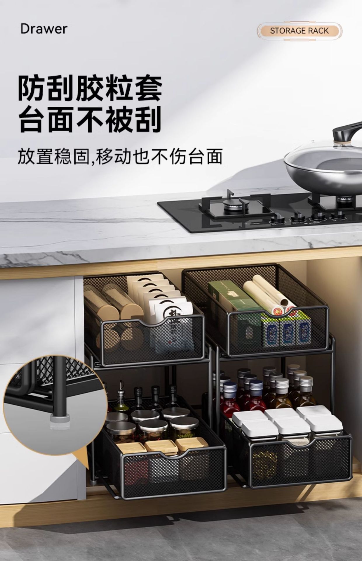 주방 풀아웃 스토리지 랙 캐비닛 계층화 된 선반 더블 레이어 하단 싱크 초딥 서랍 바구니 저장 아티팩트스토어 가기
