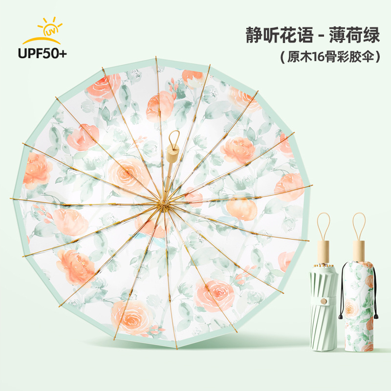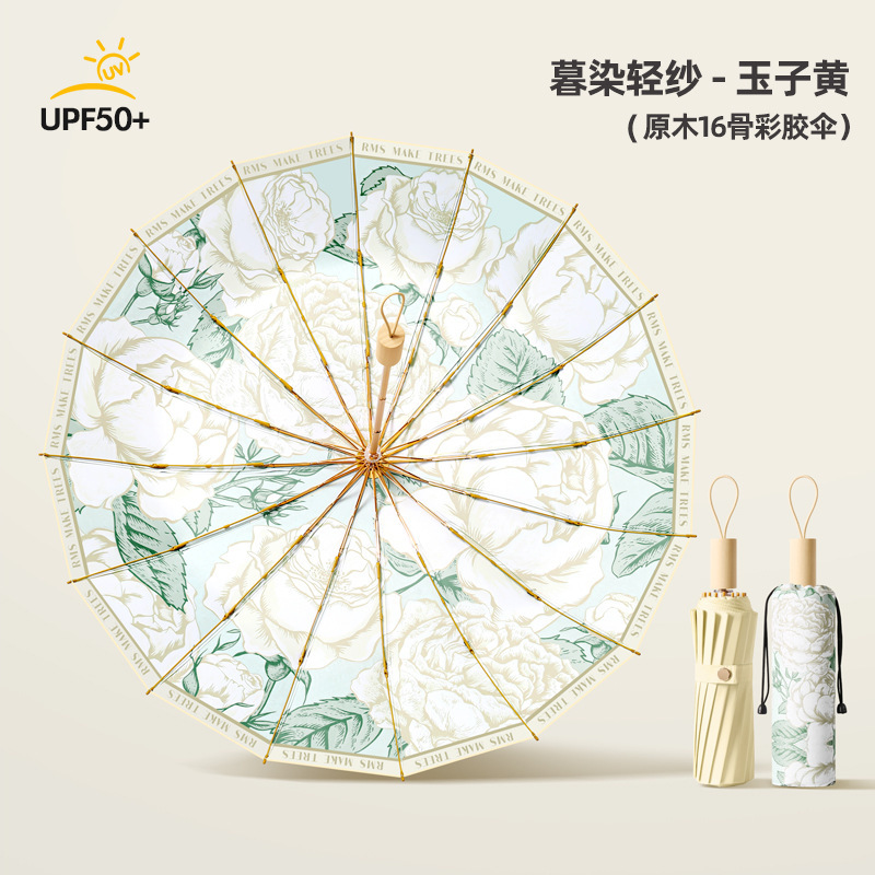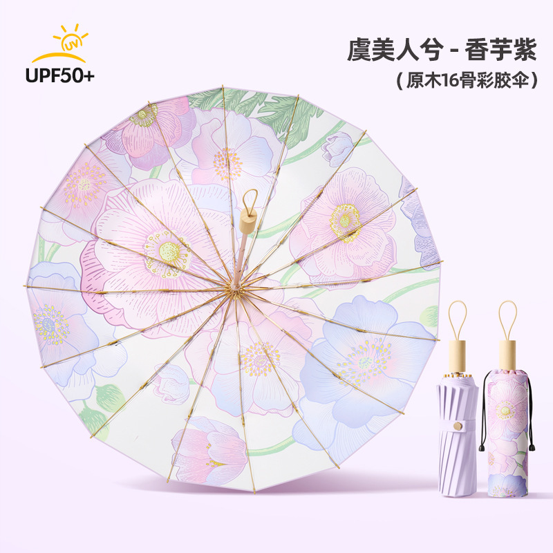 3 배 16 골 솔리드 우드 컬러 접착제 우산 완전 자동 이중 사용 선 스크린 및 자외선 방지 접이식 여성 태양 우산