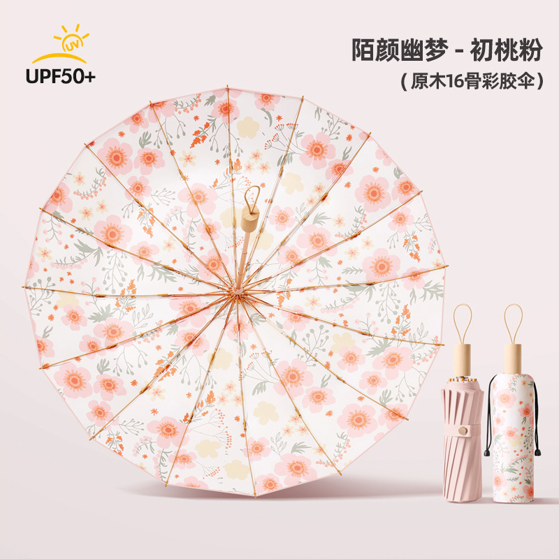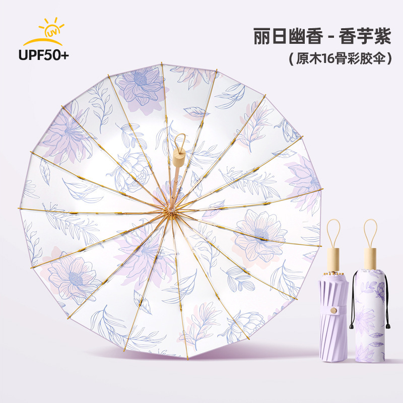 3 배 16 골 솔리드 우드 컬러 접착제 우산 완전 자동 이중 사용 선 스크린 및 자외선 방지 접이식 여성 태양 우산스토어 가기
