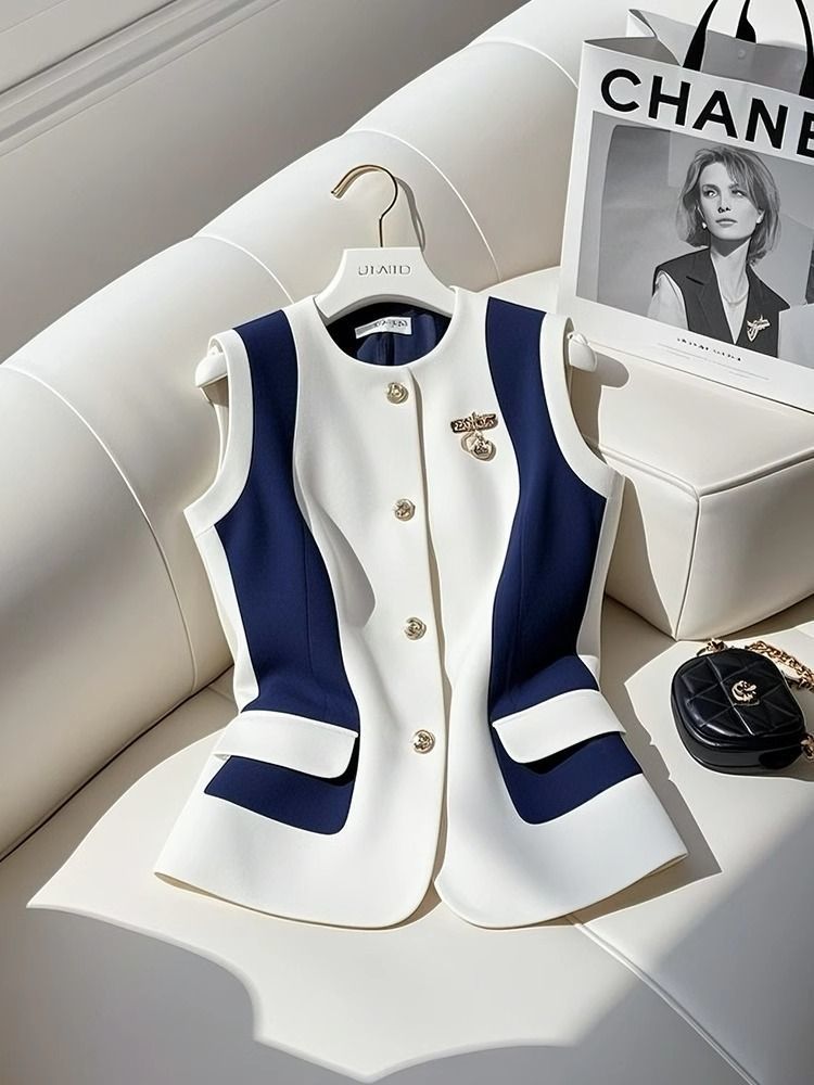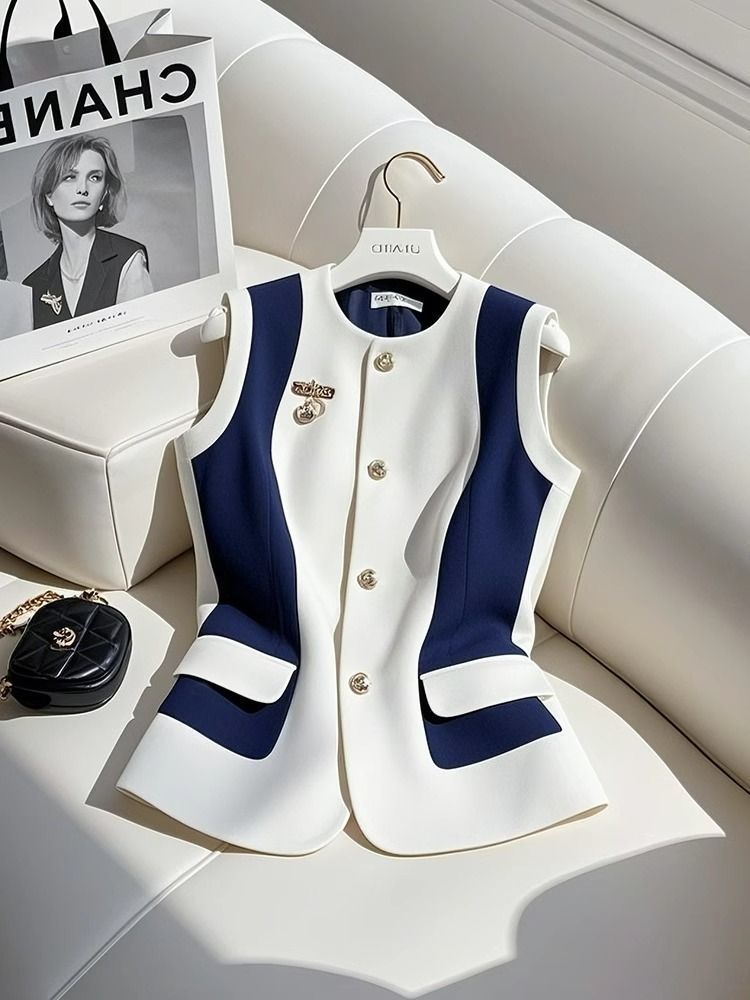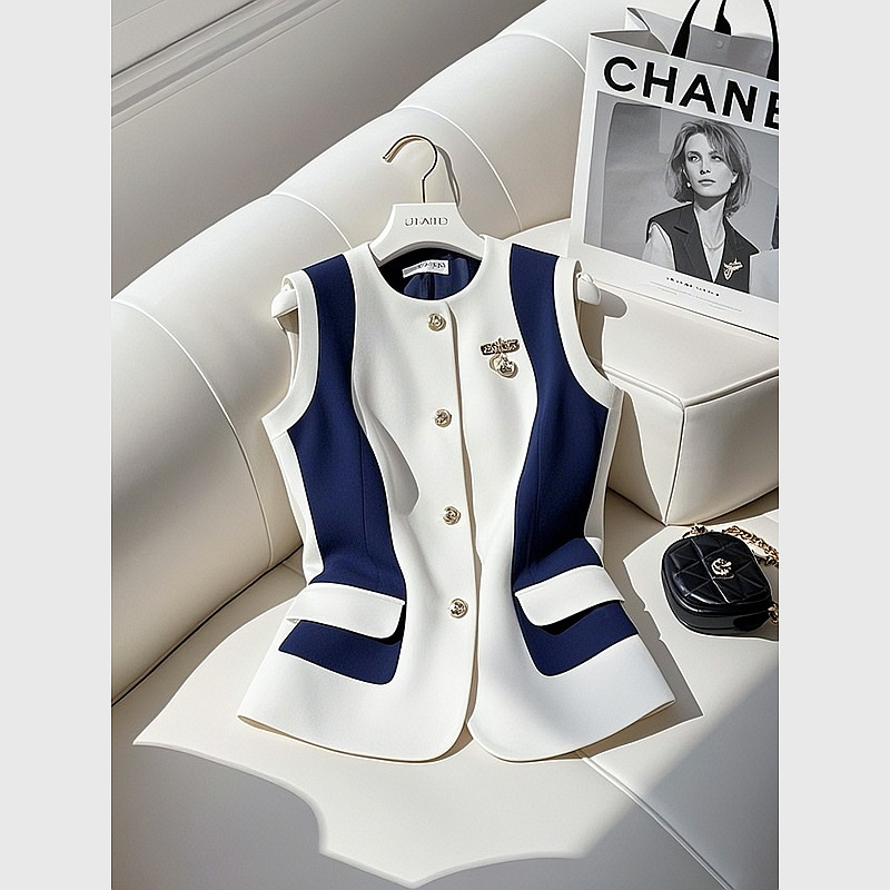 Xiao Xiang Feng Vest 새로운 2025 폭발성 아우터웨어 인기있는 독특한 슈퍼 잘 생긴 우아한 파란색과 흰색 대비 컬러 조끼 봄