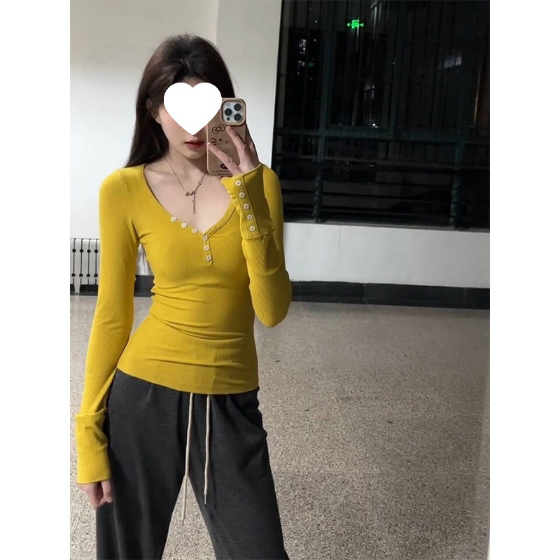 순수한 섹시한 낮은 V 넥 긴팔 티셔츠 여성의 가을과 겨울 디자인 센스 니치베이스 셔츠 컬렉션 새로운 스타일스토어 가기