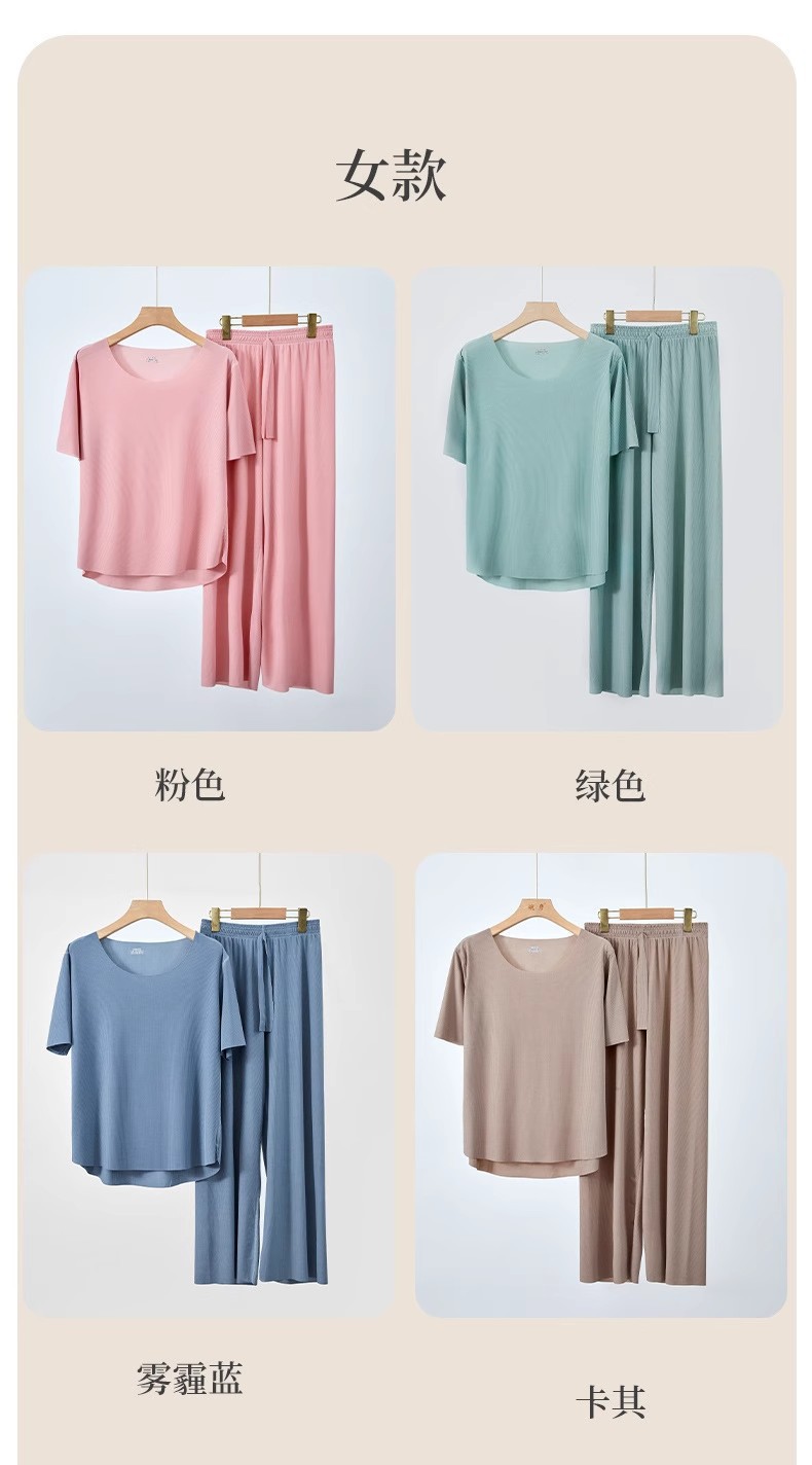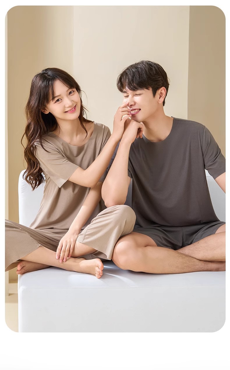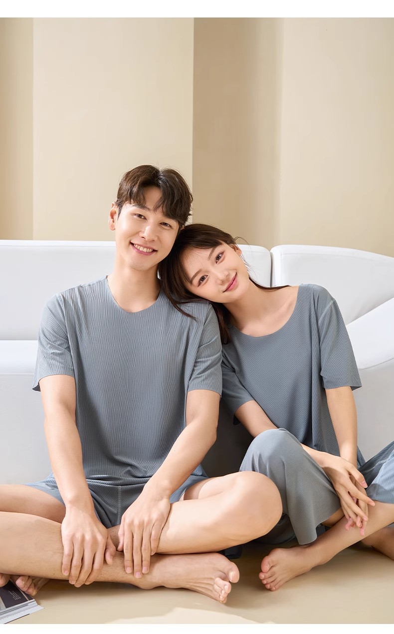 커플 얼음 실크 가정 의류 여름 여성 라운드 넥 반팔 바지 정장 남성 반바지 원활한 얼음 실크 잠옷