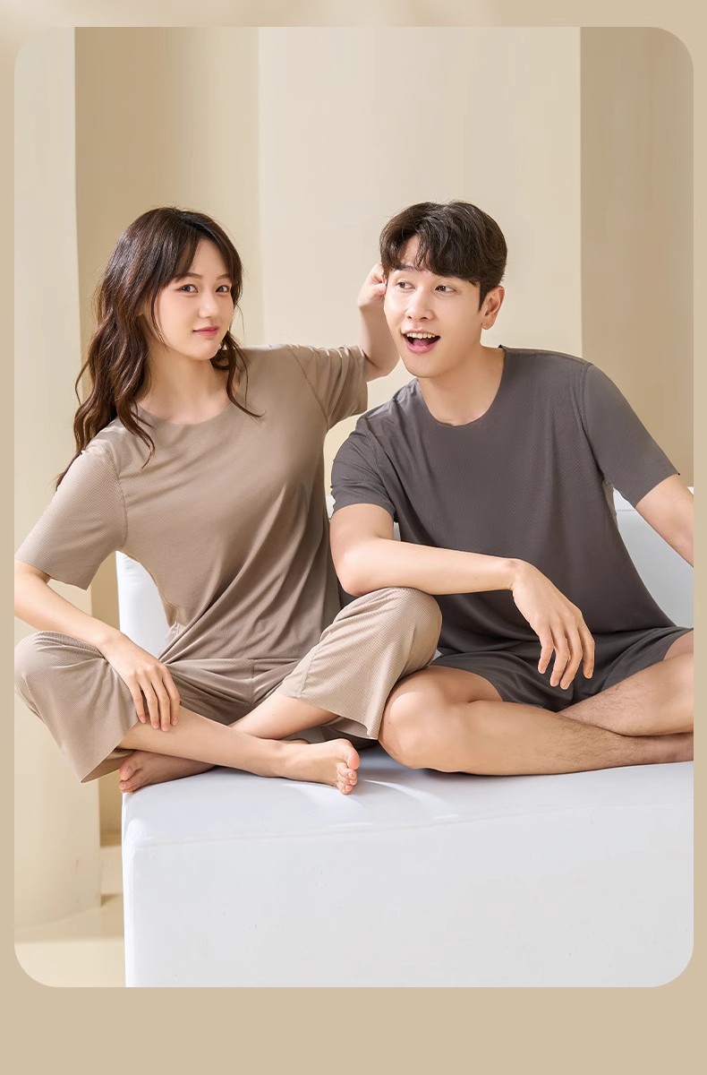 커플 얼음 실크 가정 의류 여름 여성 라운드 넥 반팔 바지 정장 남성 반바지 원활한 얼음 실크 잠옷스토어 가기
