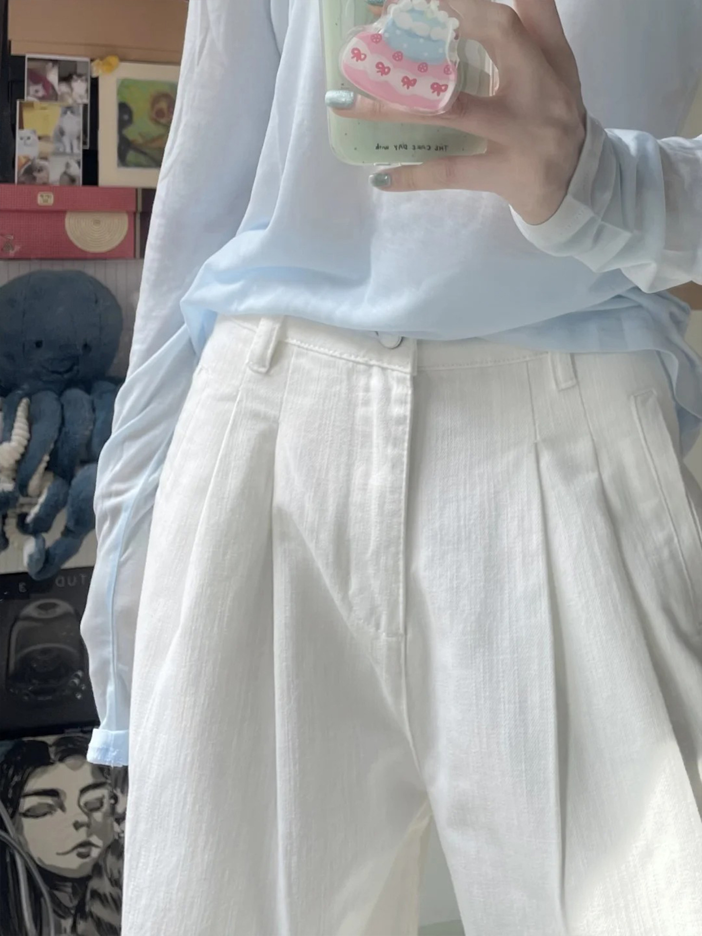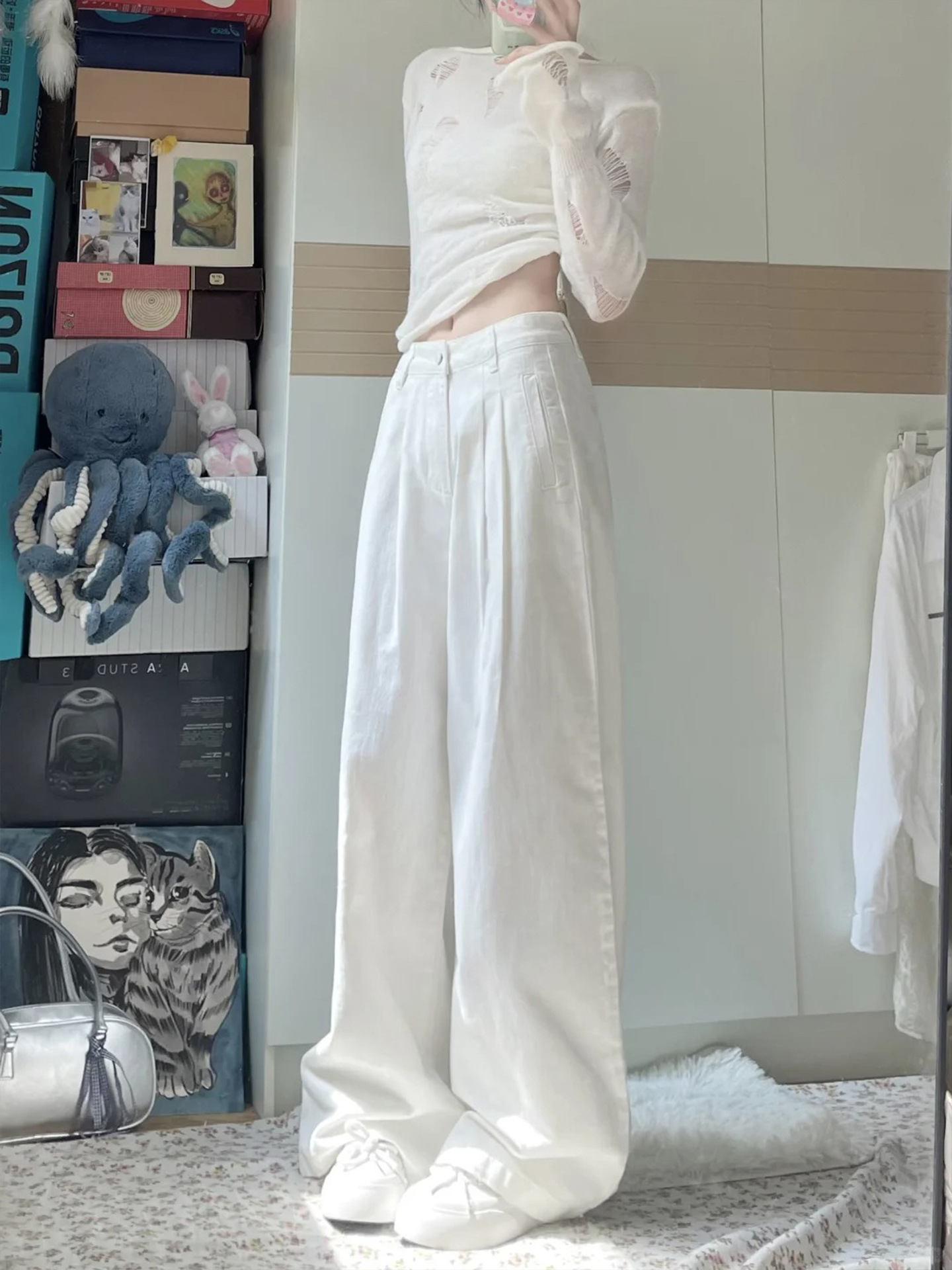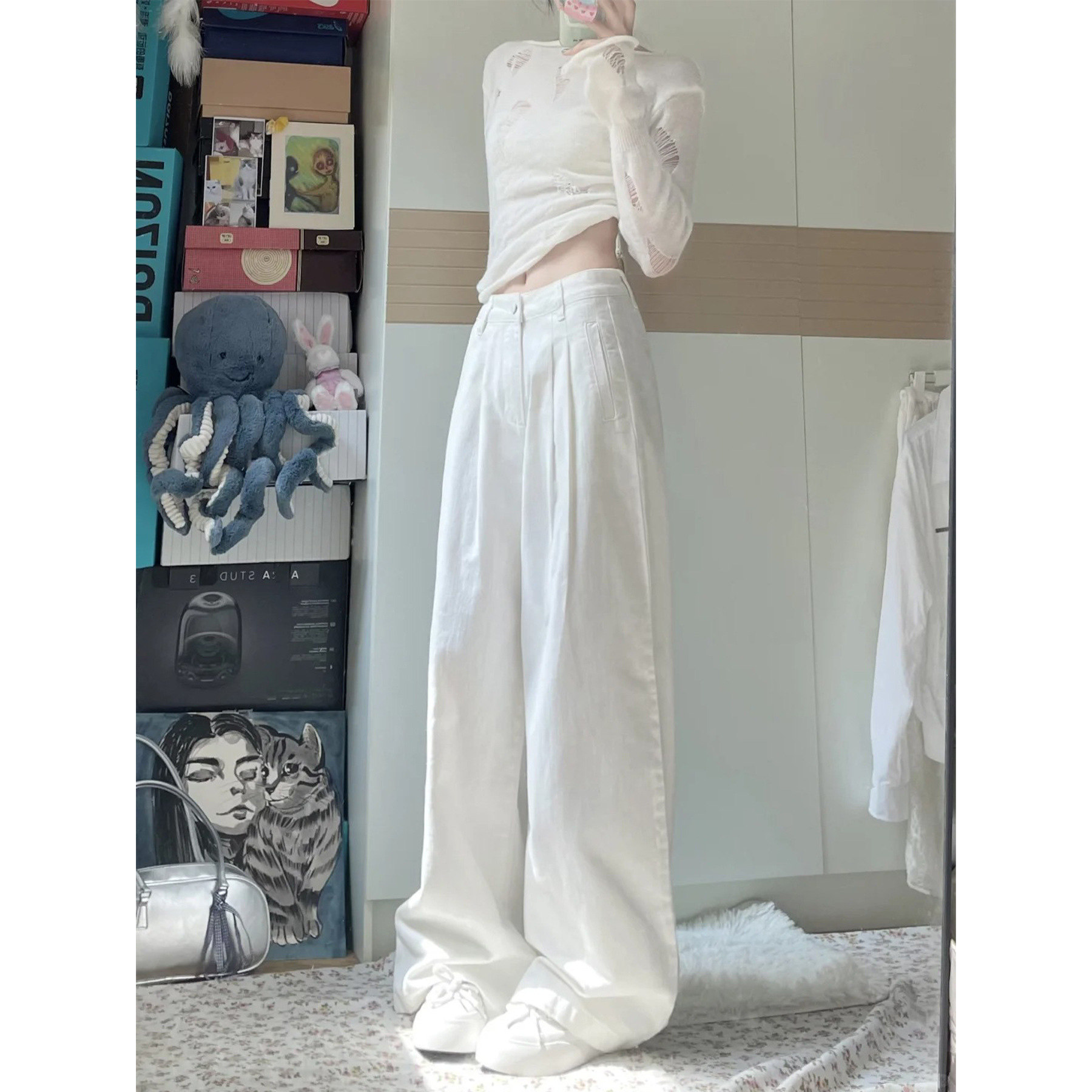흰색 높은 허리 주름 넓은 다리 청바지 여성의 봄과 가을 2025 새로운 느슨한 딥 스트레이트 튜브 강화 바지스토어 가기