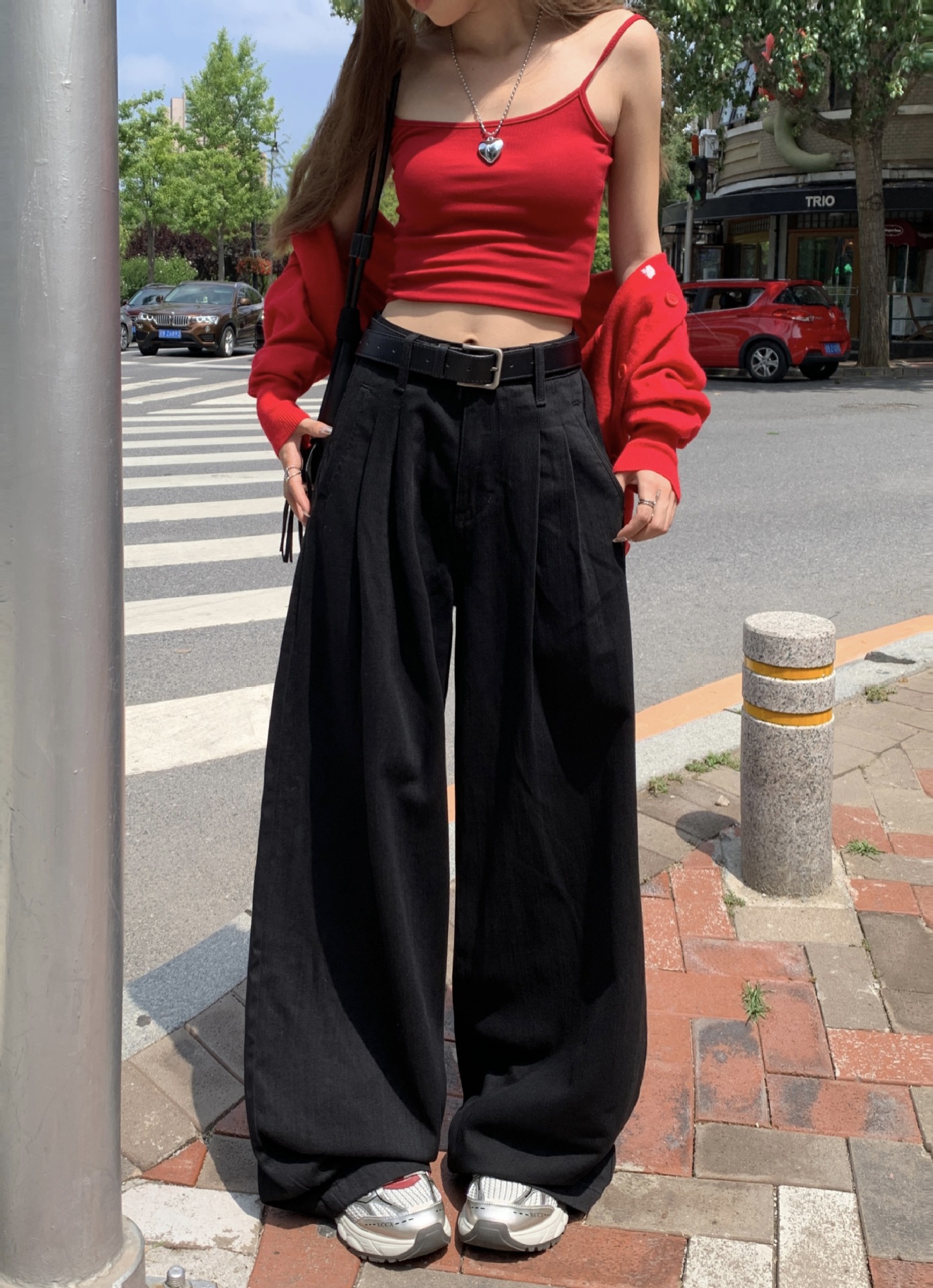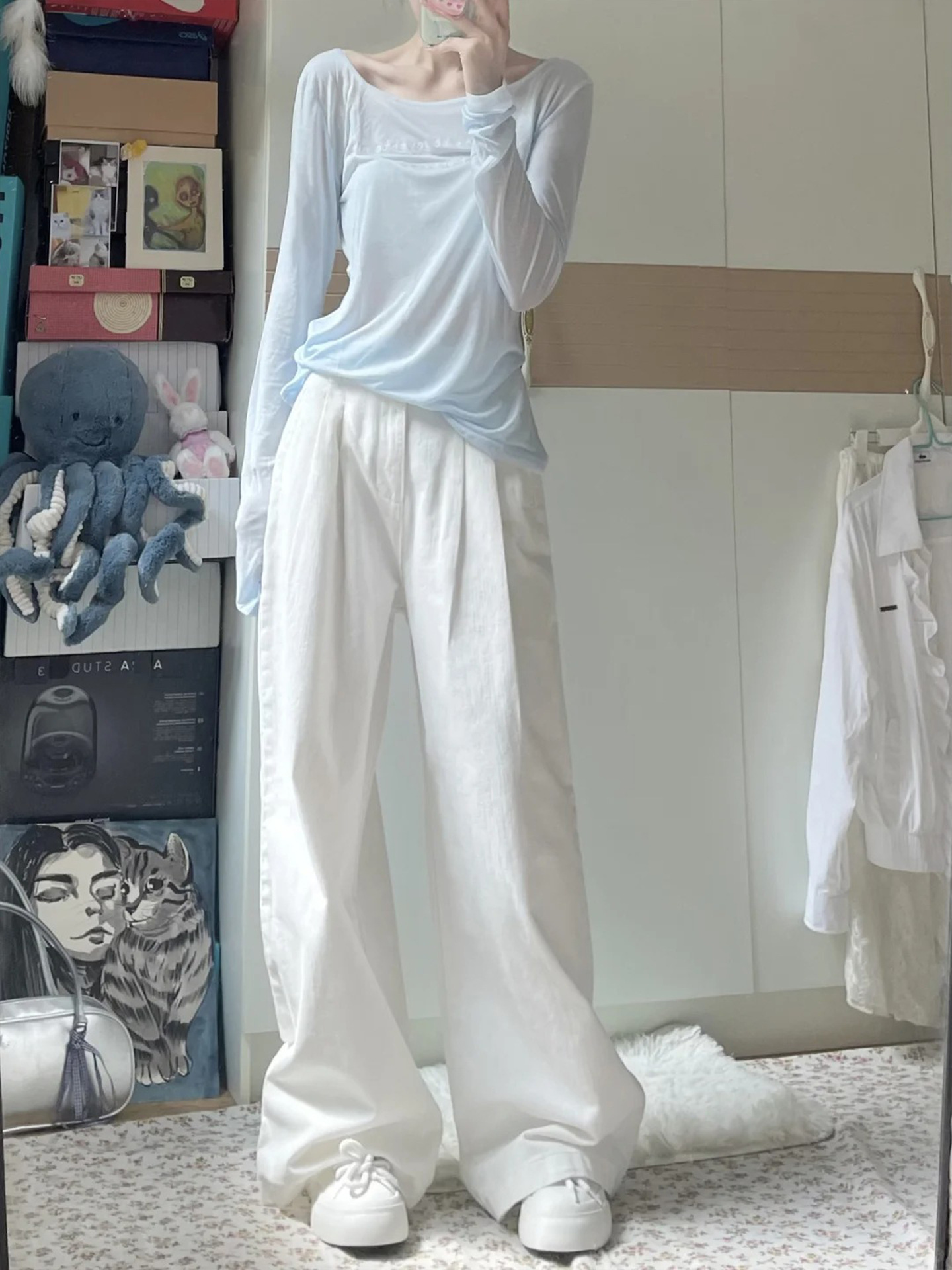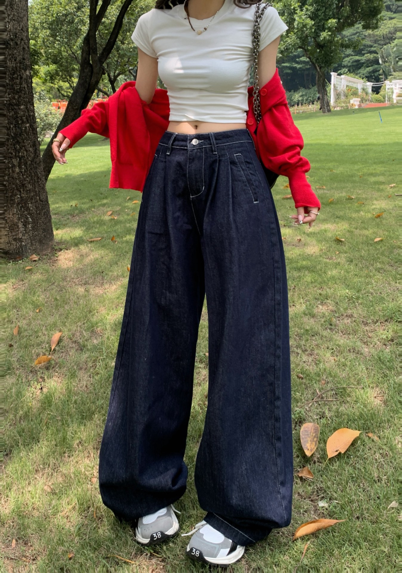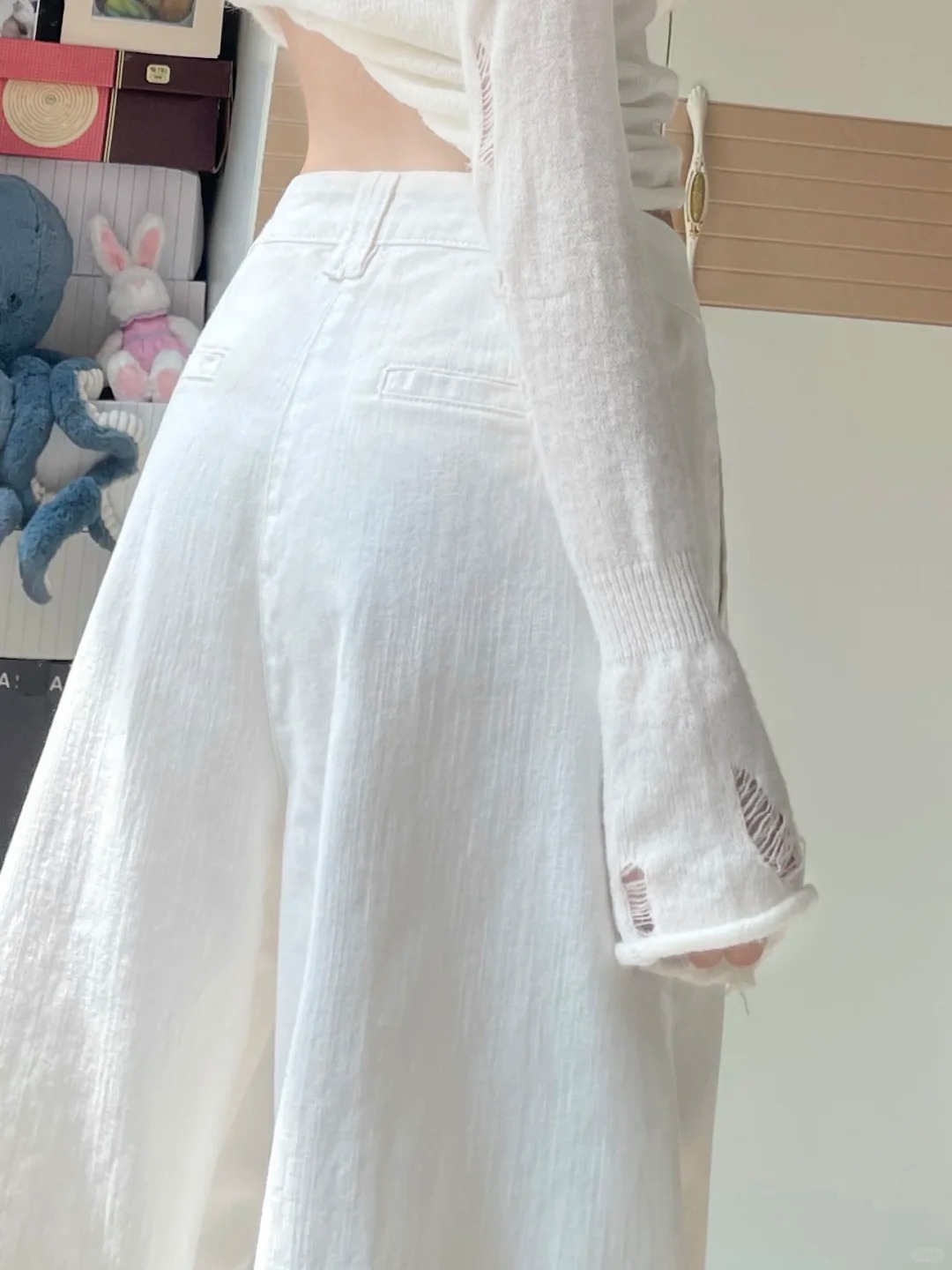 흰색 높은 허리 주름 넓은 다리 청바지 여성의 봄과 가을 2025 새로운 느슨한 딥 스트레이트 튜브 강화 바지스토어 가기