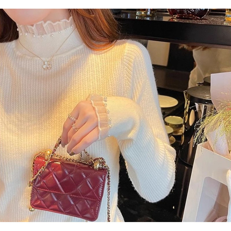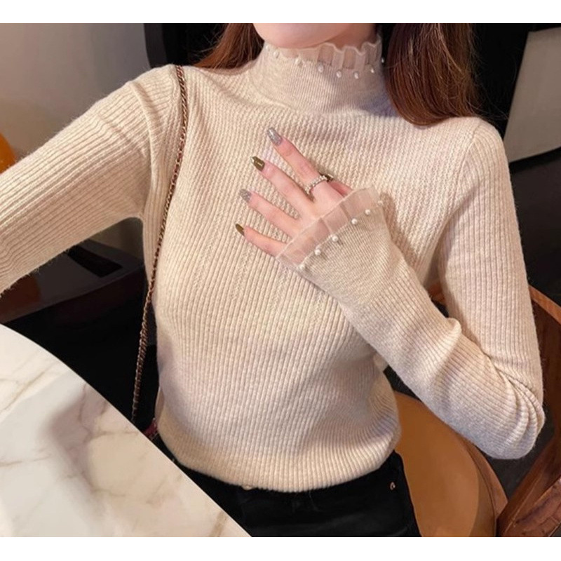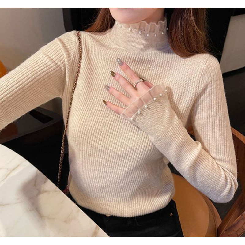 봄 가을 겨울 세련된 패셔블 레이스 긴팔 니트베이스 셔츠 탑 슬림 핏 내부 하프 터틀넥 스웨터 여성용스토어 가기