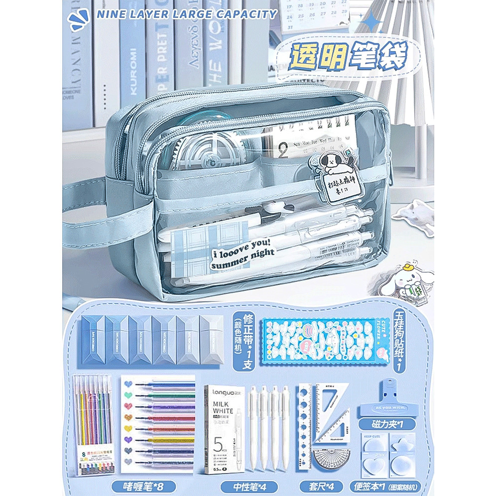 • 9단 필통/무료 자 세트 + 스티커 + 자석 클립 + 핸드북 펜 + 수정 테이프 + 젤펜 + 스티커 메모