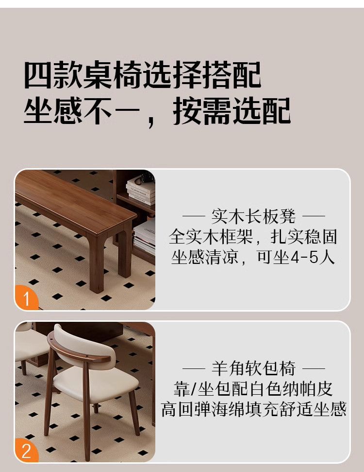 • 월넛 컬러 + 곡선형 등받이 의자 2개 + 롱 의자 1개