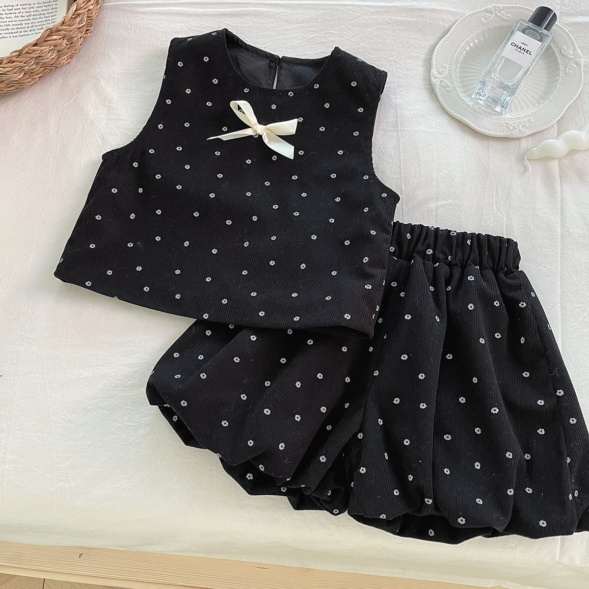 소녀 세트 2025 봄과 가을 새로운 한국 스타일 폴로 도트 조끼 꽃 버드 반바지 아기 소녀베이스 셔츠 크로스 테두리