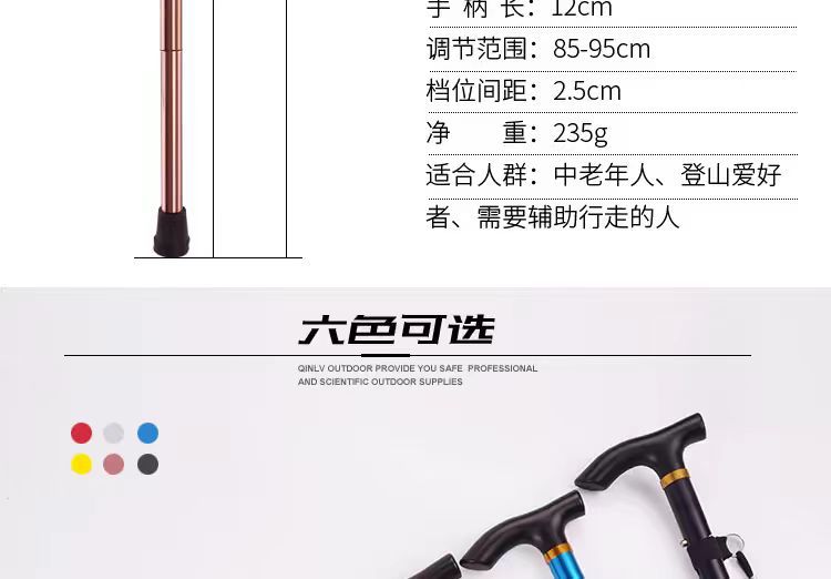 此款老人杖有6个颜色,可以在详情中选择需要的,产品长度85-5CM,单个重量235G ,透明PE带独立中包装,60个装一个外箱,外箱尺寸:50*31*H36CM,毛重16KG,