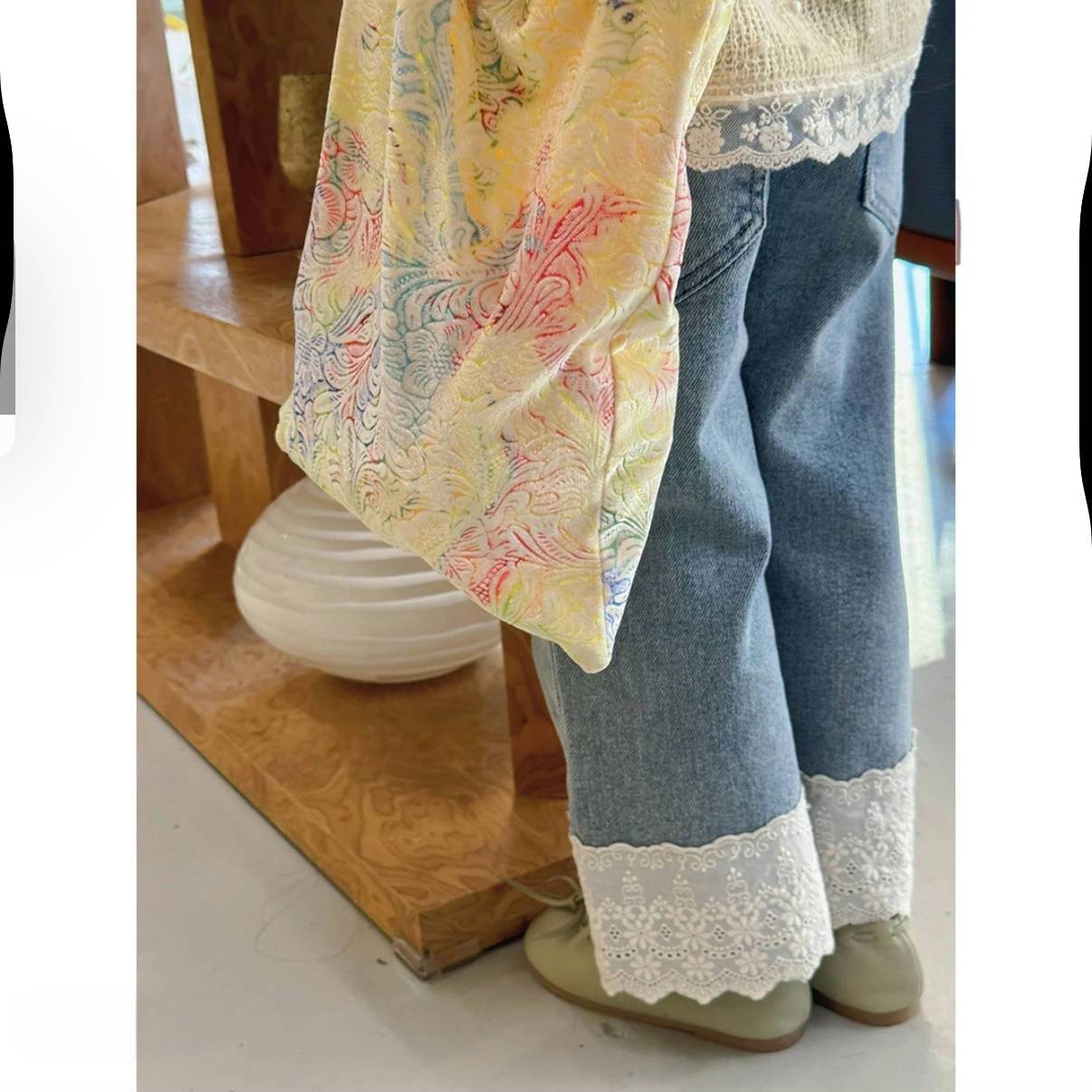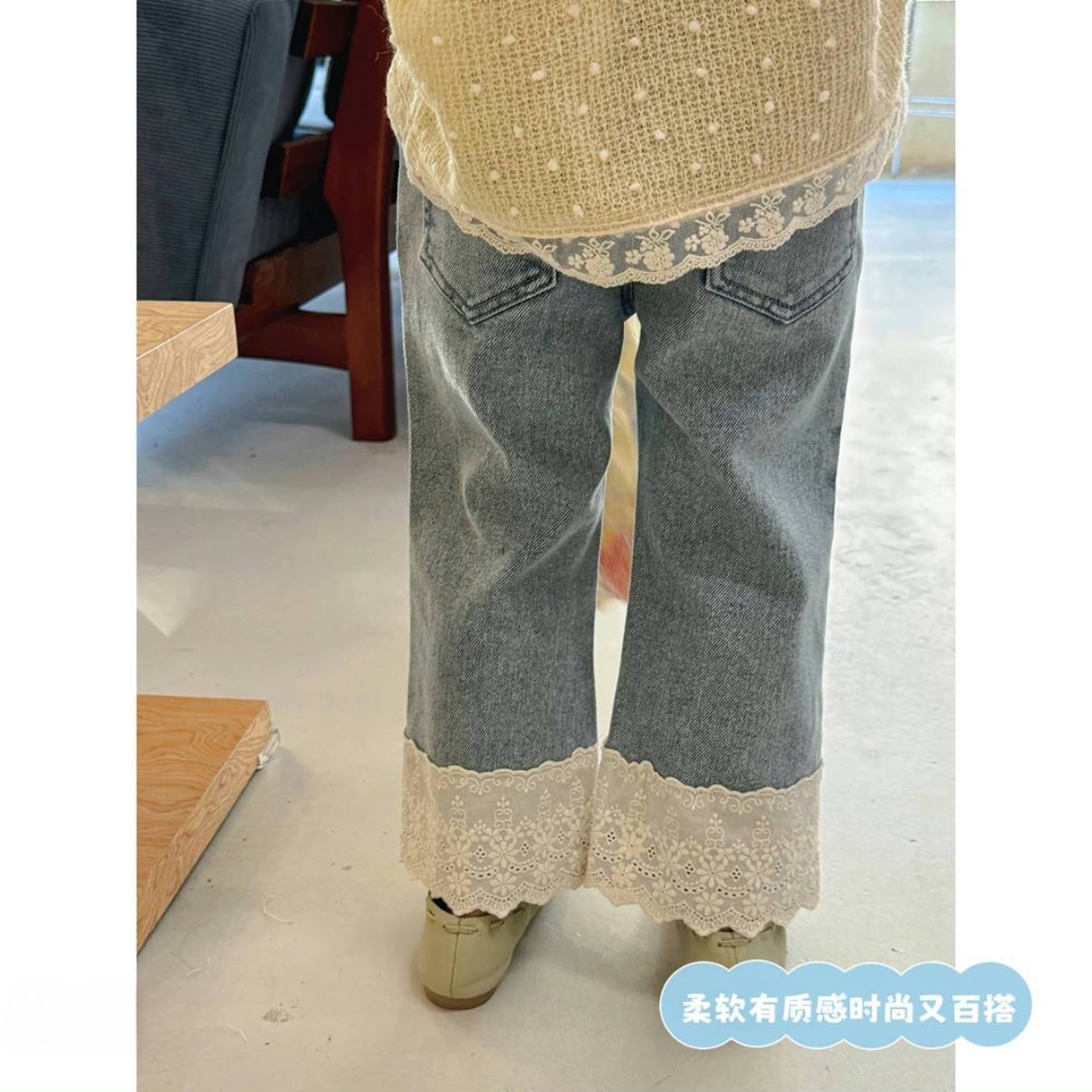 소녀 한국식 레이스 청바지 봄과 가을 2025 새로운 어린이 아기 스타일 올매치 캐주얼 와이드 레그 바지스토어 가기