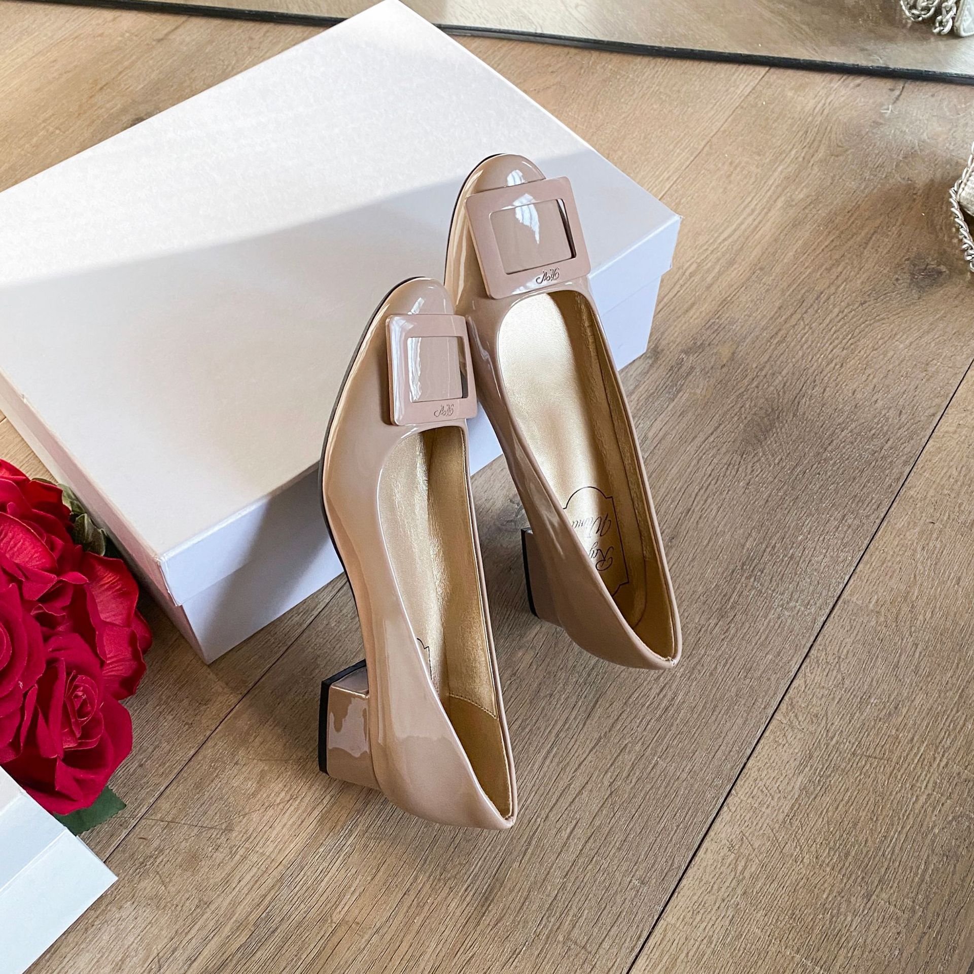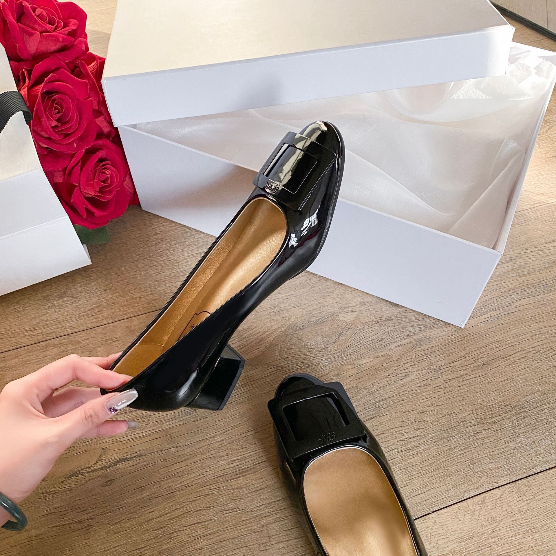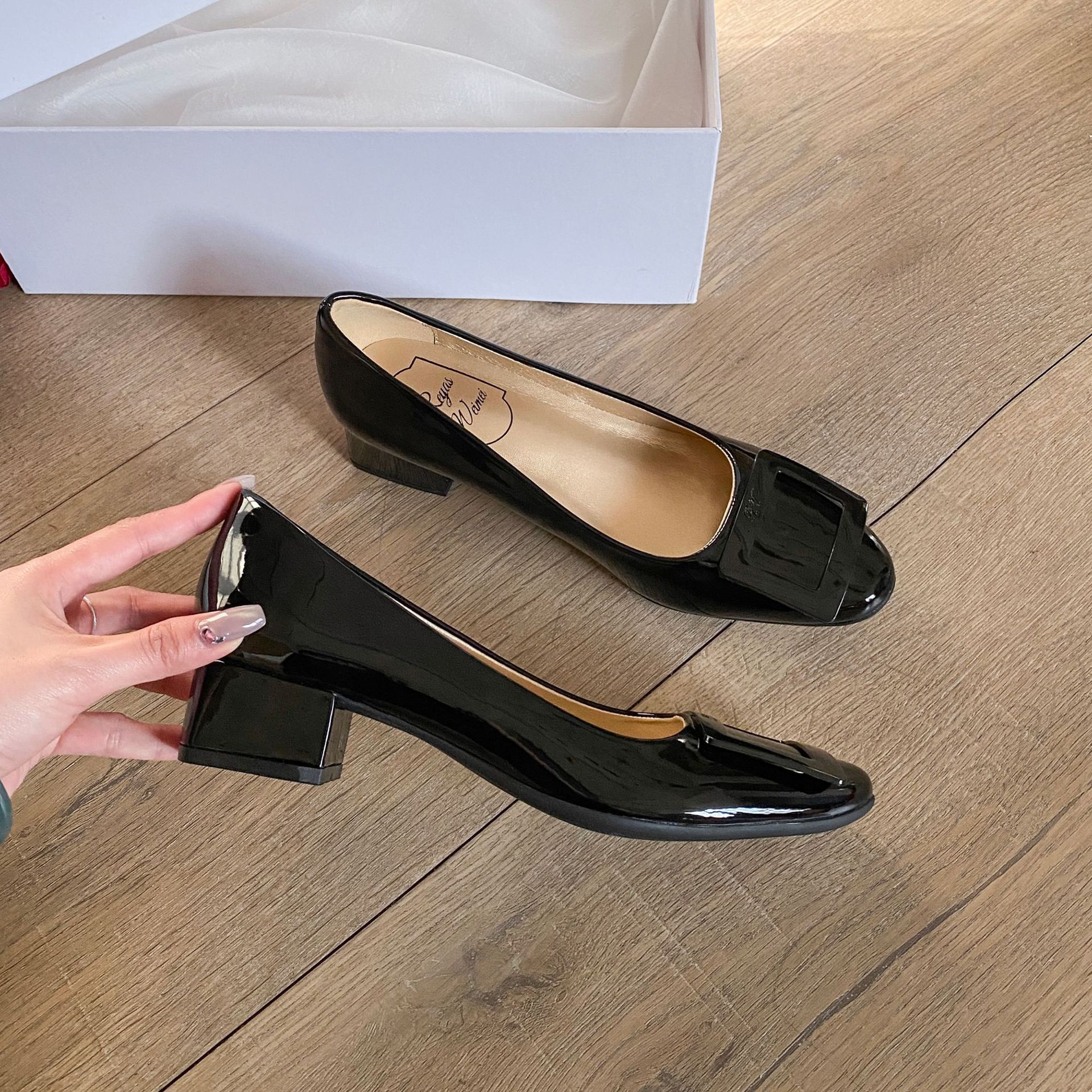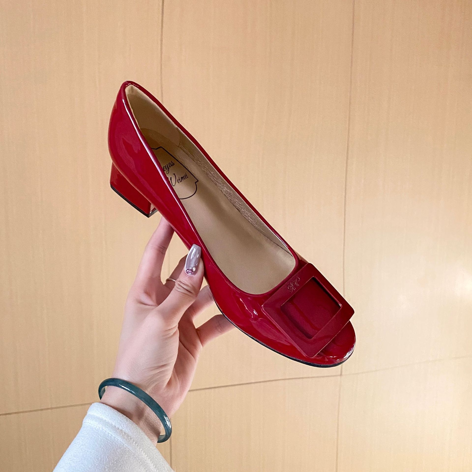 여성용 누드 핑크 싱글 슈즈 2025 신상 페르시 페이턴트 가죽 하이힐 웨딩 슈즈 다용도 두꺼운 굽 rv 스퀘어 버클 통근 슈즈스토어 가기