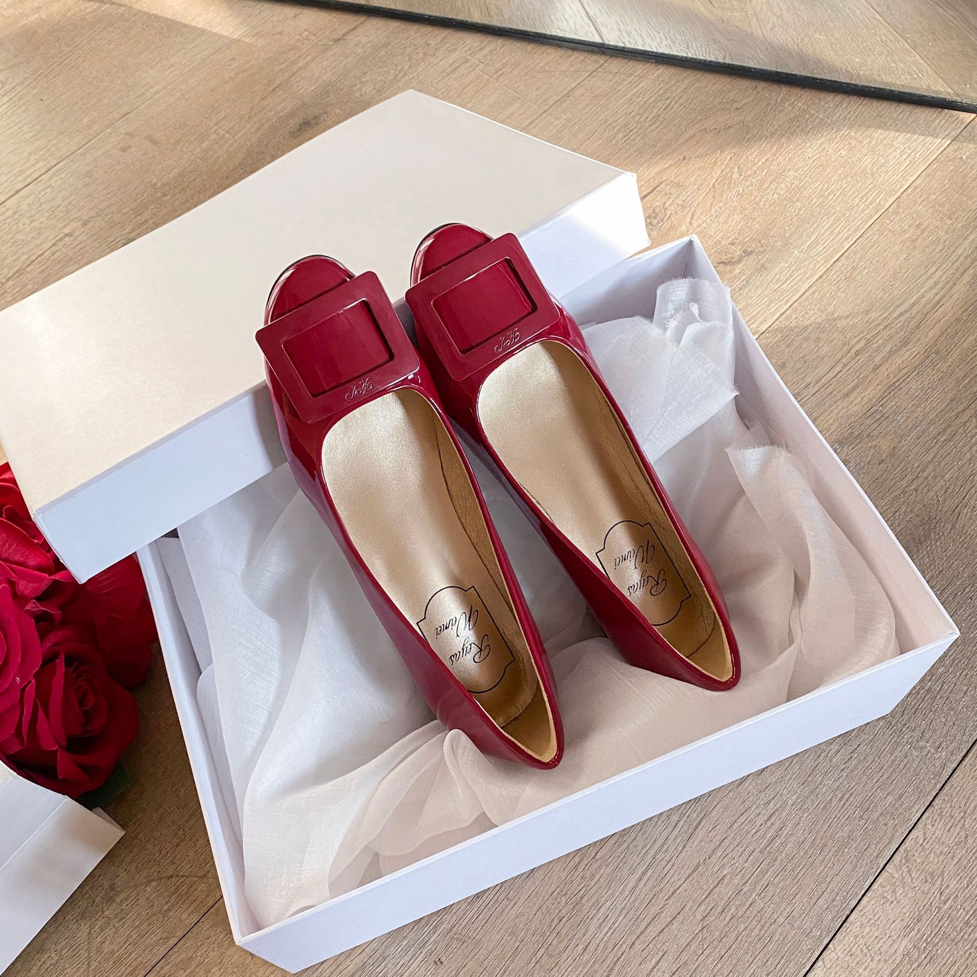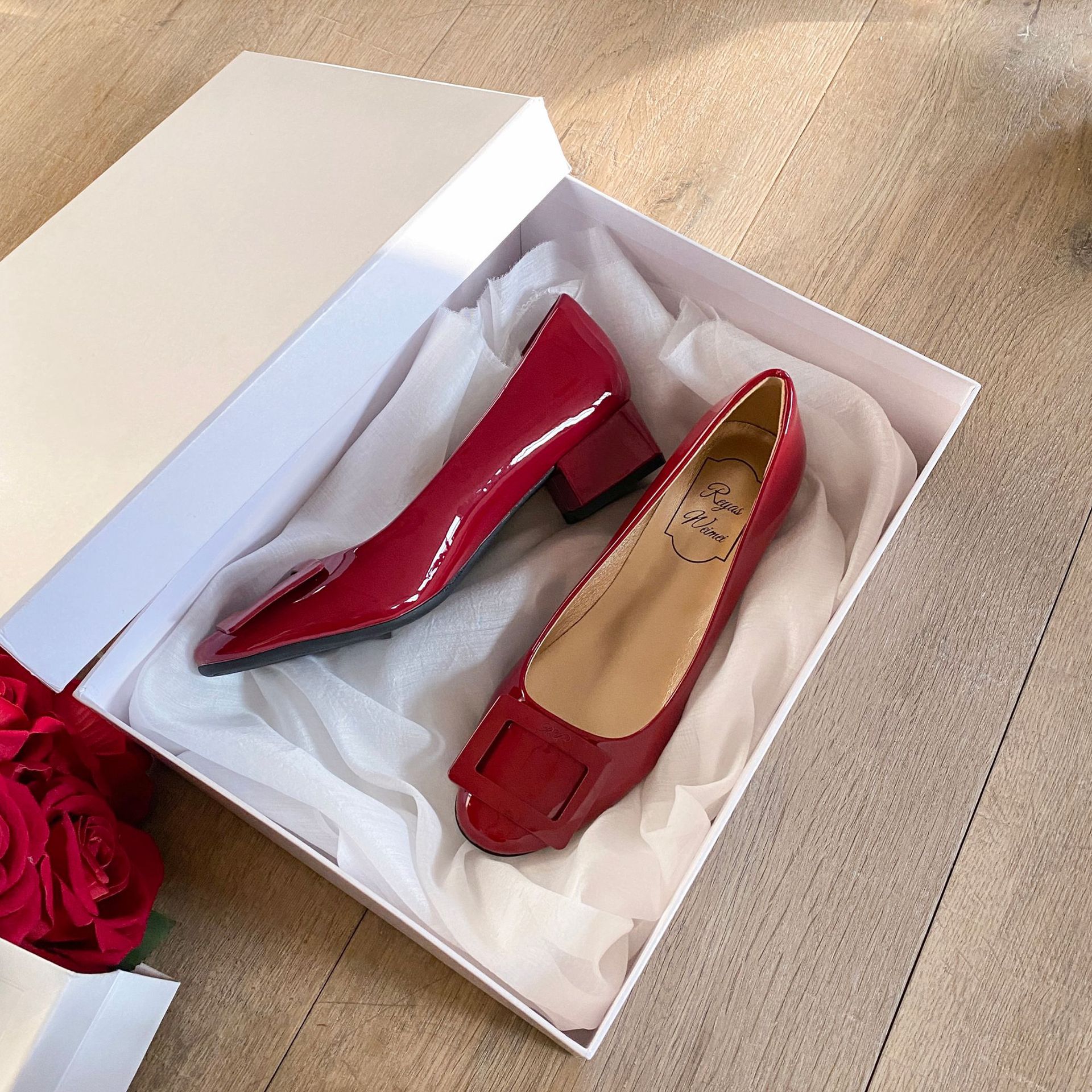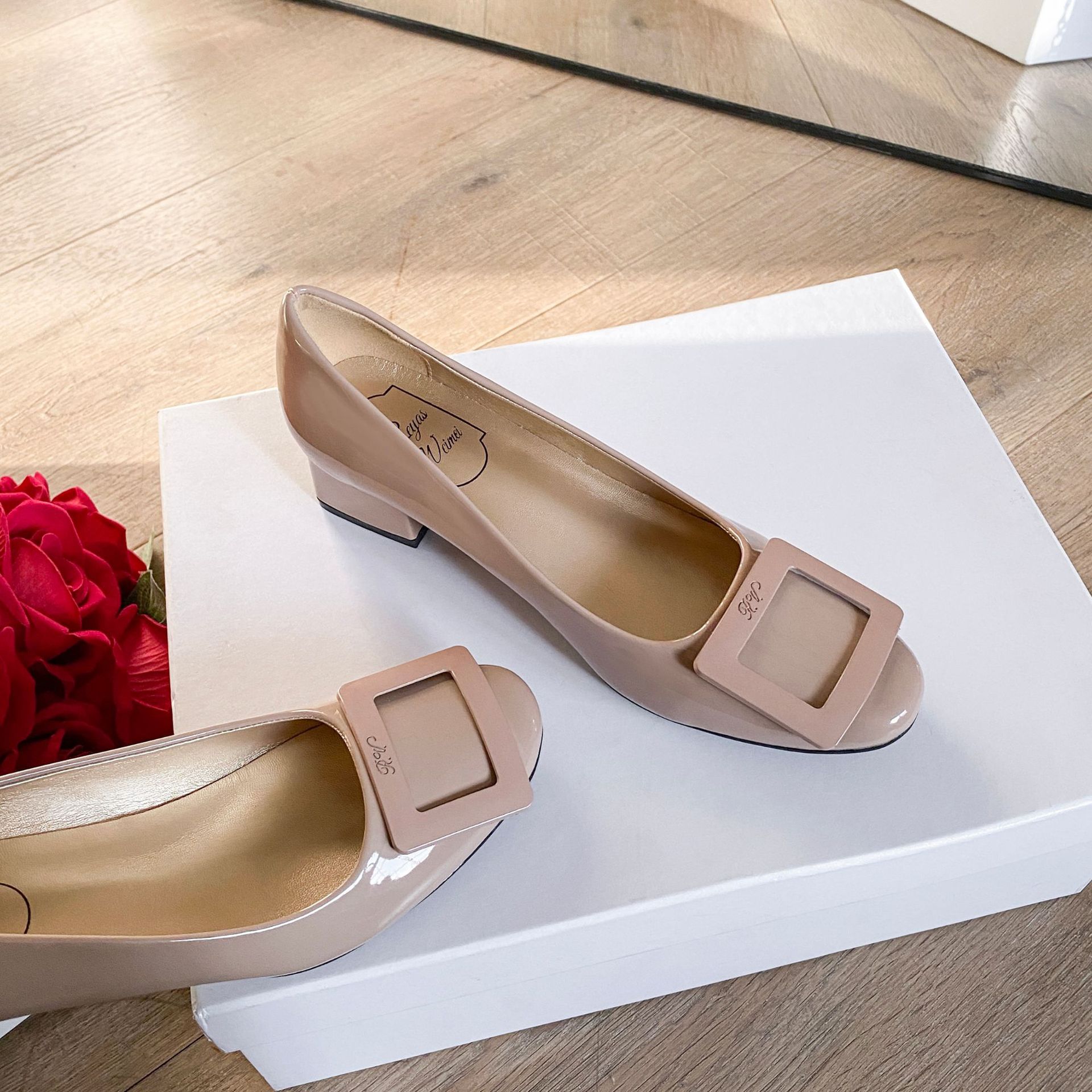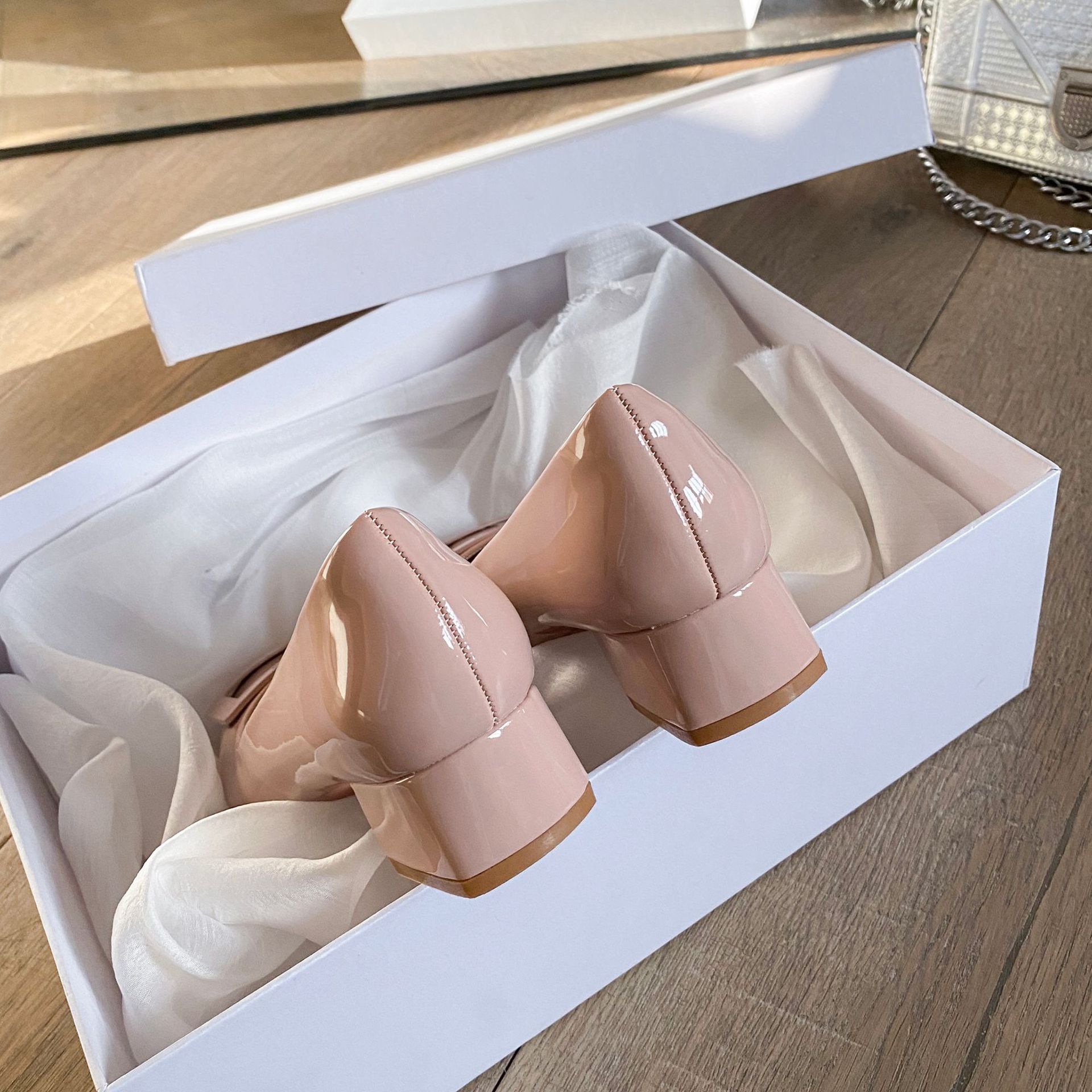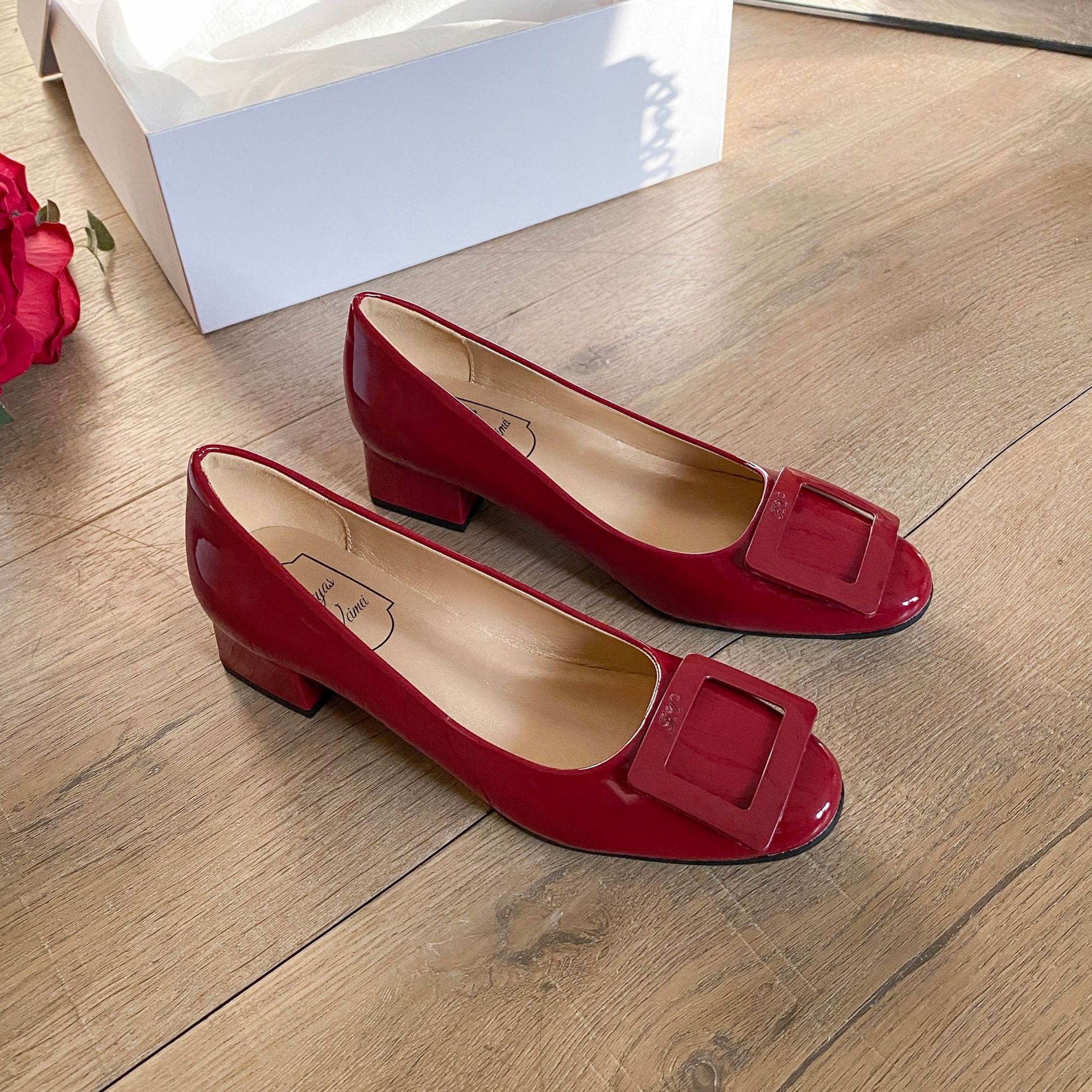 여성용 누드 핑크 싱글 슈즈 2025 신상 페르시 페이턴트 가죽 하이힐 웨딩 슈즈 다용도 두꺼운 굽 rv 스퀘어 버클 통근 슈즈스토어 가기