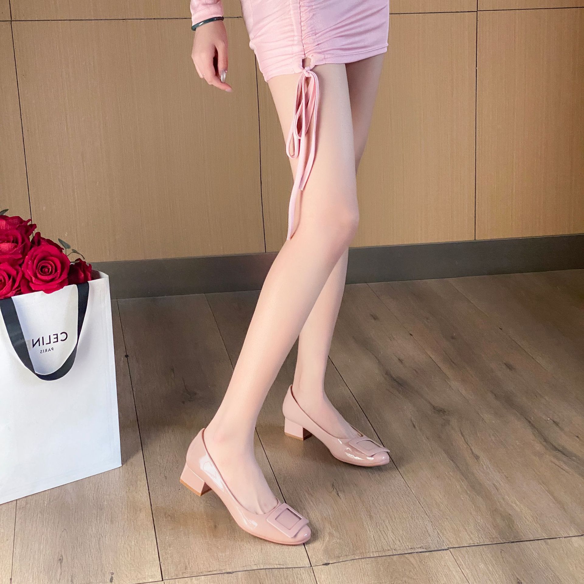 여성용 누드 핑크 싱글 슈즈 2025 신상 페르시 페이턴트 가죽 하이힐 웨딩 슈즈 다용도 두꺼운 굽 rv 스퀘어 버클 통근 슈즈