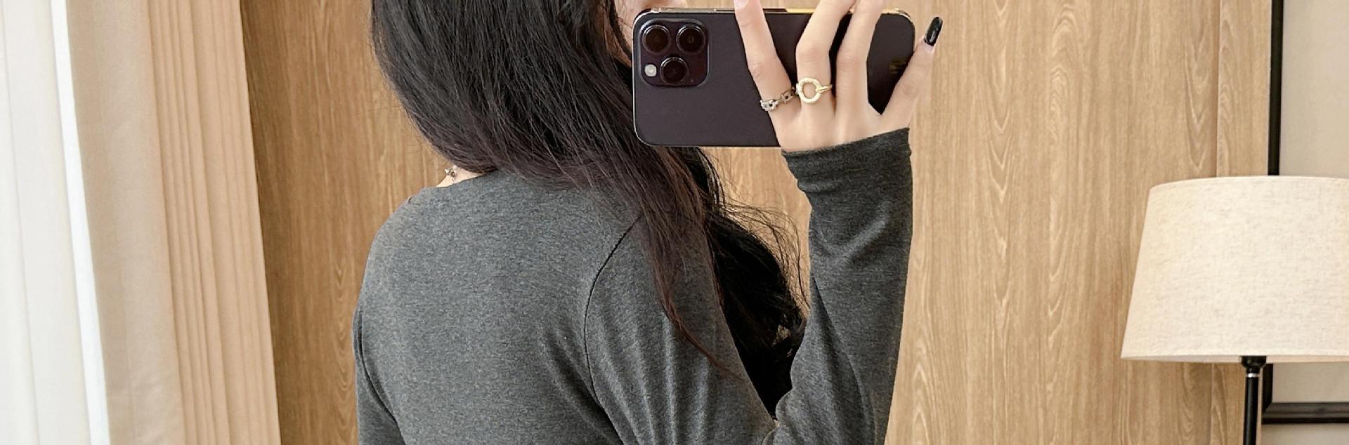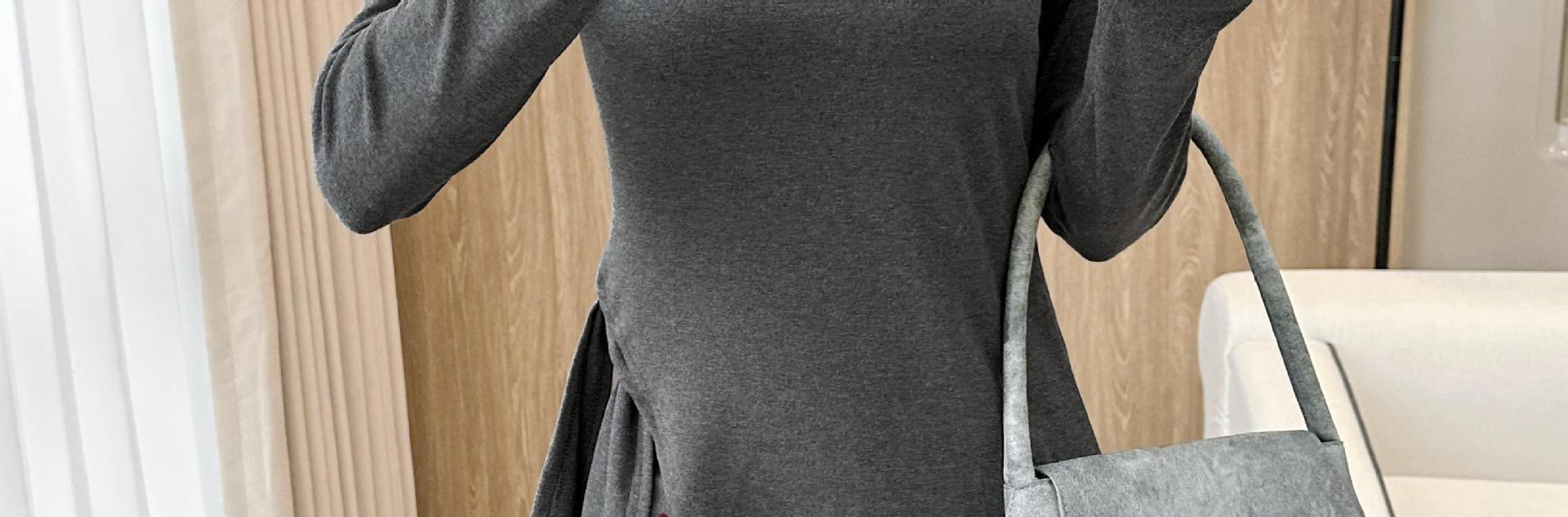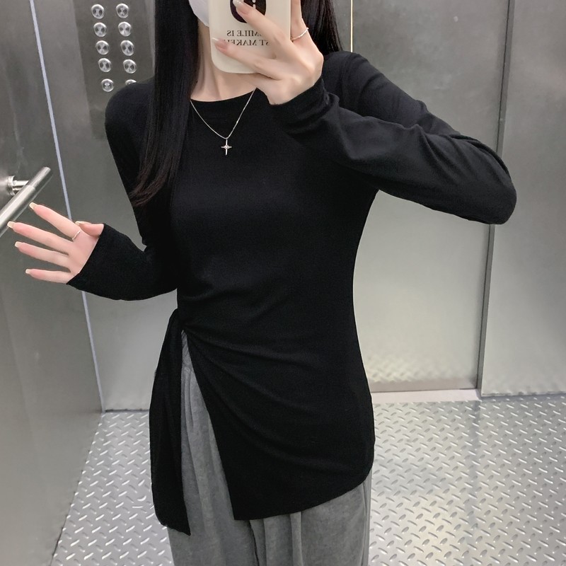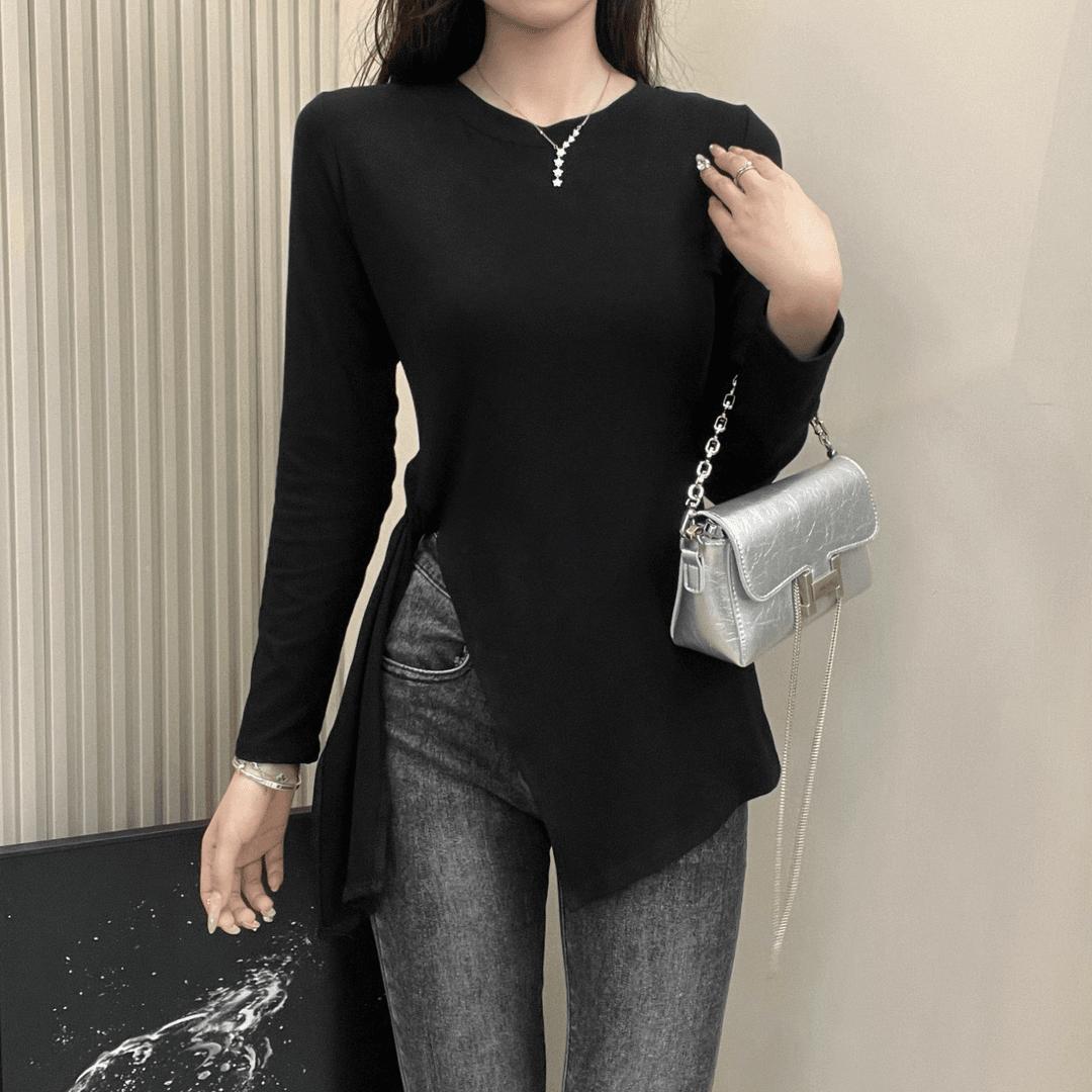 긴 소매 티셔츠 봄과 가을 디자인베이스 셔츠 단색 틈새 분할 우아한 슬림 블랙 불규칙한 탑 여성