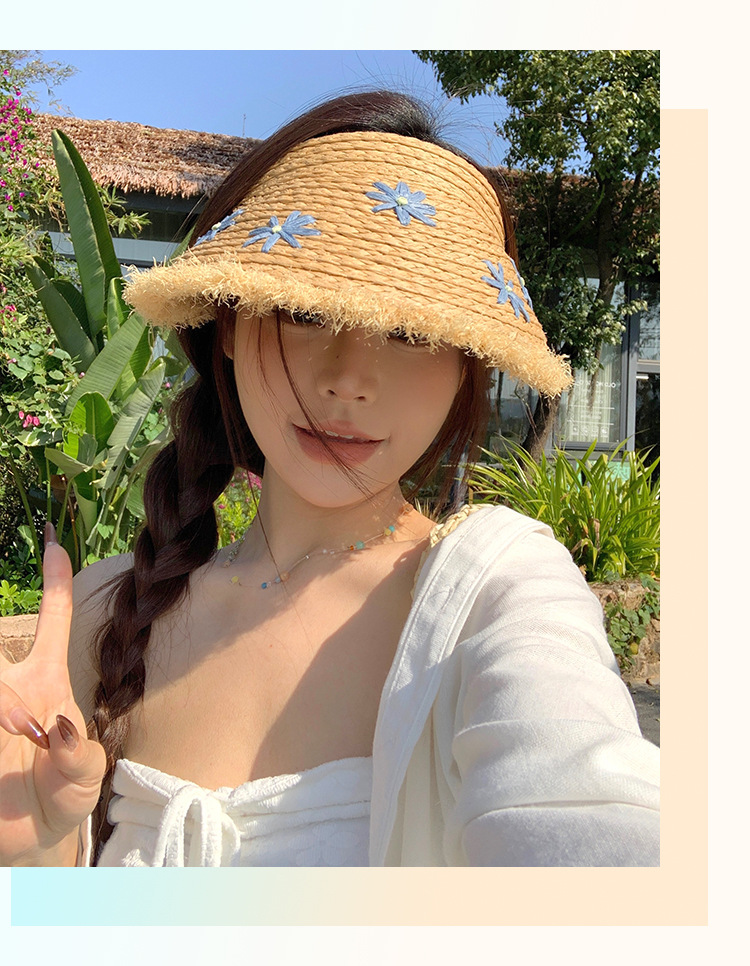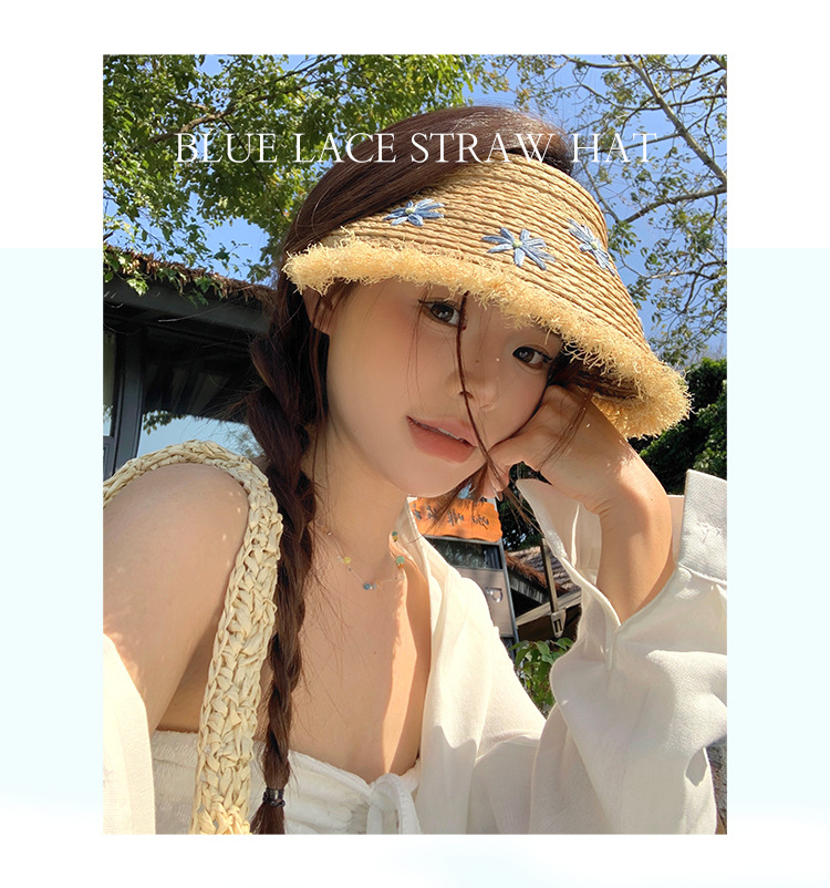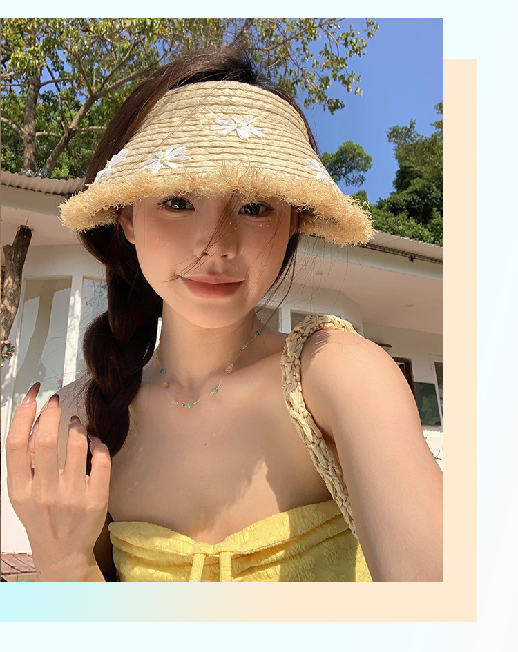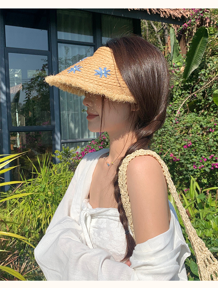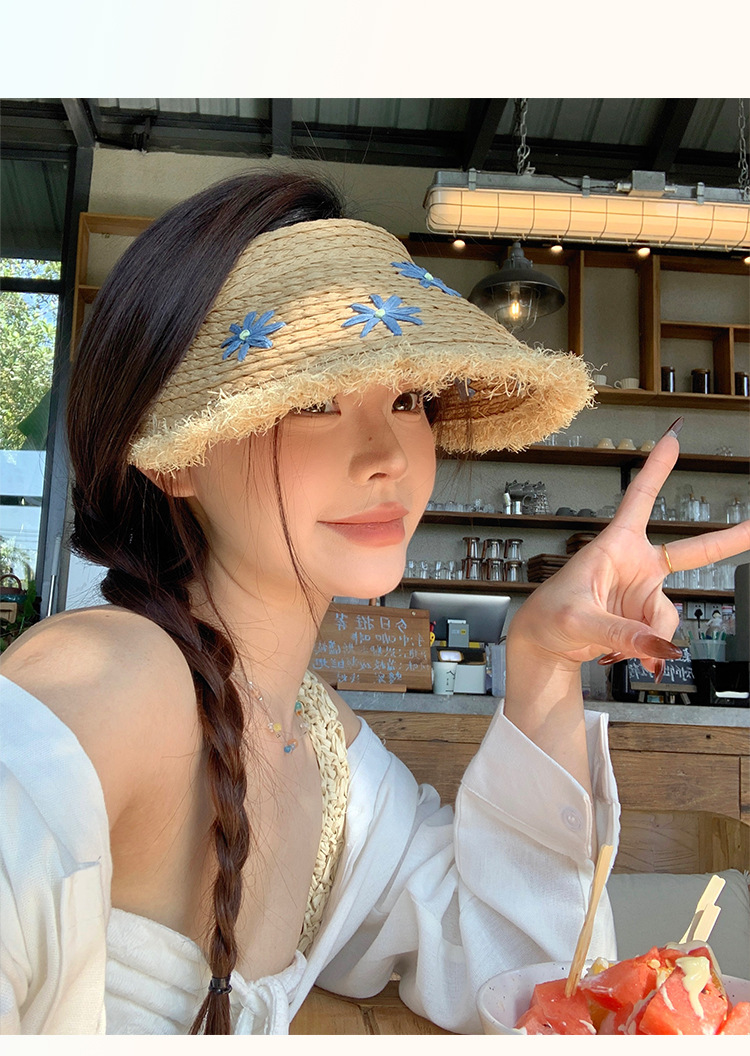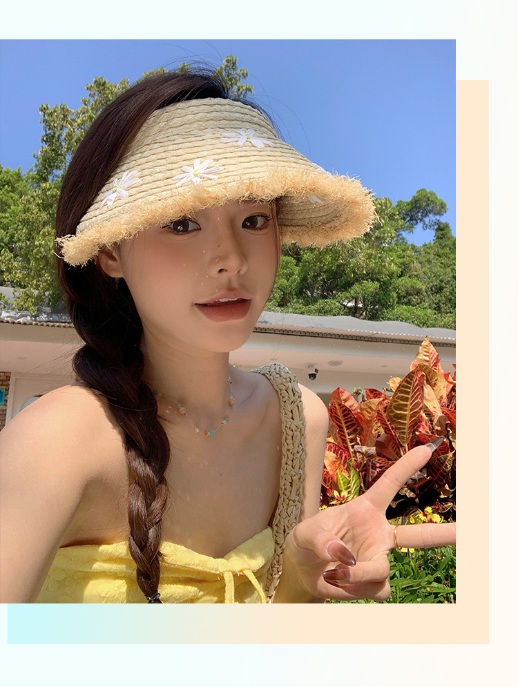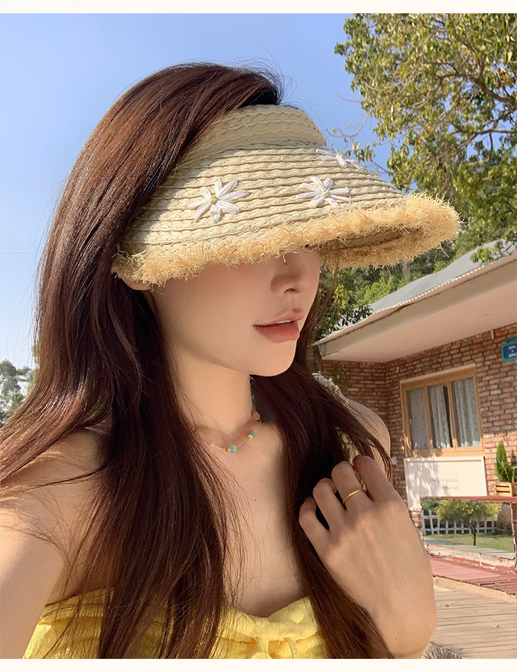 데이지 라피 위브 빈 탑 모자 여성의 2025 년 봄 새로운 큰 브림 밀짚 모자 해변 선 스크린 모자스토어 가기