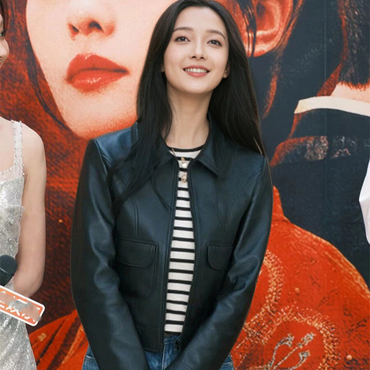Liu Shi Di와 동일한 스타일의 블루 프렌치 레트로 하이웨이스트 마이크로 플레어 팬츠, 루즈한 와이드 레그 청바지, 블랙 PU 가죽 자켓