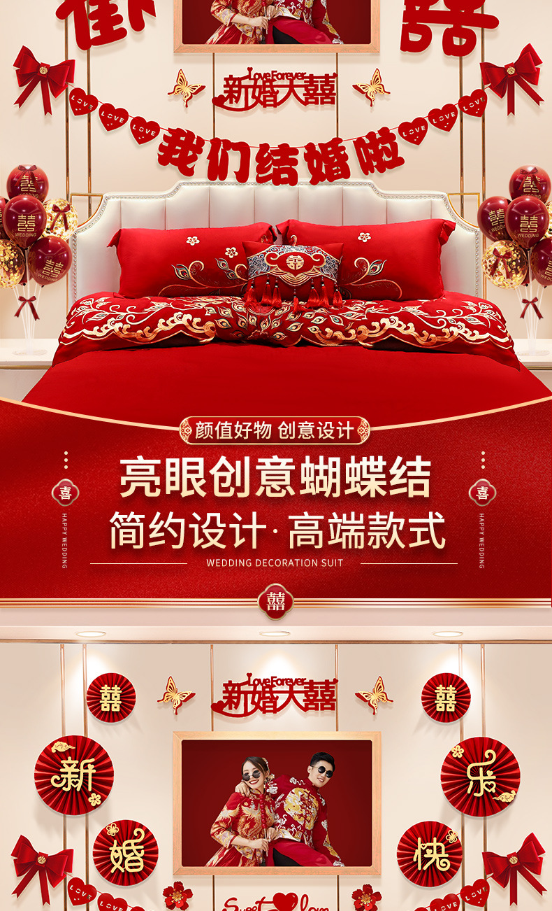 웨딩 룸 레이아웃 세트 새 집 침실 장식 웨딩 남자의 마스터 침실 침대 옆 꽃 전체 결혼식 용품 세트