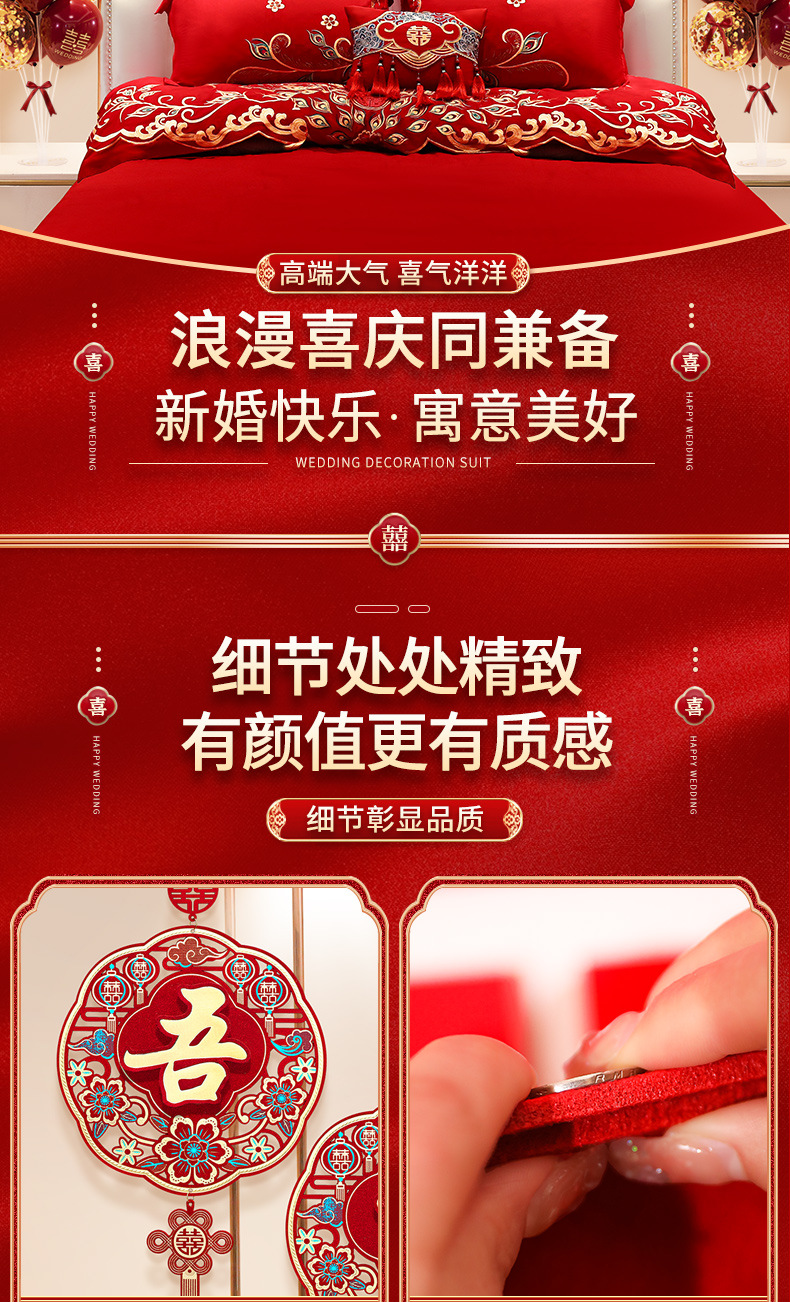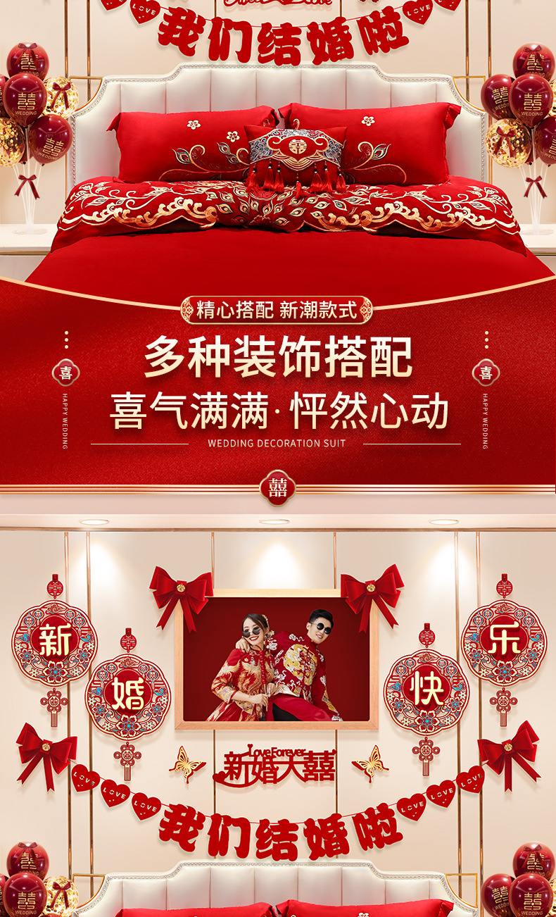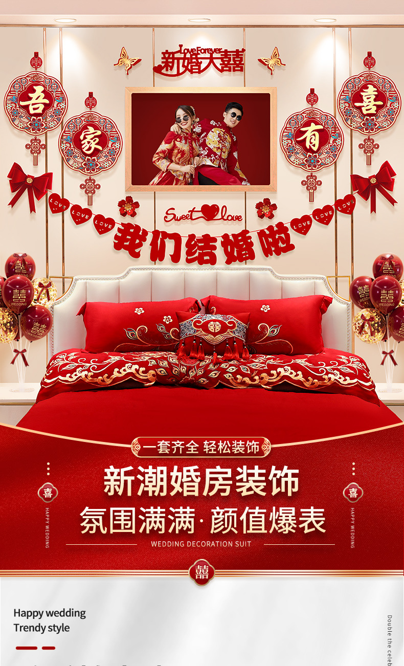 웨딩 룸 레이아웃 세트 새 집 침실 장식 웨딩 남자의 마스터 침실 침대 옆 꽃 전체 결혼식 용품 세트스토어 가기