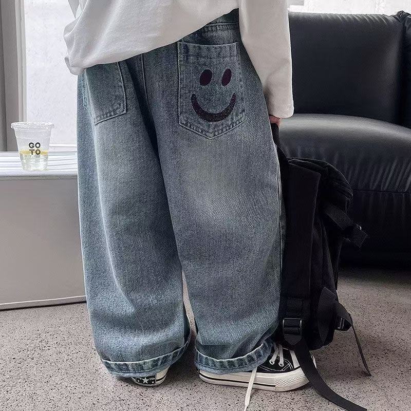 어린이 청바지 가을 2025 아동복 한국 아기 캐주얼 바지 스마일리 수놓은 소년 스트레이트 청바지