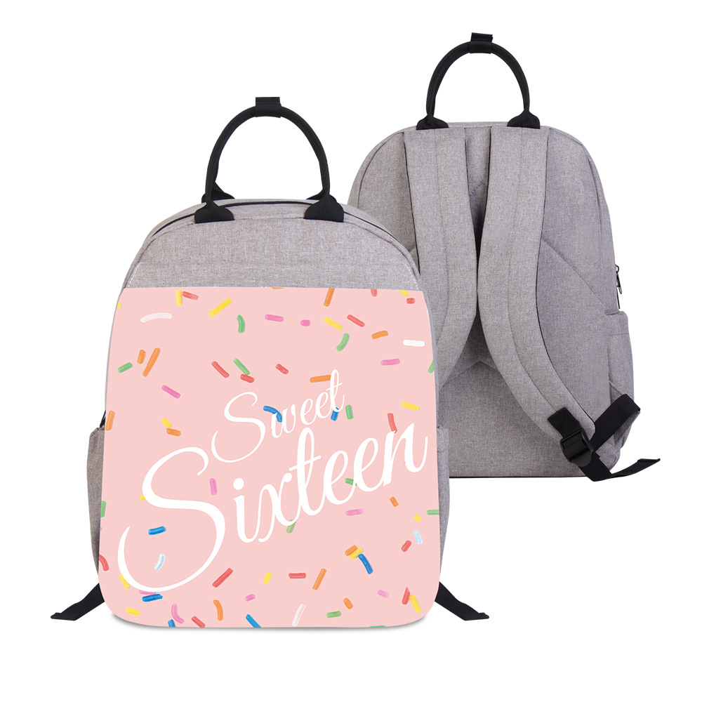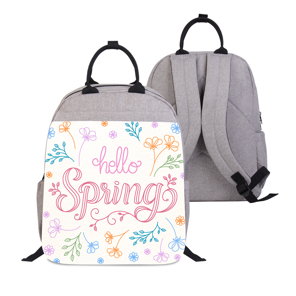 潮妈的至美时刻----时尚新潮热转印多功能妈咪包,涤纶布料,轻盈能装,锁式二合一提手,舒适不勒手。独特的魔术贴移动前片,可供客人直接印刷,印自己喜欢的的图案(人物照片,品牌LOGO、植物风景、卡通动漫等)随意搭配。