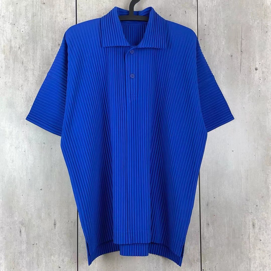 미야케 의류쿠 플리츠 남성 플리츠 폴로 셔츠 반팔 여름 라펠 버튼 사이드 포크 티셔츠 탑 JM193