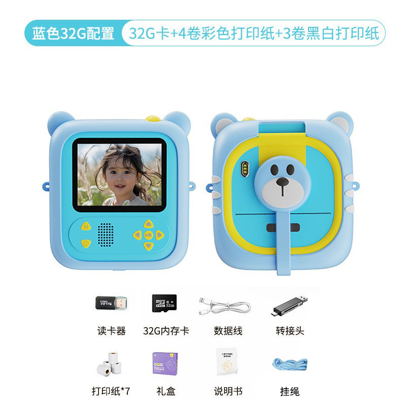 • 블루 폴라로이드 [32G 카드 + 컬러 인쇄 용지 4롤 + 흑백 용지 3롤 + 끈 + 카드 리더기 + 어댑터]