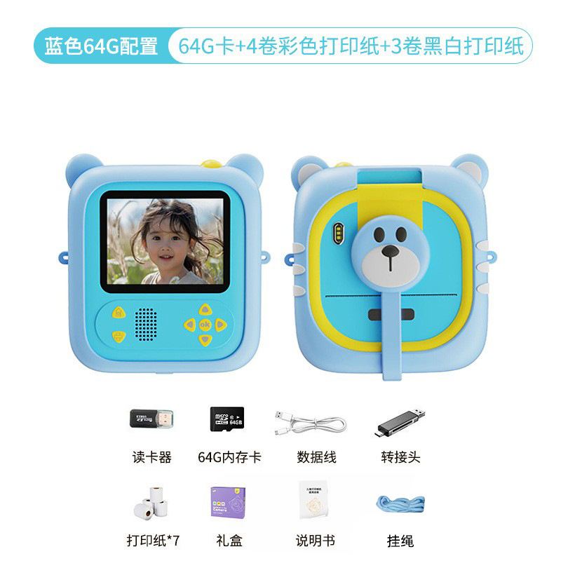 • 블루 폴라로이드 [64G 카드 + 컬러 인쇄 용지 4롤 + 흑백 용지 3롤 + 끈 + 카드 리더기 + 어댑터]
