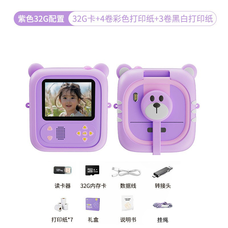 • 보라색 폴라로이드 [32G 카드 + 컬러 인쇄 용지 4롤 + 흑백 용지 3롤 + 끈 + 카드 리더기 + 어댑터]