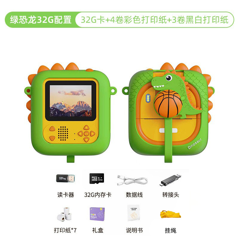 • 녹색 공룡 폴라로이드 [32G 카드 + 컬러 인화지 4롤 + 흑백 인화지 3롤 + 목걸이 줄 + 카드 리더기 + 변환 어댑터]