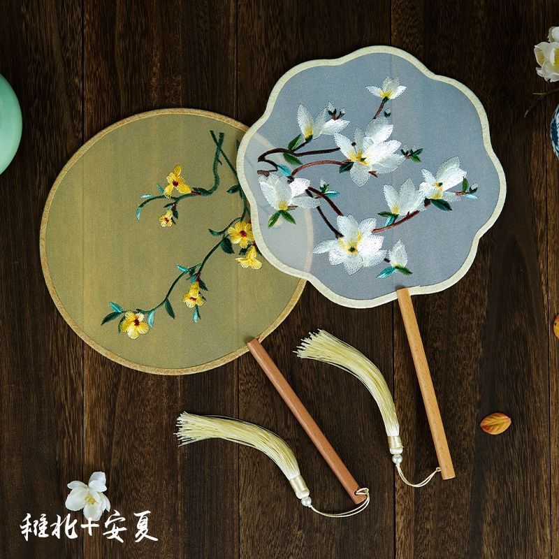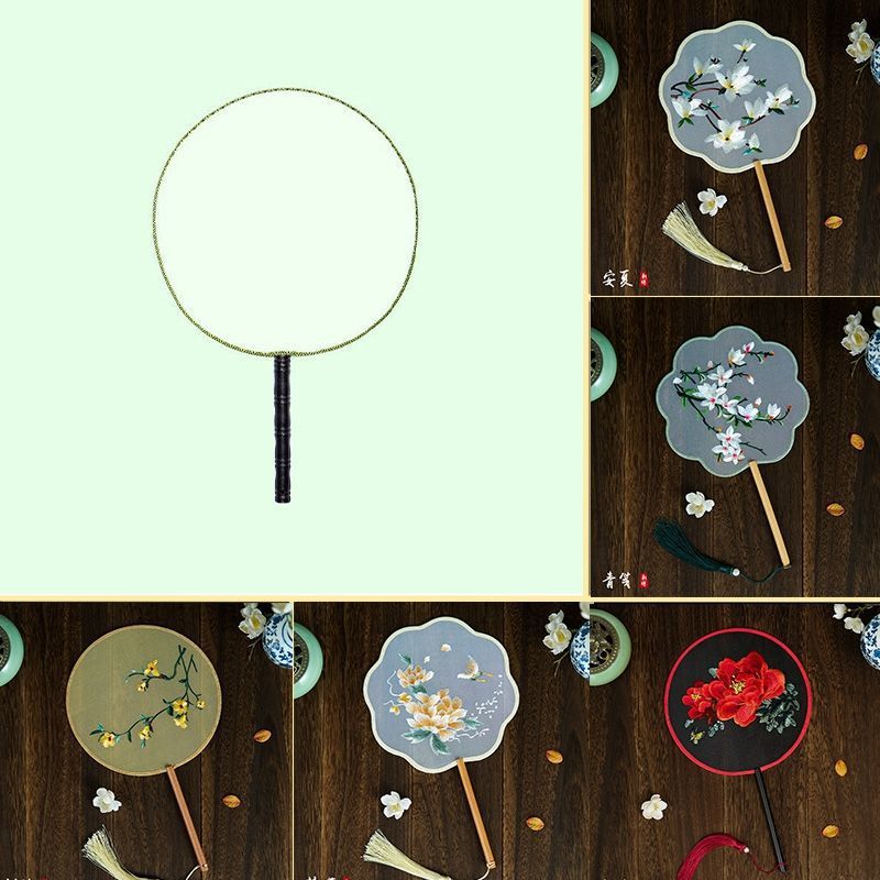 골동품 반투명 라운드 팬 중국 스타일 한푸 긴 핸들 자수 팬 치파오 댄스 팬 고대 의상 중국 스타일
