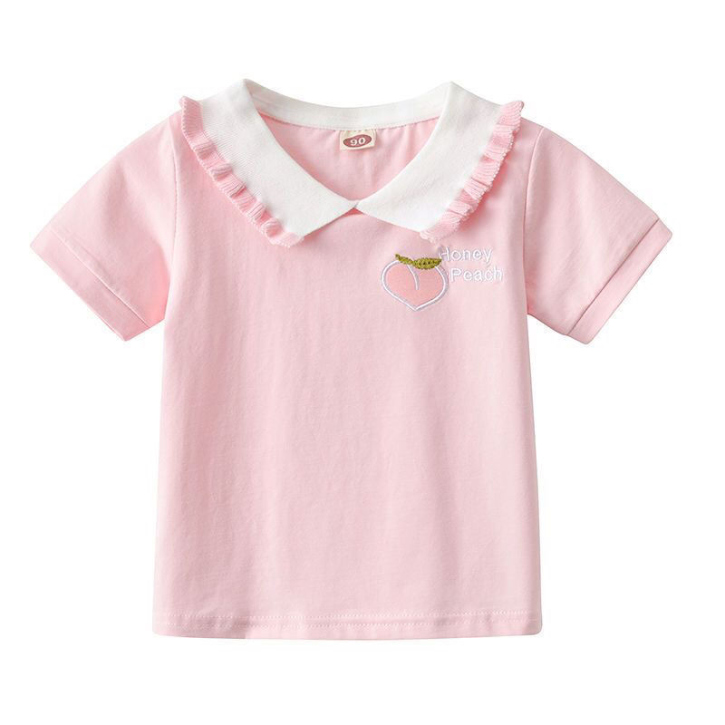 여자 여름 반팔 티셔츠 아기 복숭아 자수 라파 르 탑 어린이 한국식 서양식 베이스 셔츠 얇은 트렌디스토어 가기
