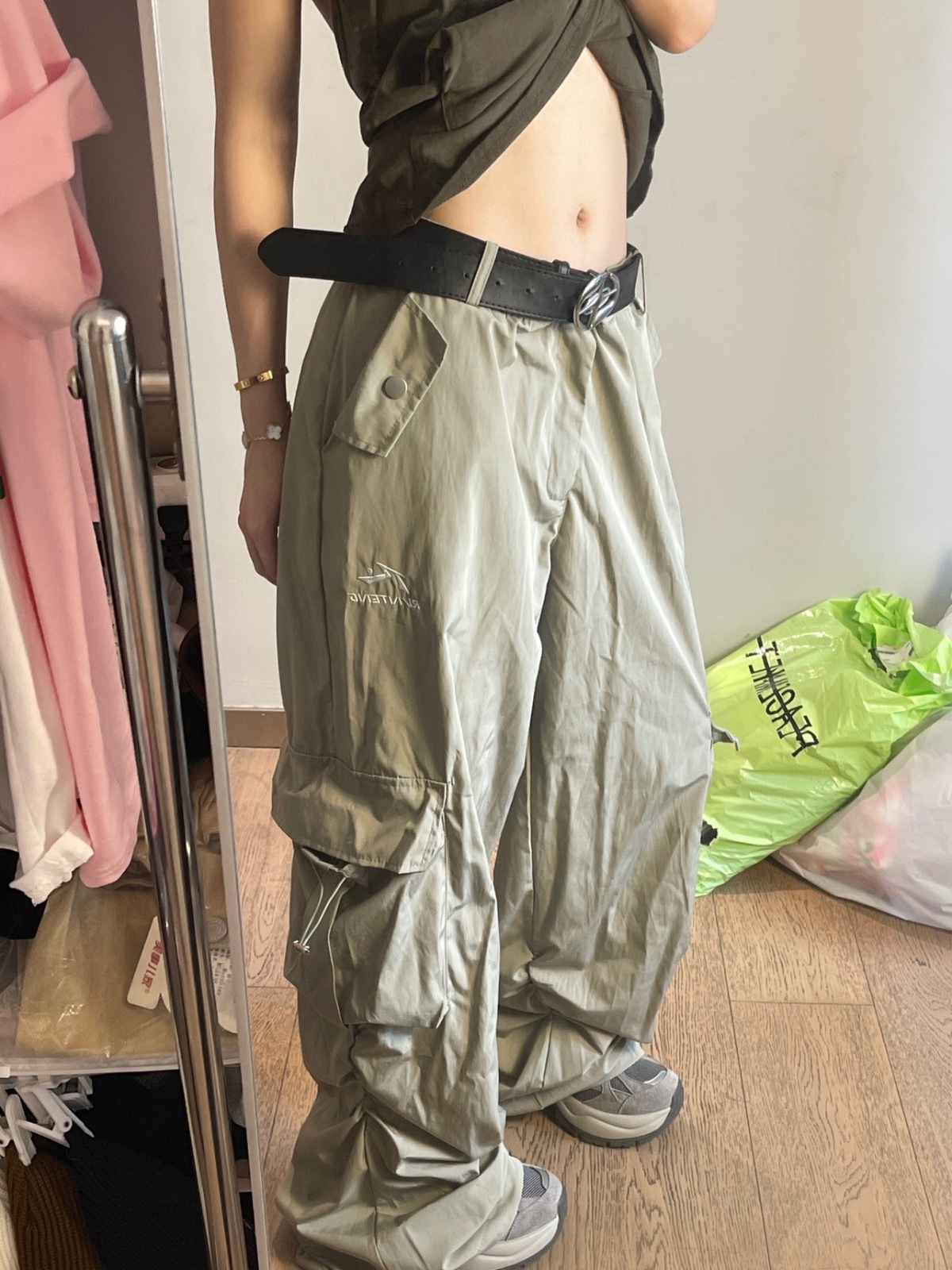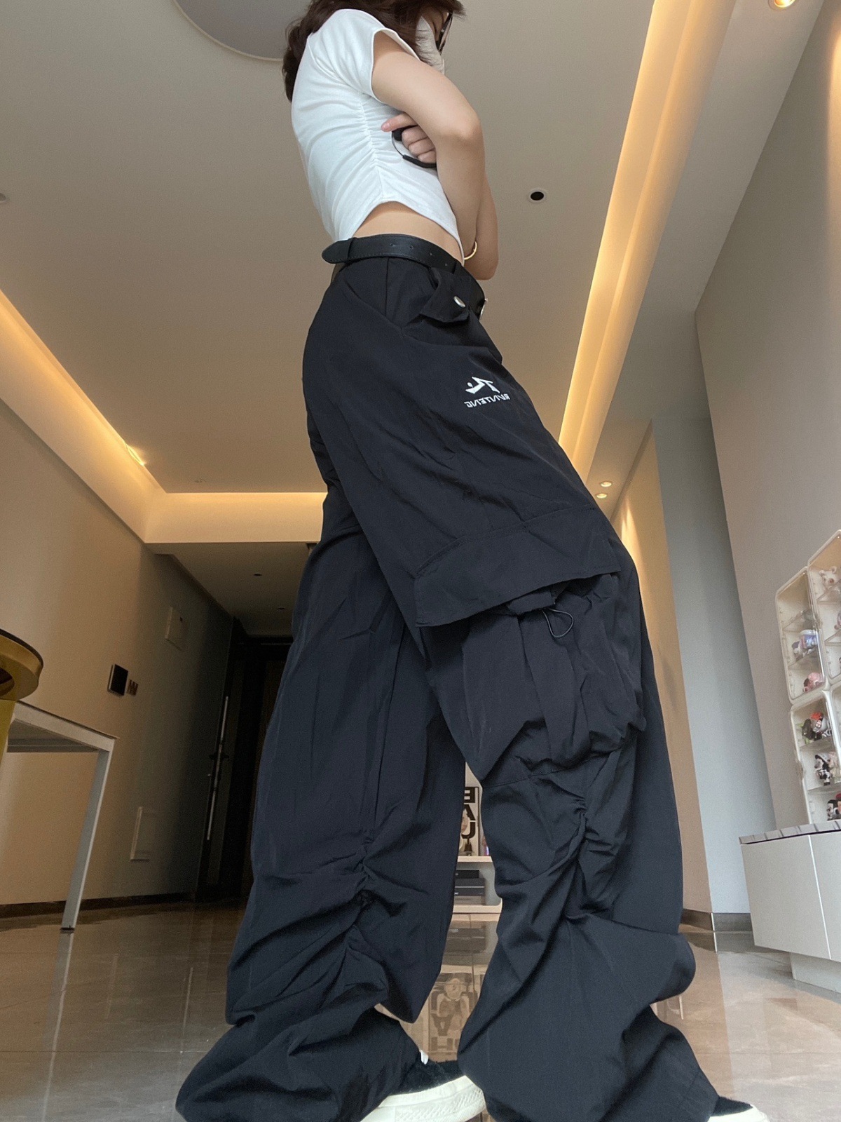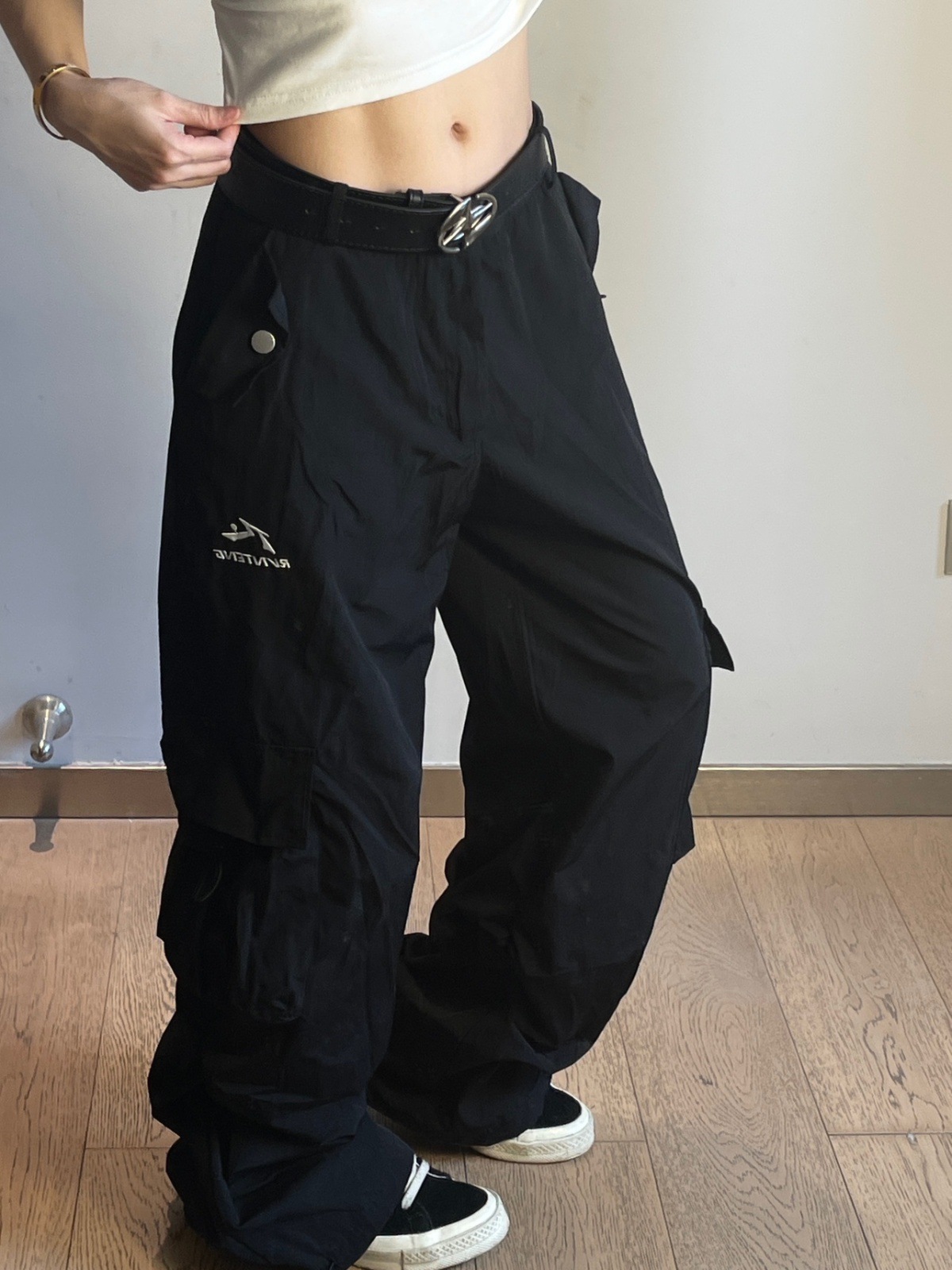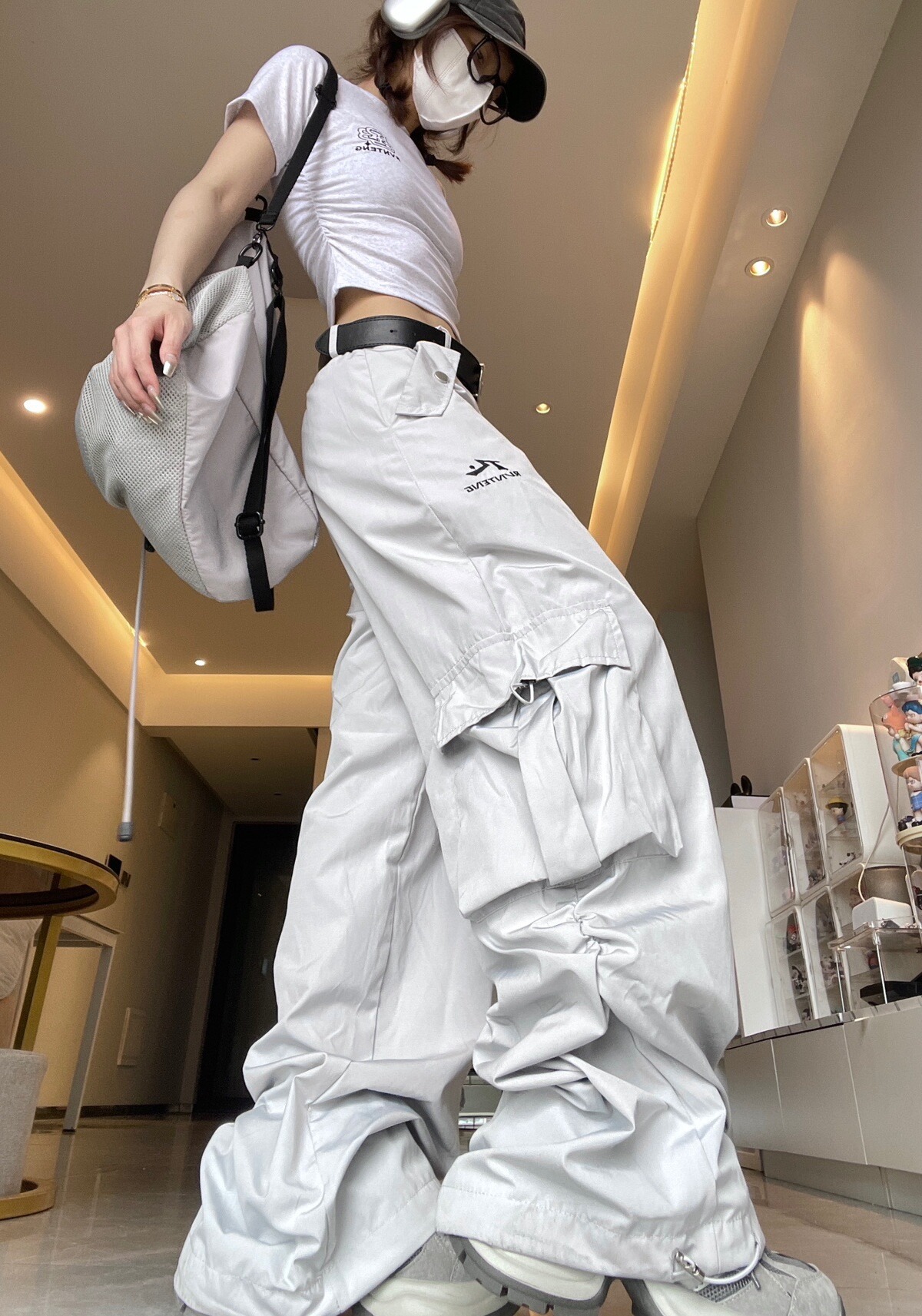 여성용 그레이 화이트 속건성 낙하산 충전 스포츠 다용도 작업복 봄, 가을 미국식 와이드 레그 루즈 힙합 바지스토어 가기