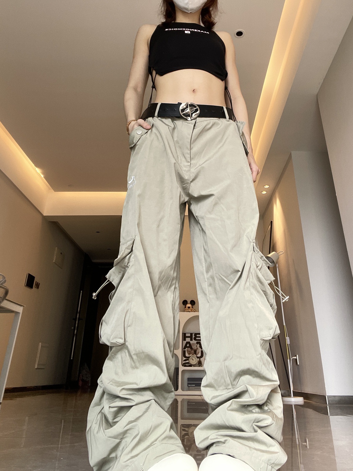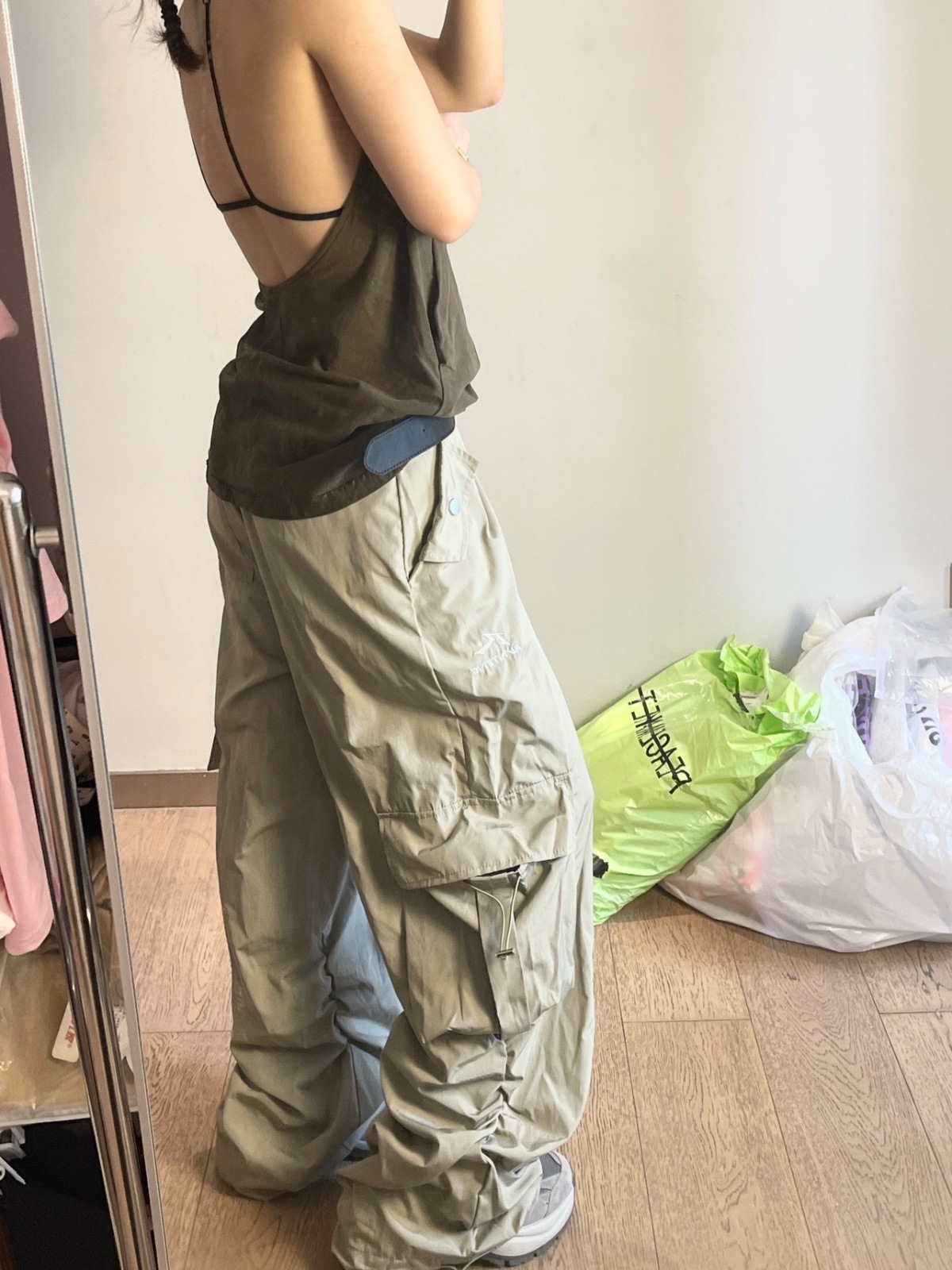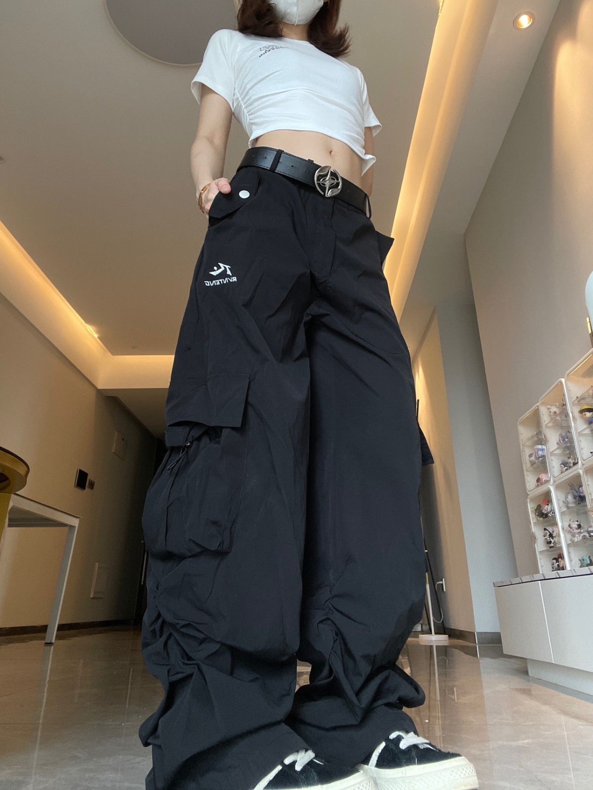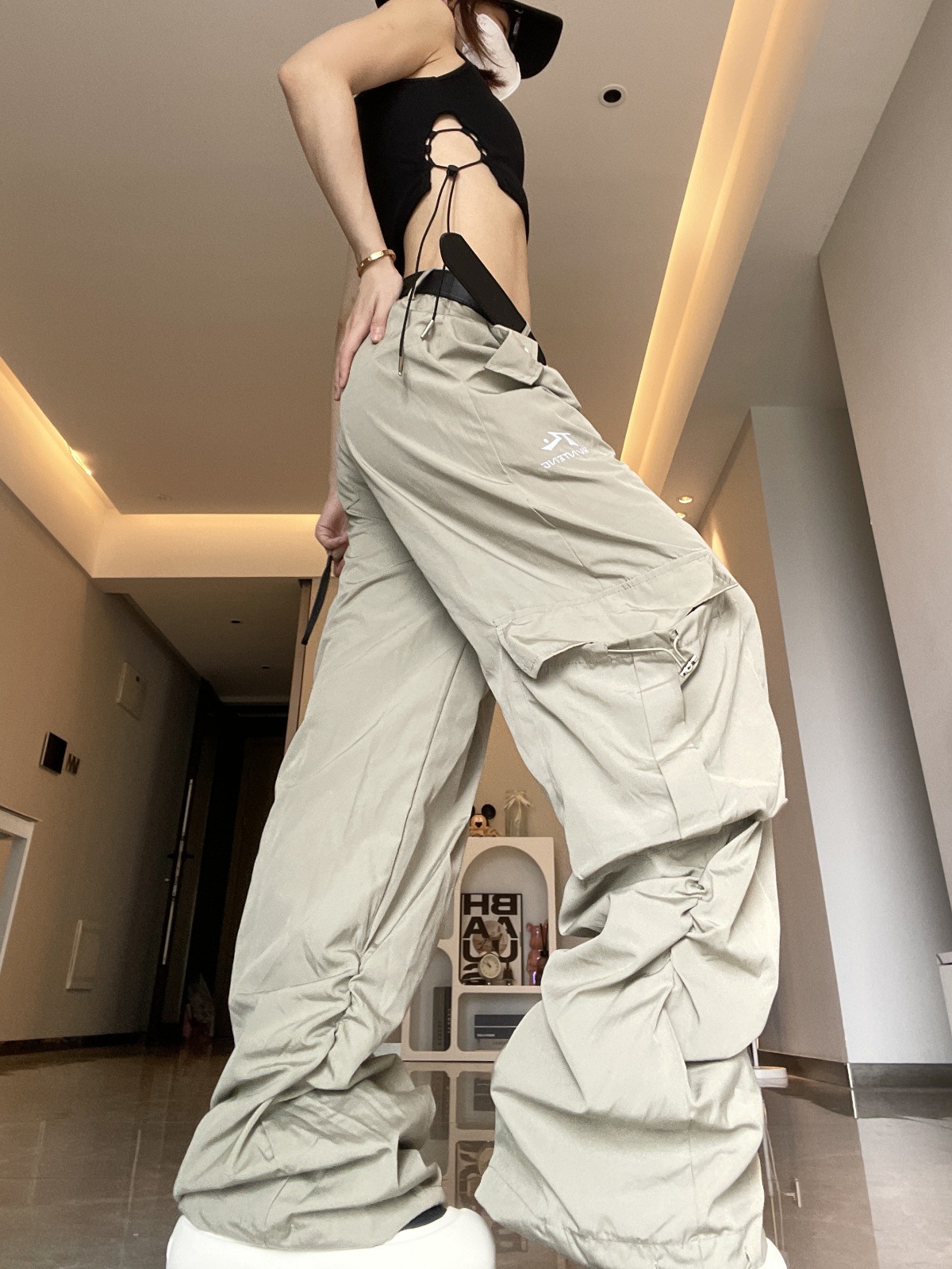 여성용 그레이 화이트 속건성 낙하산 충전 스포츠 다용도 작업복 봄, 가을 미국식 와이드 레그 루즈 힙합 바지스토어 가기