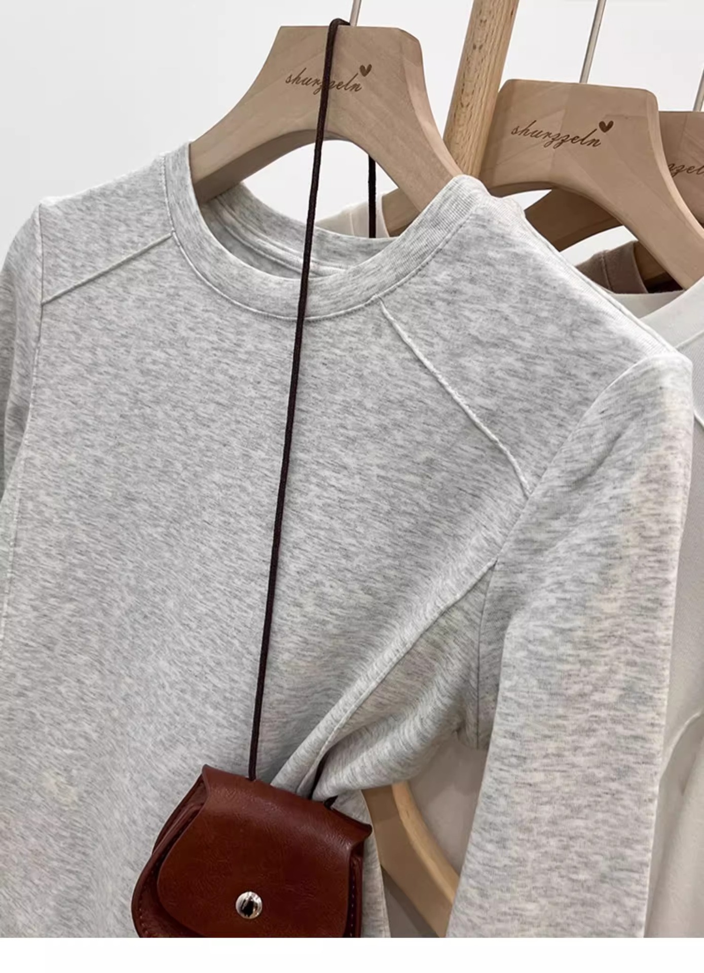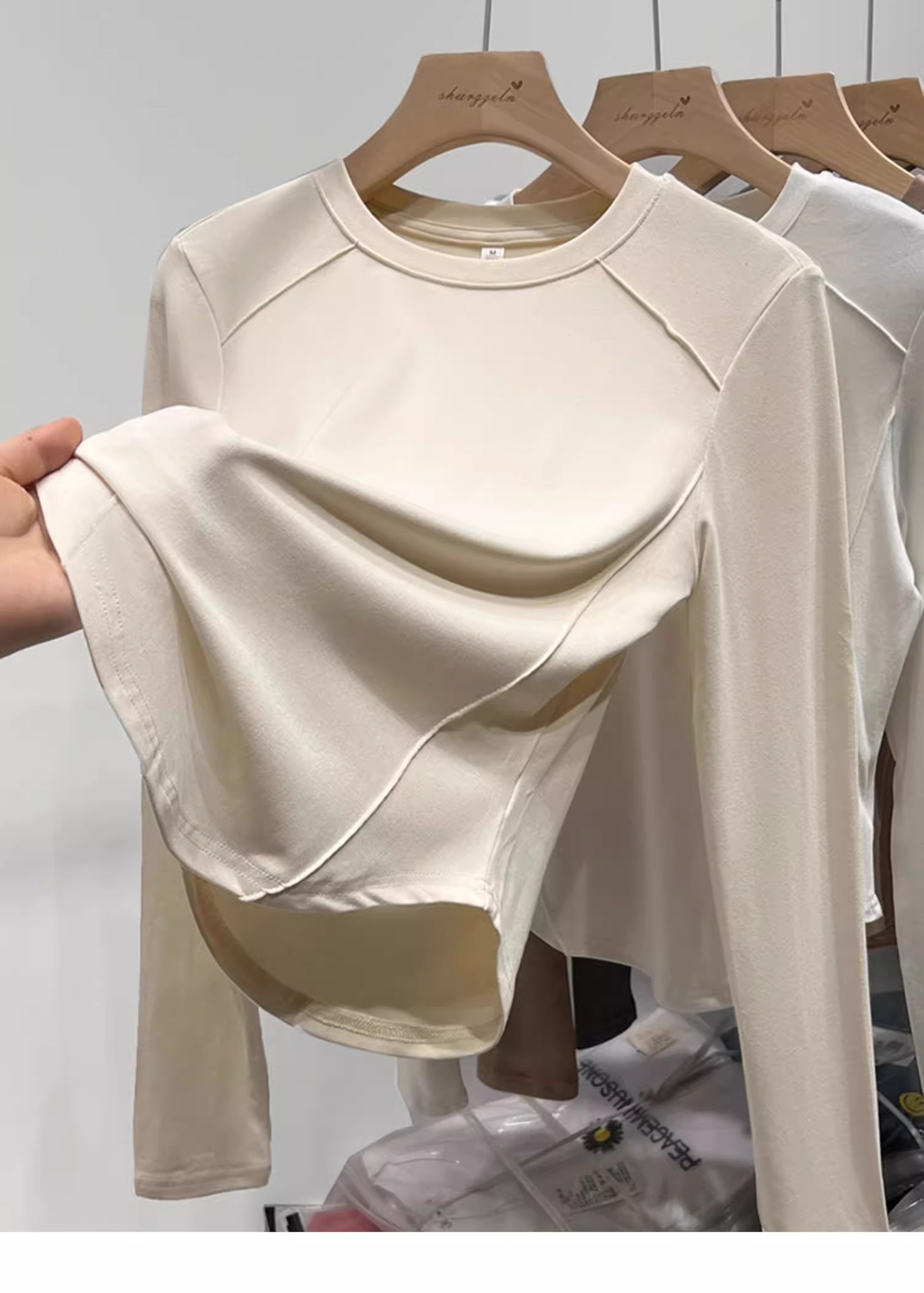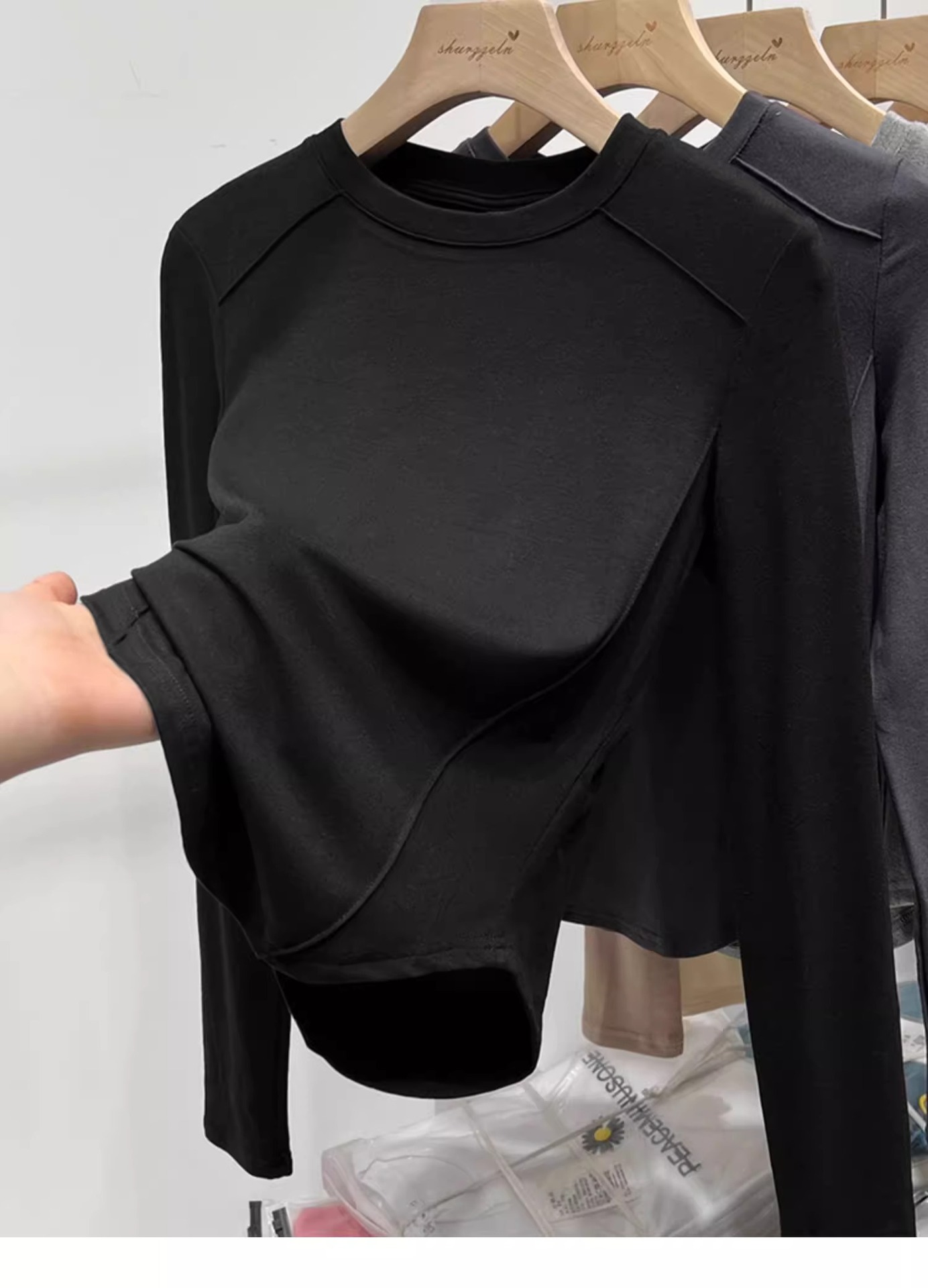 솔리드 컬러 오른쪽 어깨 곡선 밑단 긴팔 불규칙한 바닥 셔츠 티셔츠 여성용 봄, 가을 라운드 넥 이너 탑 트렌디스토어 가기