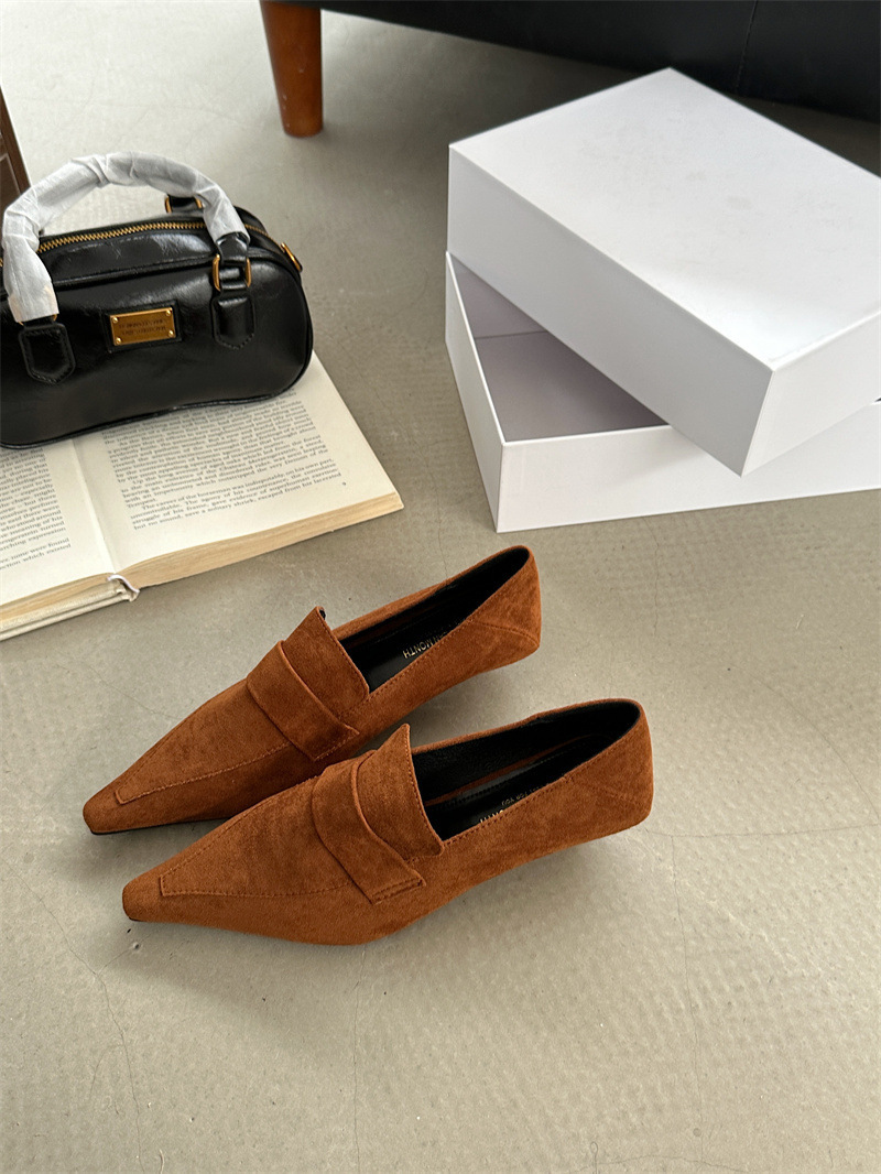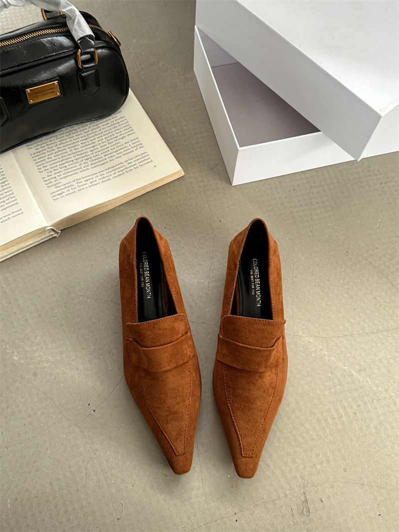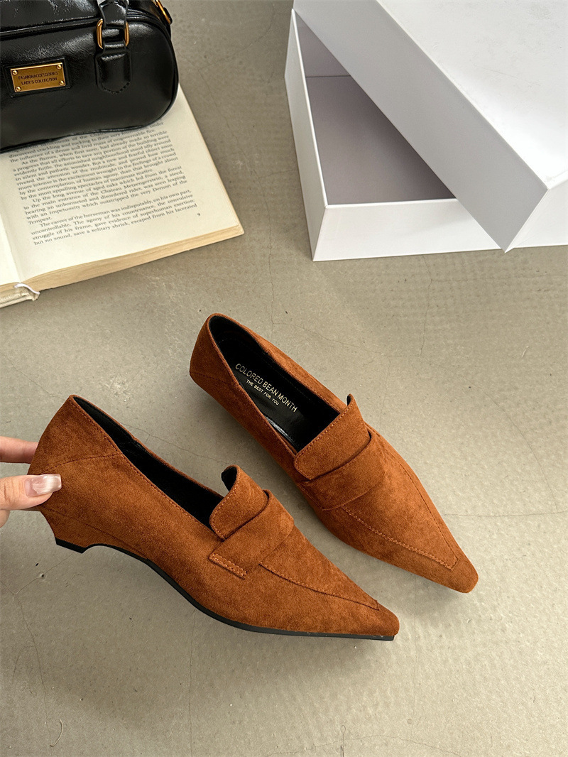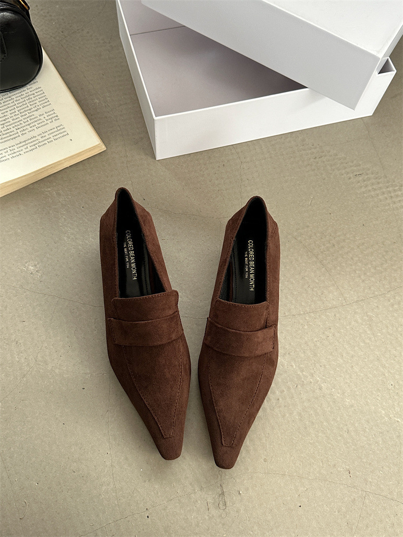 영국 로퍼 2025 새로운 뾰족한 스웨이드 레트로 다크 브라운 슬립 온 신발 여성 고양이 다큐멘터리 신발 여성