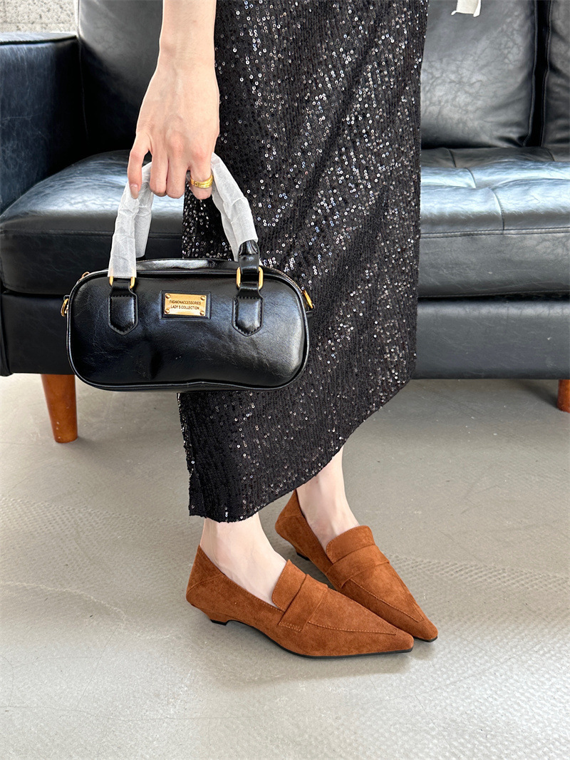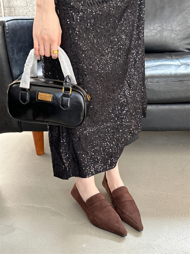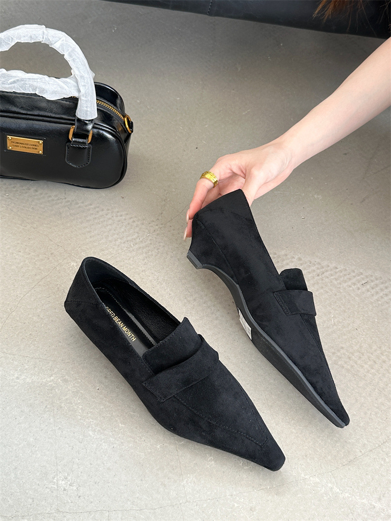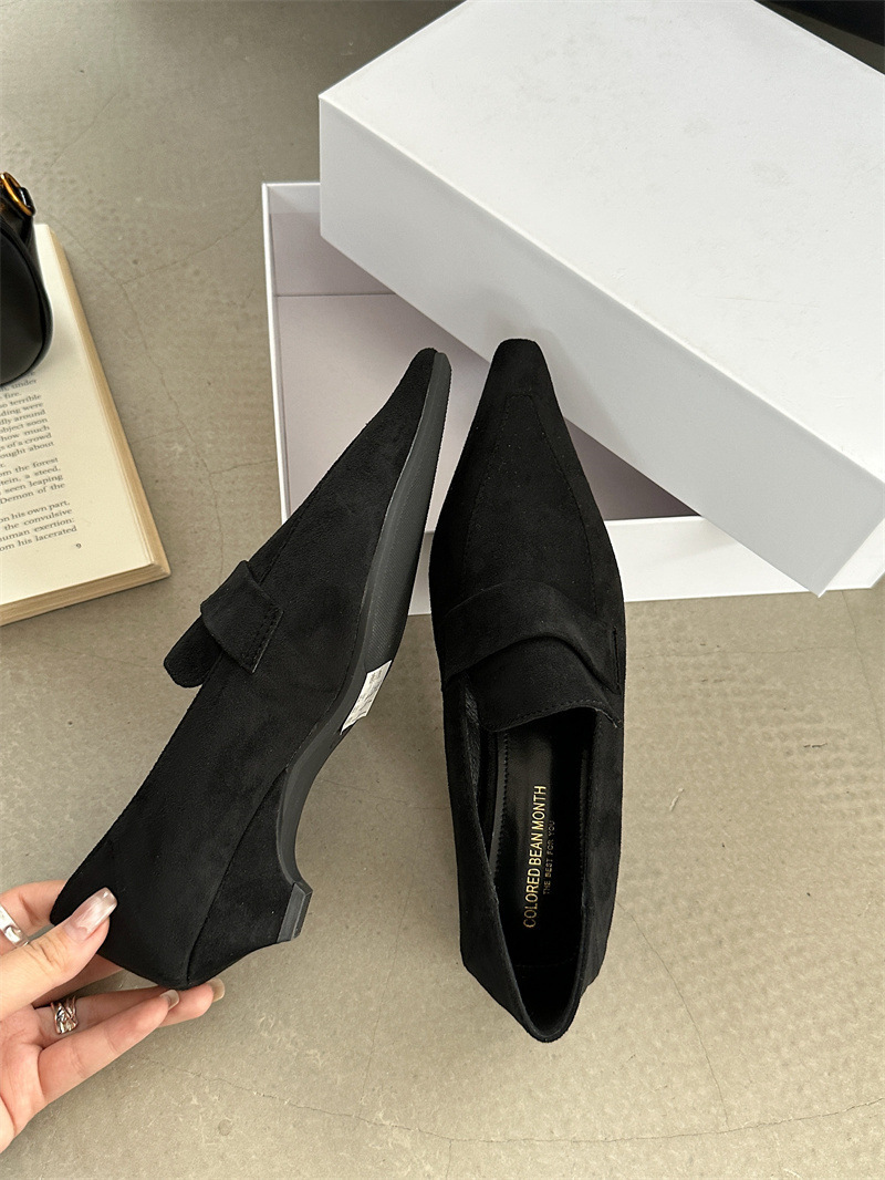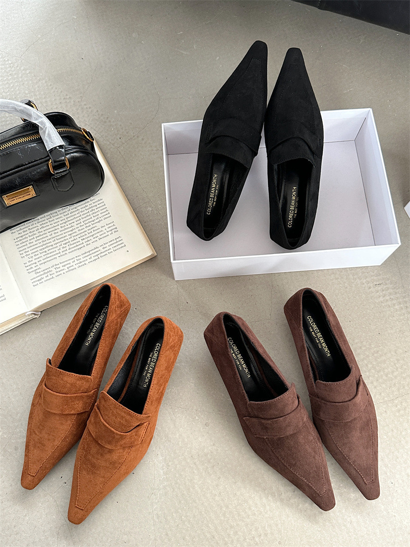 영국 로퍼 2025 새로운 뾰족한 스웨이드 레트로 다크 브라운 슬립 온 신발 여성 고양이 다큐멘터리 신발 여성