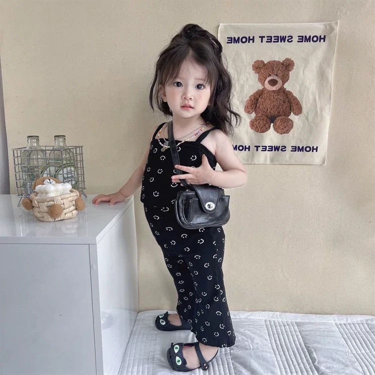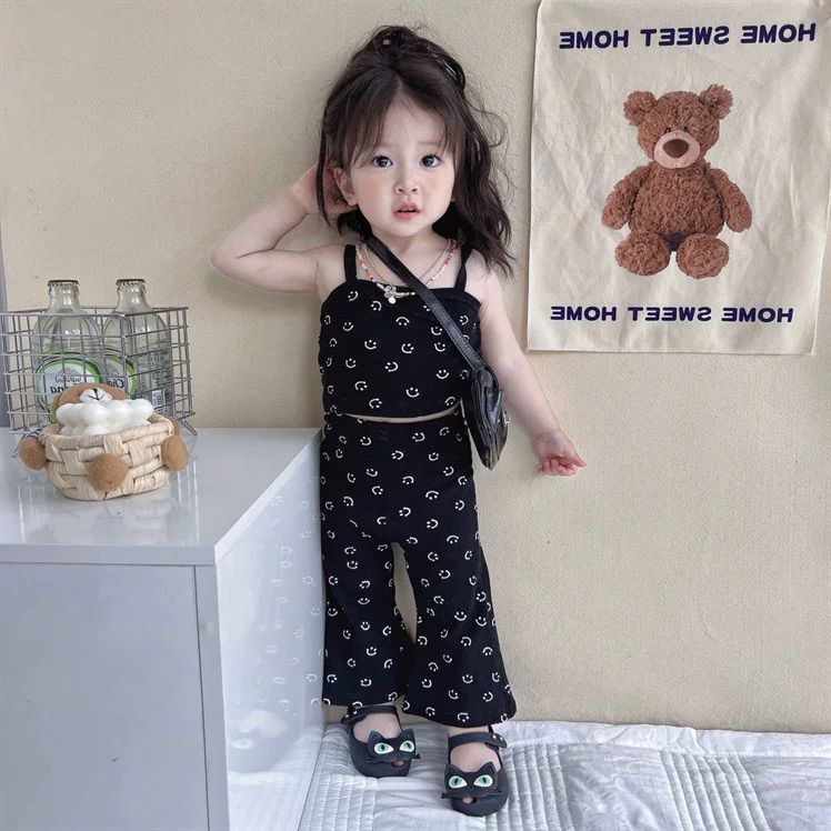 여름 소녀 세트 아기 세련된 어린이 성격 유행 대외 무역 한국 스타일 유행 스마일리 조끼 카미솔 플래 바지스토어 가기