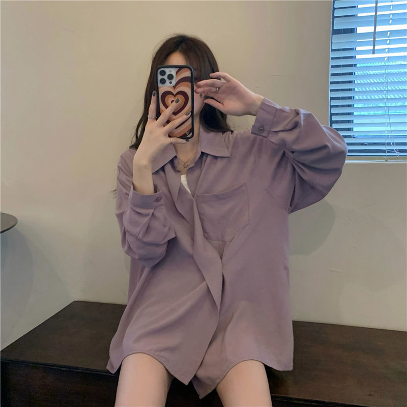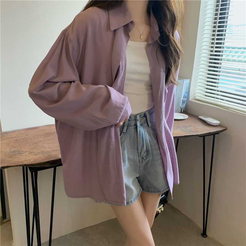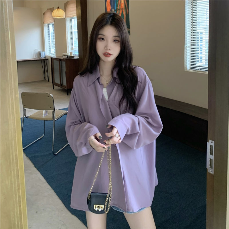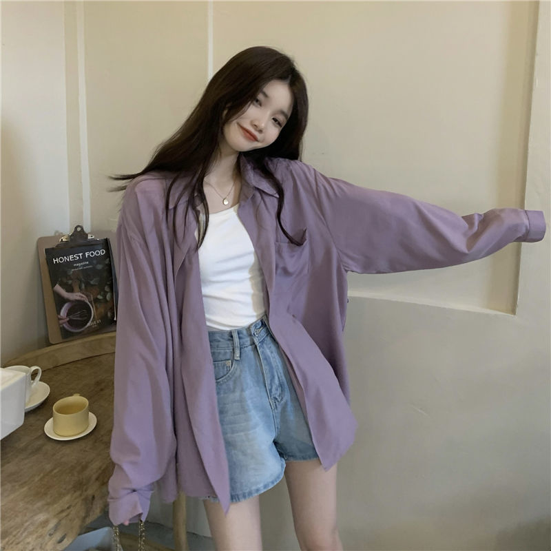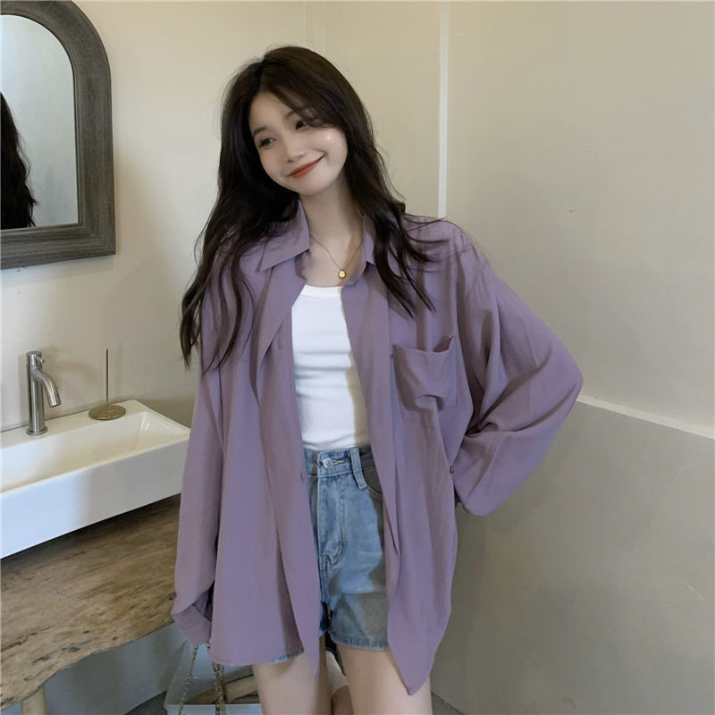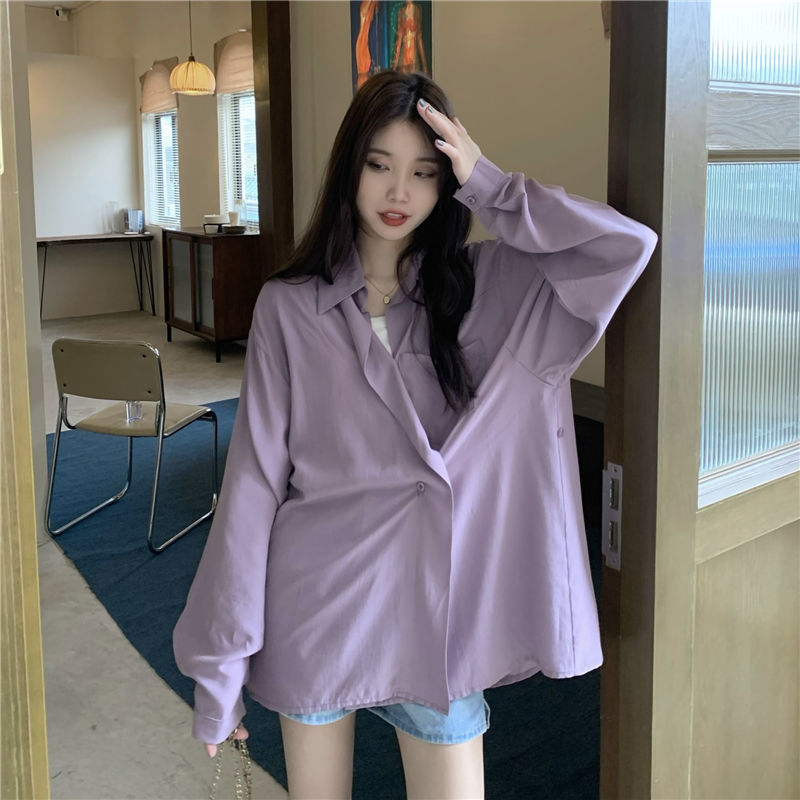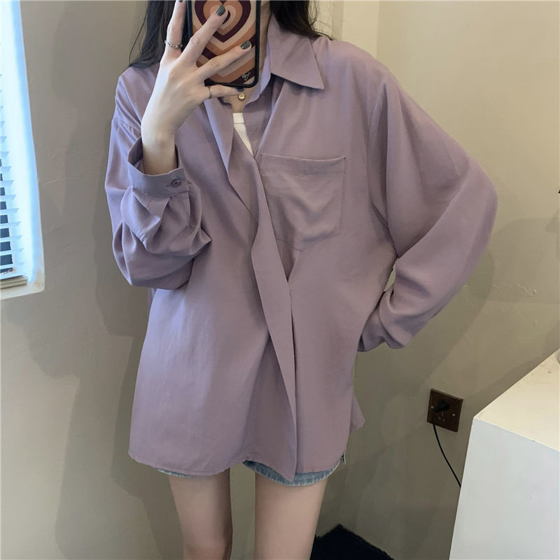 프랑스 보라색 선스크린 셔츠 가을 새로운 느슨한 틈새 디자인 긴팔 여성용 얇은 올 매치 칼라 셔츠스토어 가기