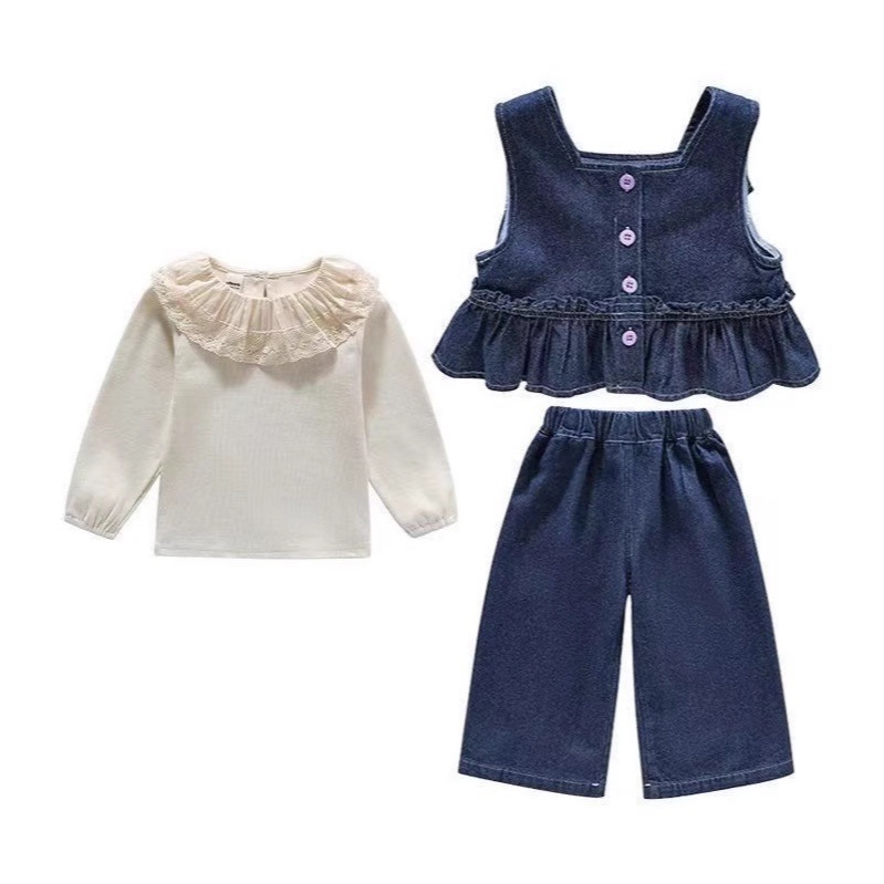 소녀의 봄 세트 어린이 2024 유행 서양식 3 피스 세트 아기 데님 한국 스타일 봄과 가을 새로운스토어 가기