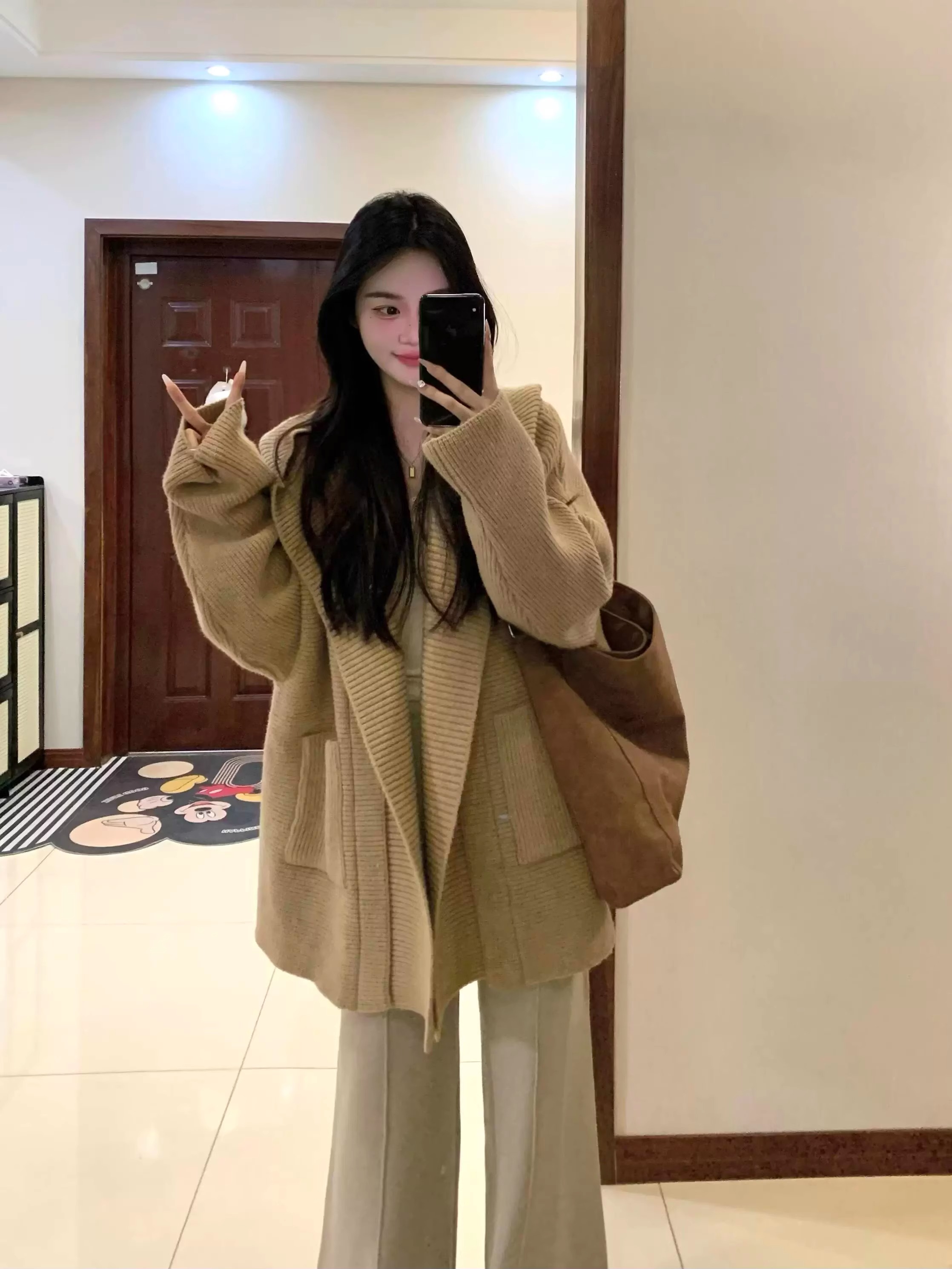 게으른 스타일 느슨한 캐주얼 니트 카디건 여성의 가을과 겨울 두꺼운 따뜻한 우아한 올 매치 중간 길이의 스웨터 코트 트렌디